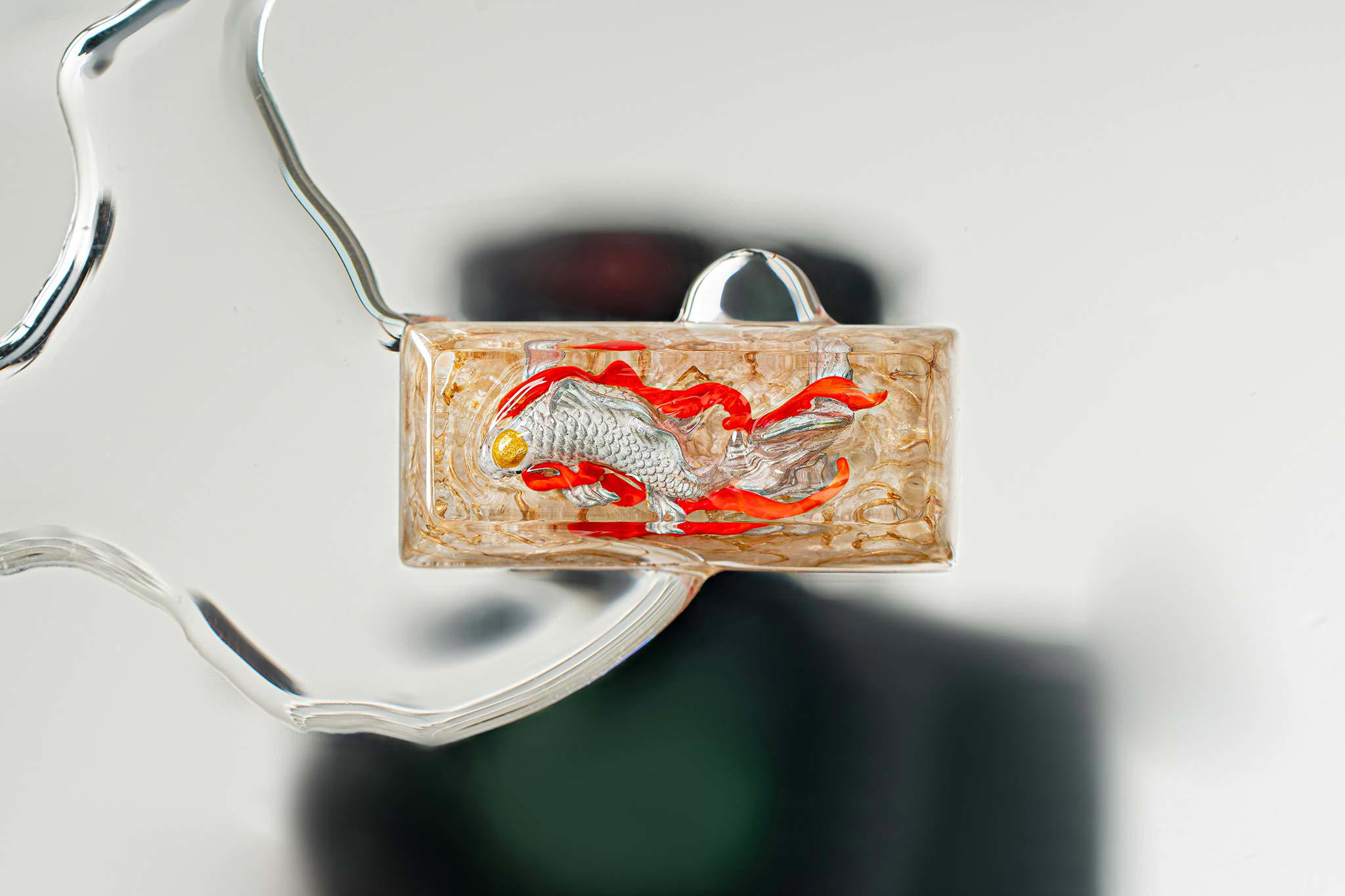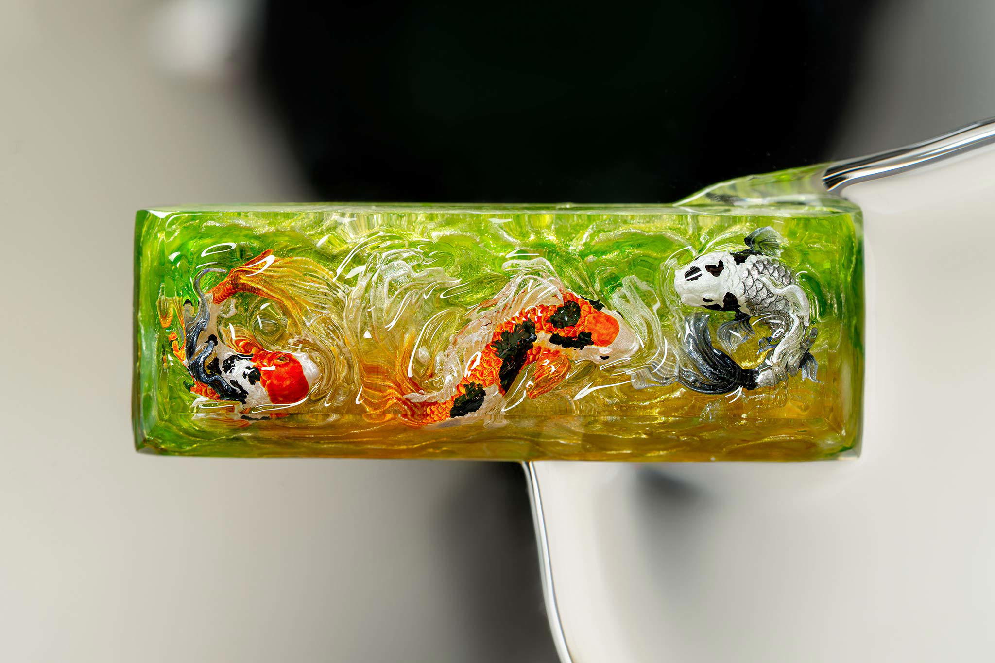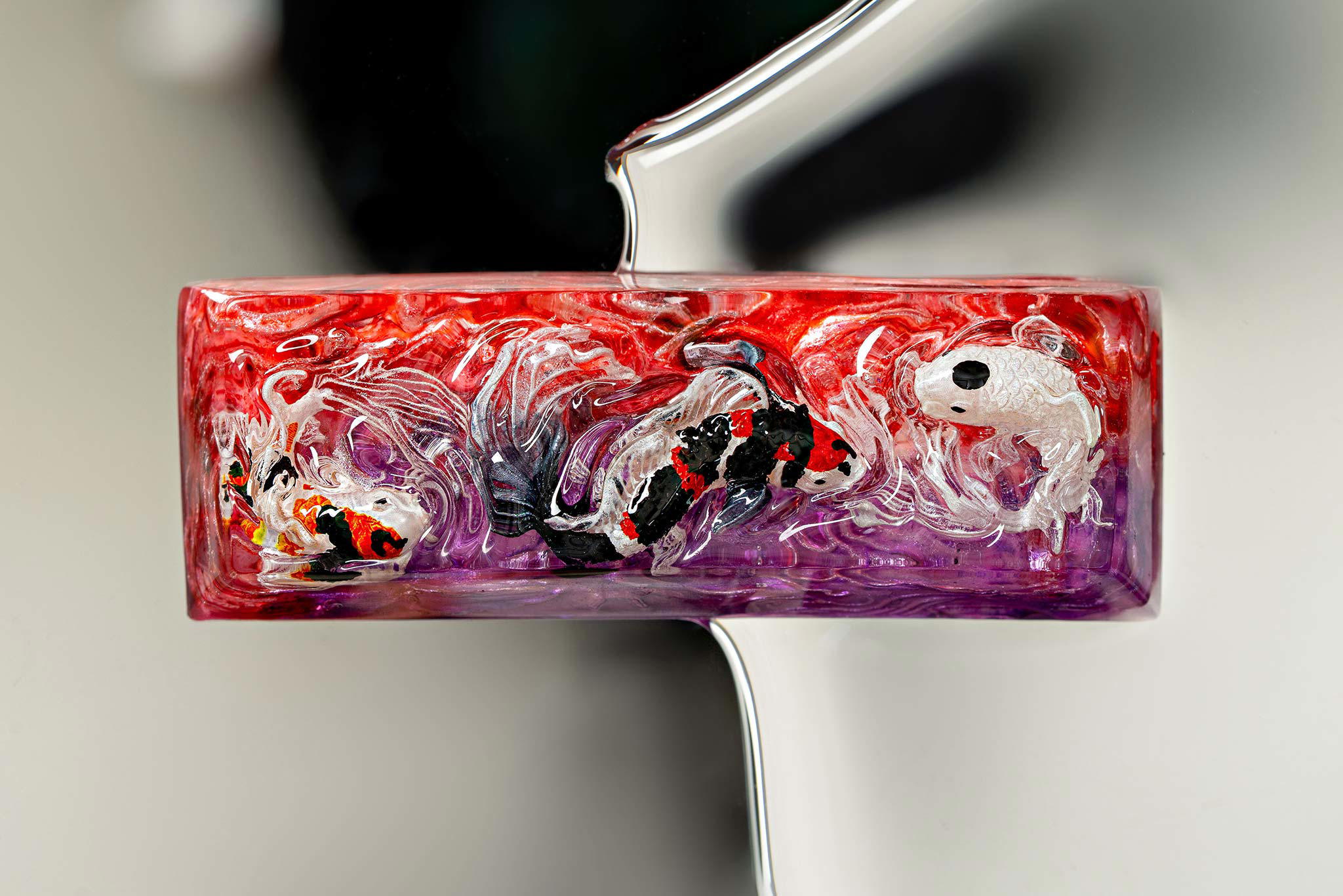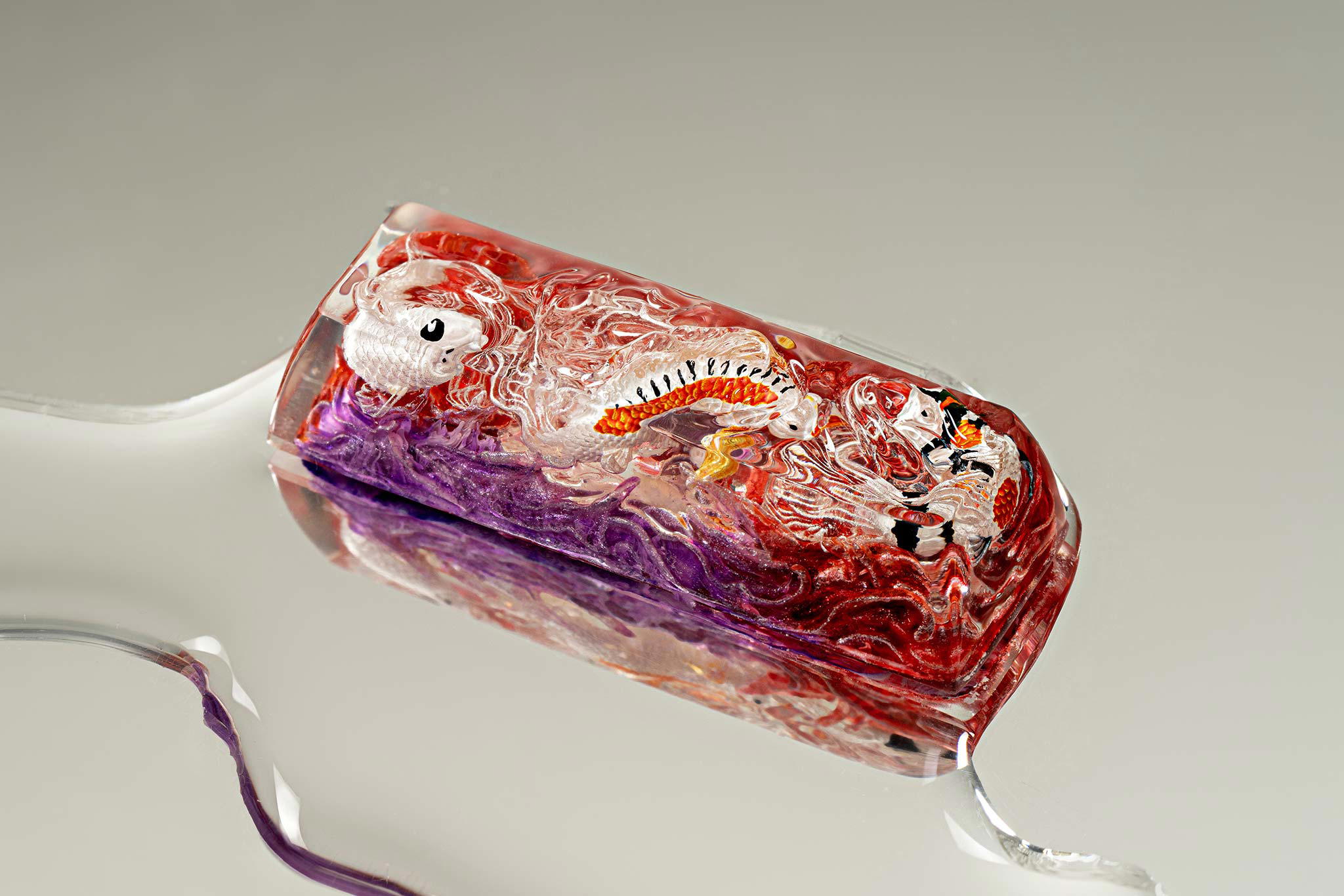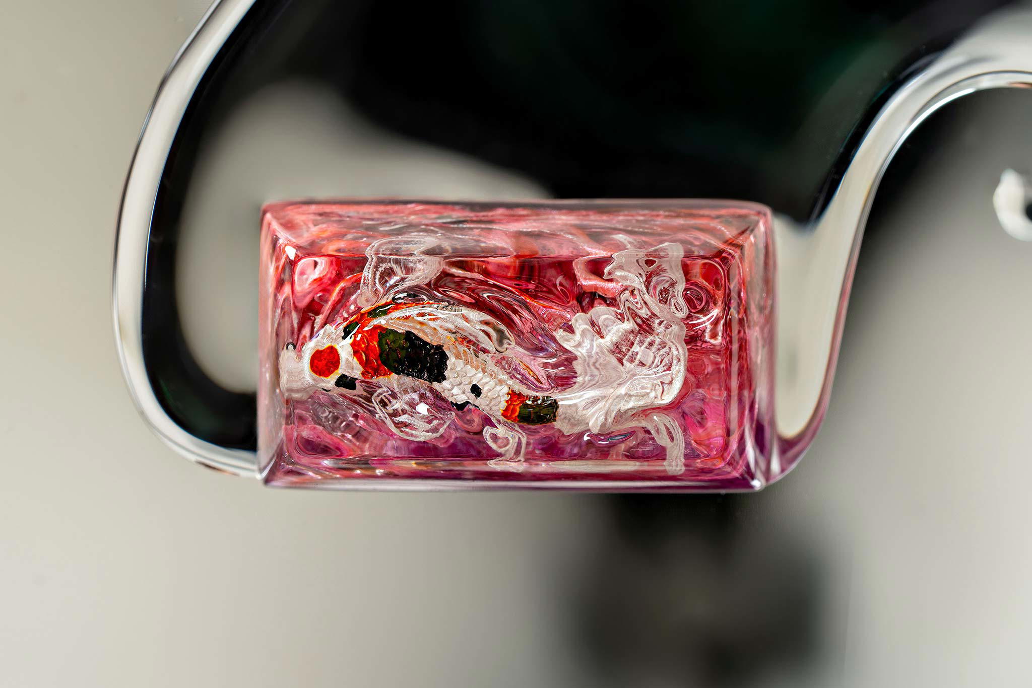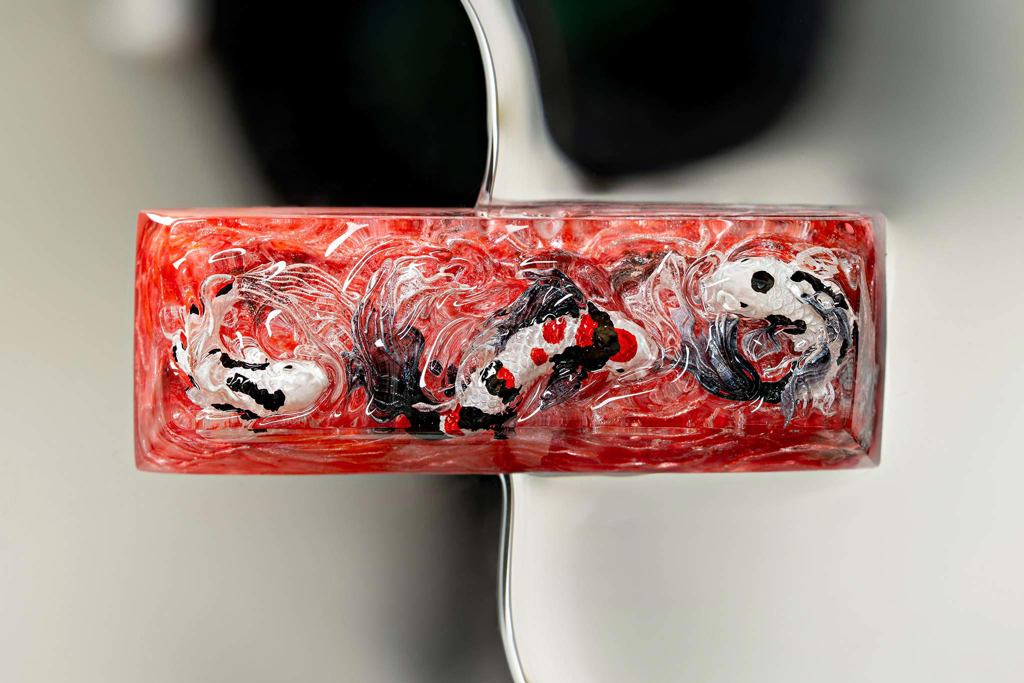 When the final layer of resin is poured, completely encasing the fish, it’s time to position the pre-formed water waves. This is the most crucial step, where “nature” and its “inhabitants” blend into a complete artwork. The most challenging part is handling the protruding portions of the Koi fish – they remain within the resin but rise above the keycap surface with “water” surrounding them, protecting the fish while ensuring daily usability and maintaining consistent aesthetics throughout. But the journey isn’t over yet – we still need to wait another 24 hours for the resin to fully solidify.
