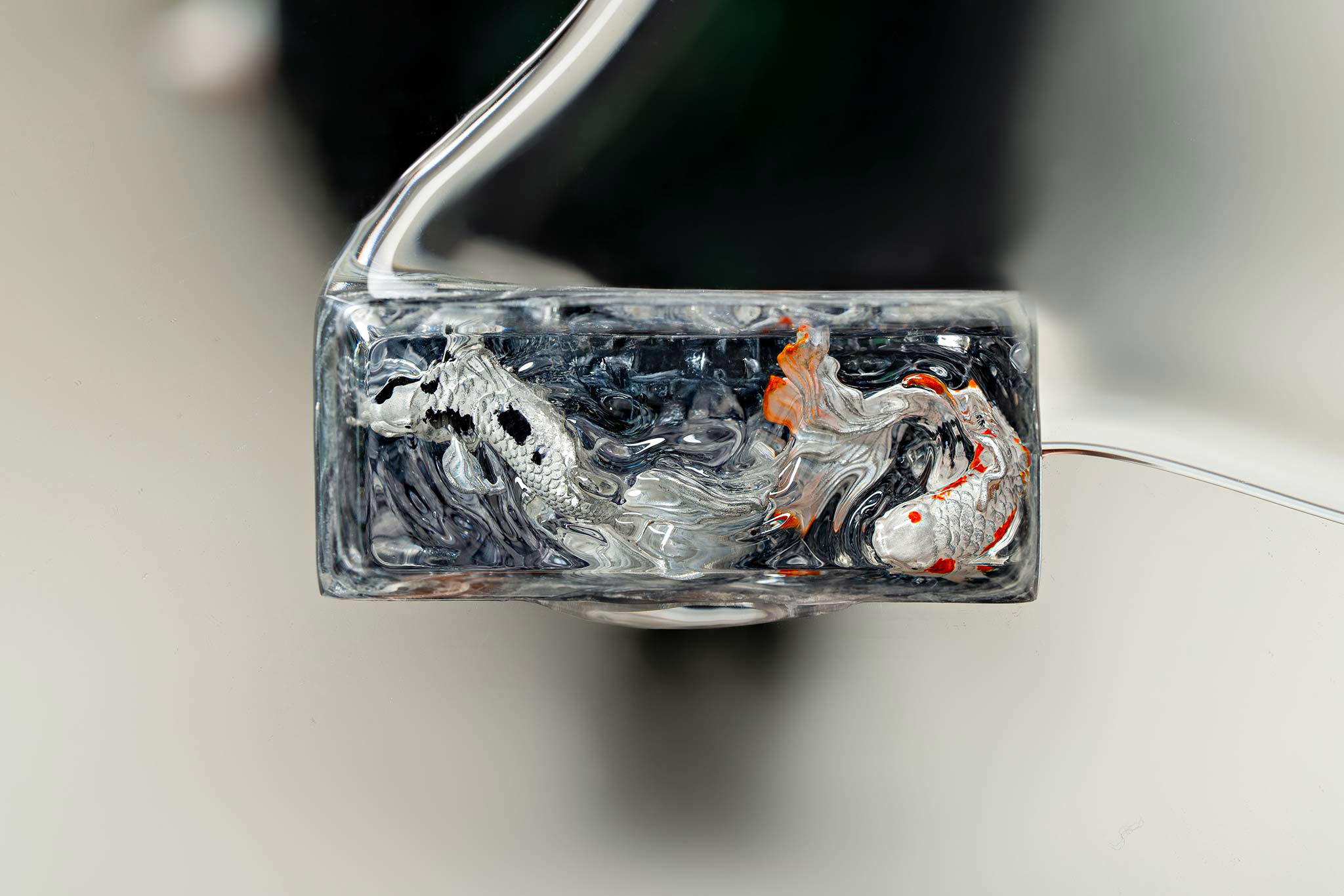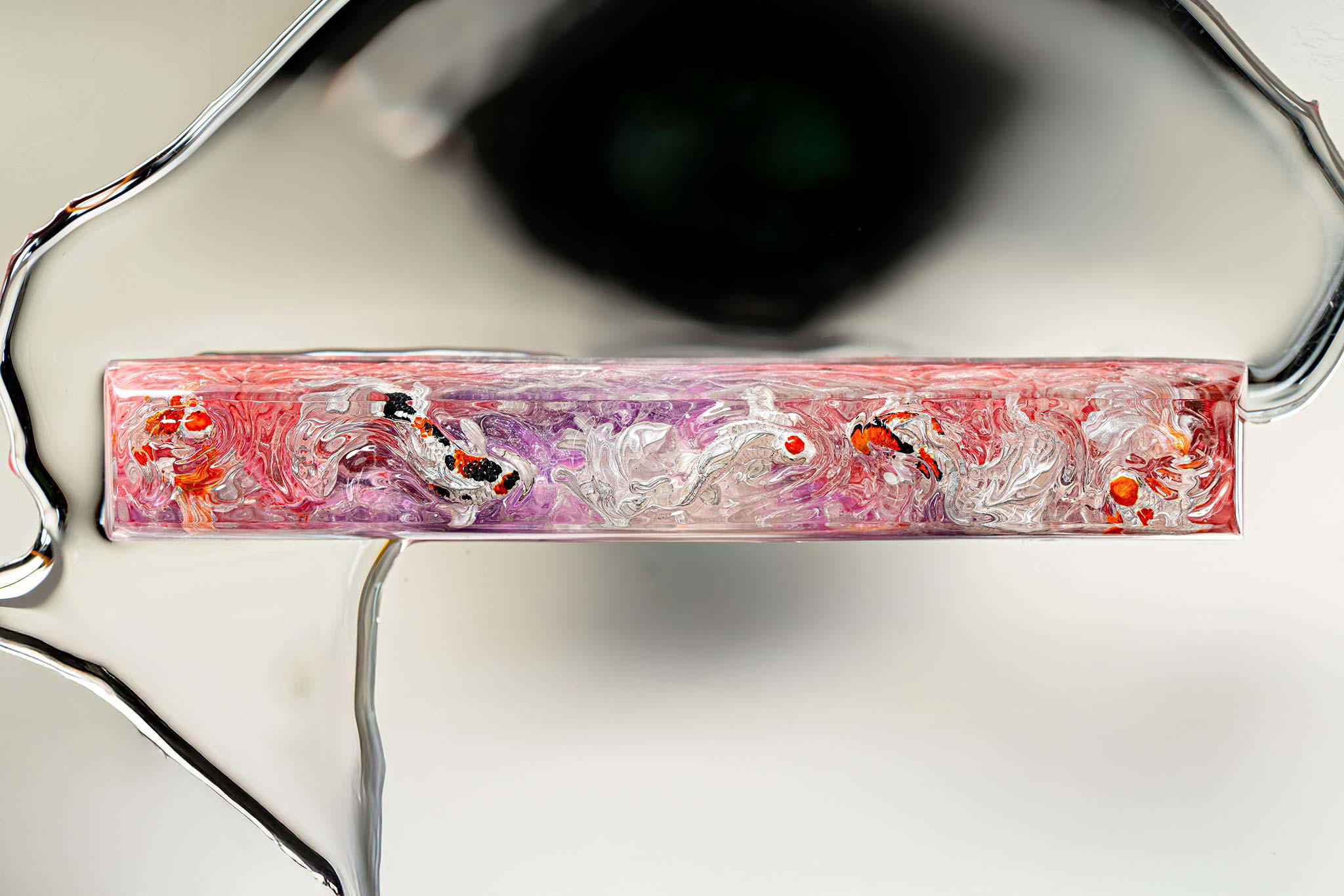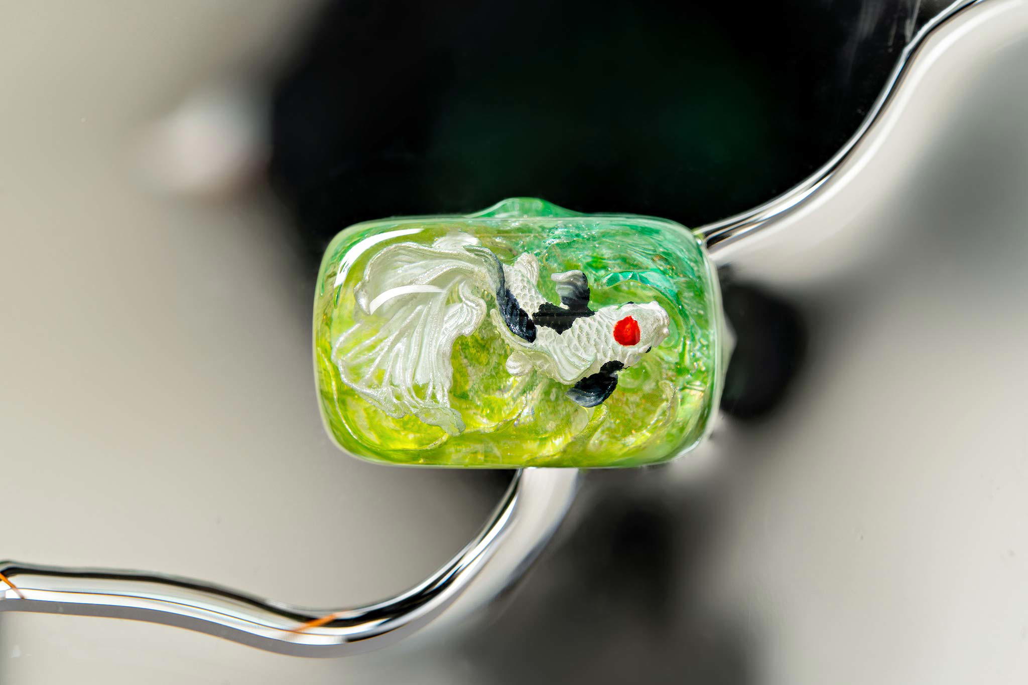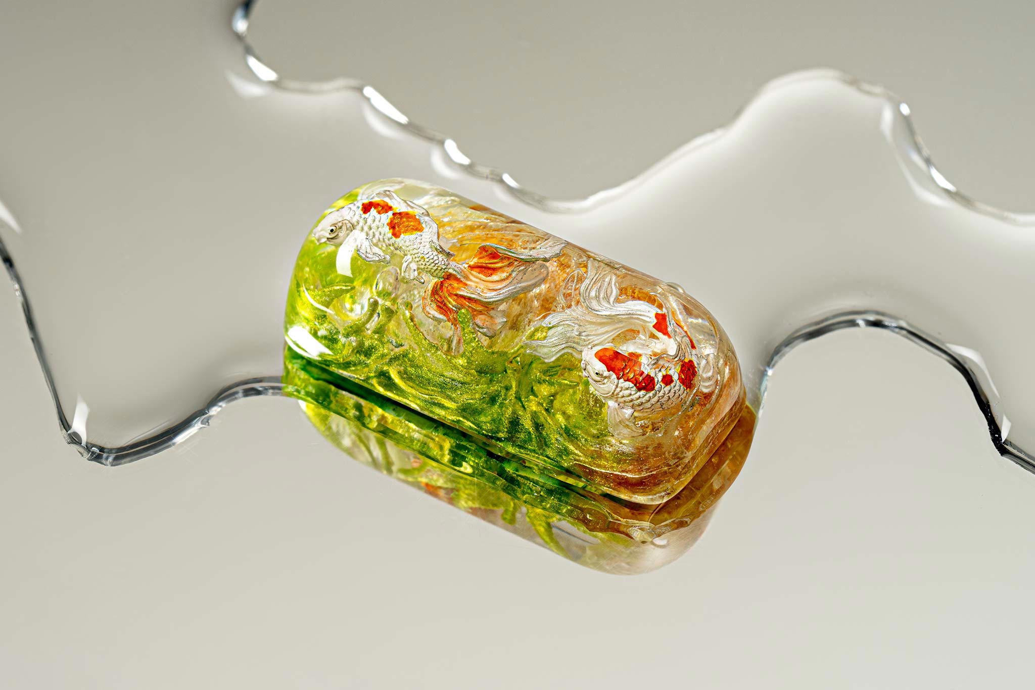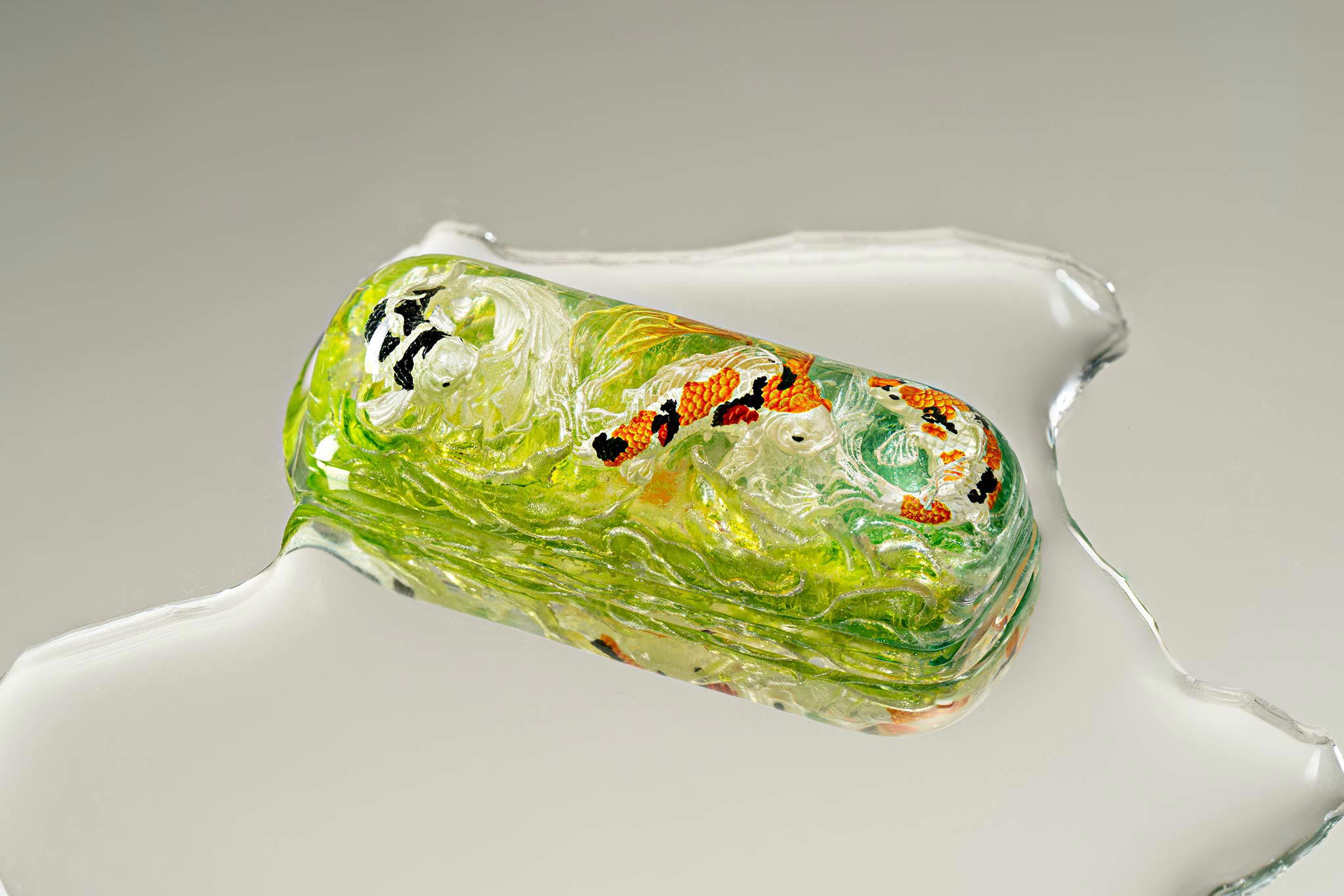 When the final layer of resin is poured, completely encasing the fish, it’s time to position the pre-formed water waves. This is the most crucial step, where “nature” and its “inhabitants” blend into a complete artwork. The most challenging part is handling the protruding portions of the Koi fish – they remain within the resin but rise above the keycap surface with “water” surrounding them, protecting the fish while ensuring daily usability and maintaining consistent aesthetics throughout. But the journey isn’t over yet – we still need to wait another 24 hours for the resin to fully solidify.
