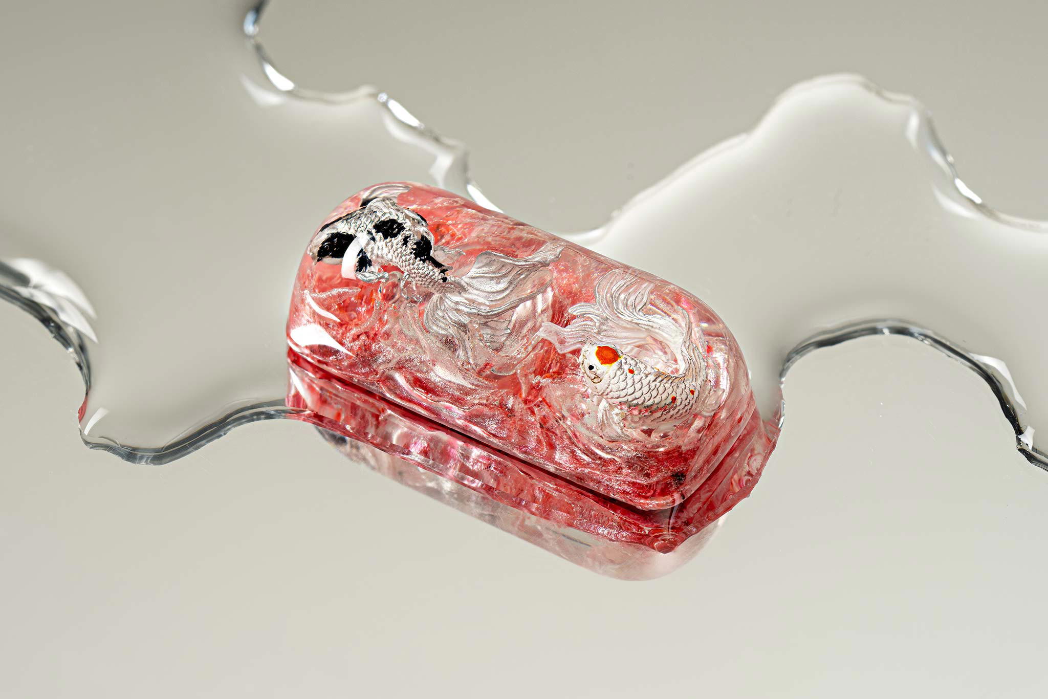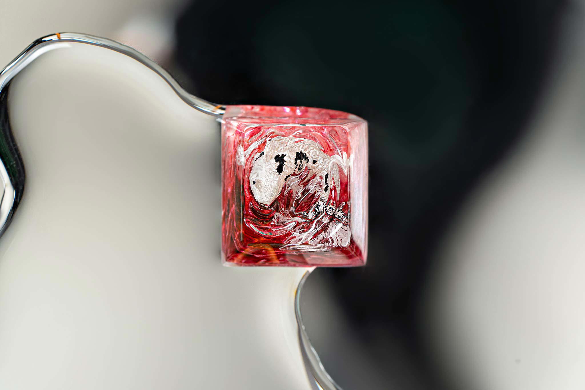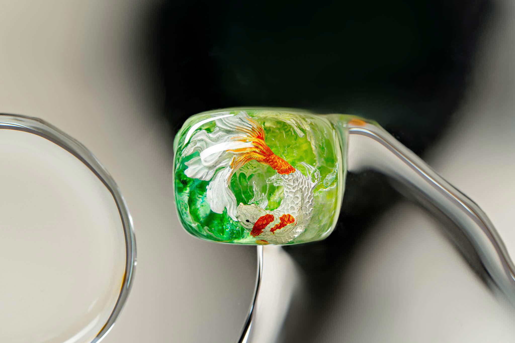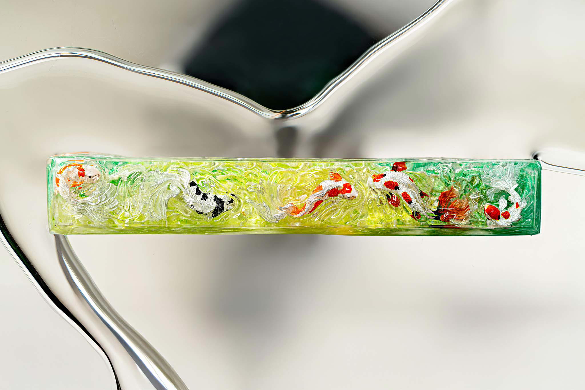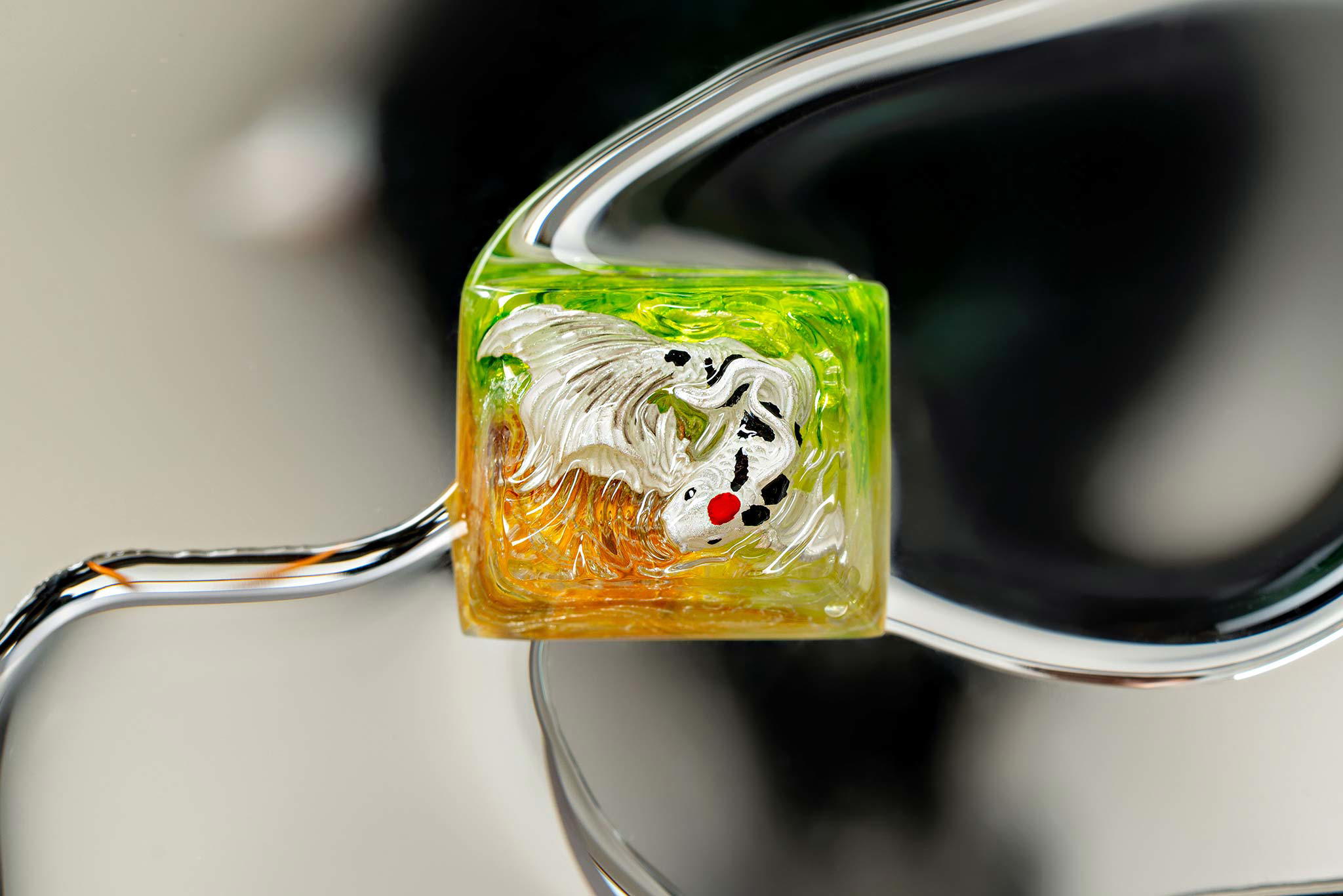 When the final layer of resin is poured, completely encasing the fish, it’s time to position the pre-formed water waves. This is the most crucial step, where “nature” and its “inhabitants” blend into a complete artwork. The most challenging part is handling the protruding portions of the Koi fish – they remain within the resin but rise above the keycap surface with “water” surrounding them, protecting the fish while ensuring daily usability and maintaining consistent aesthetics throughout. But the journey isn’t over yet – we still need to wait another 24 hours for the resin to fully solidify.