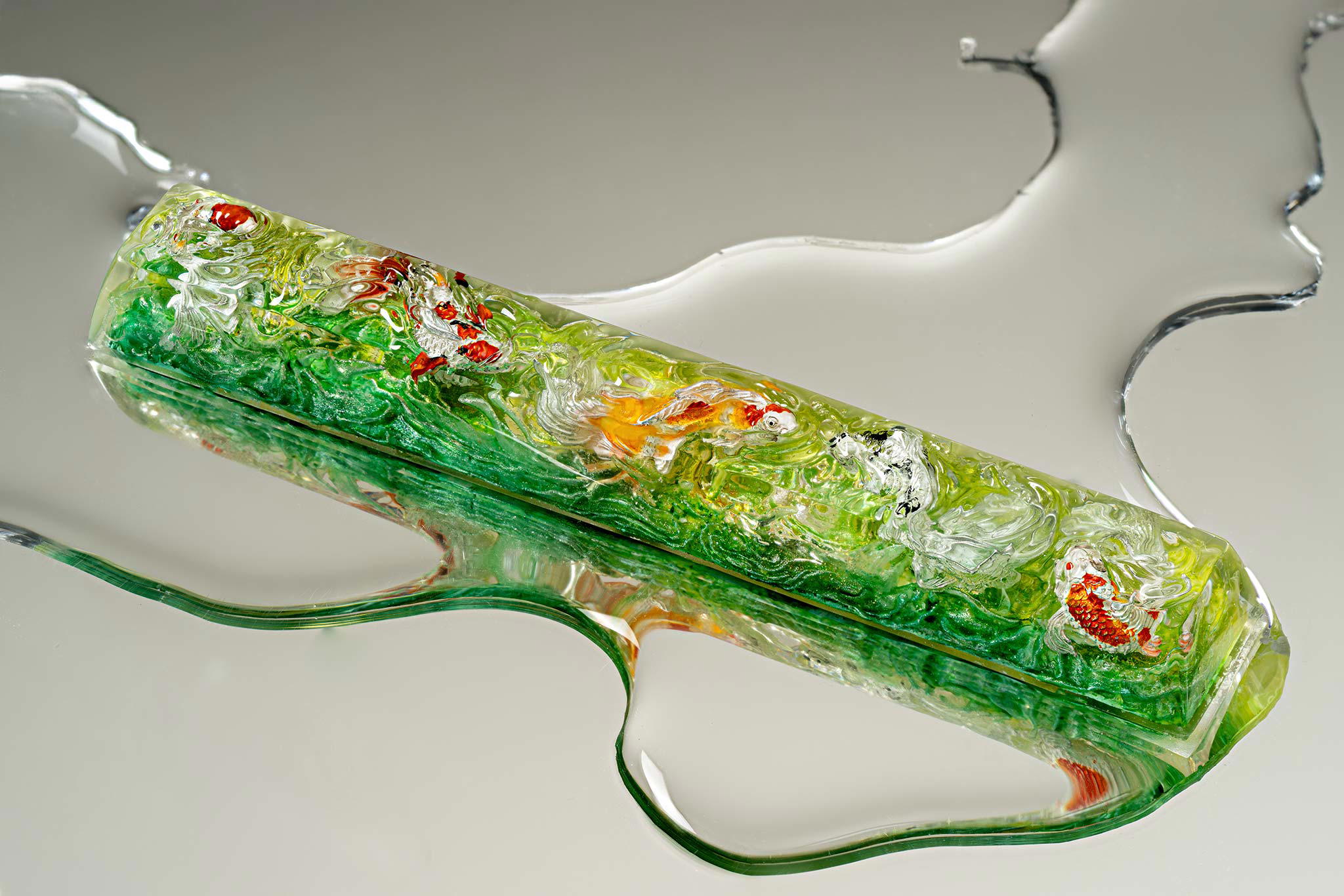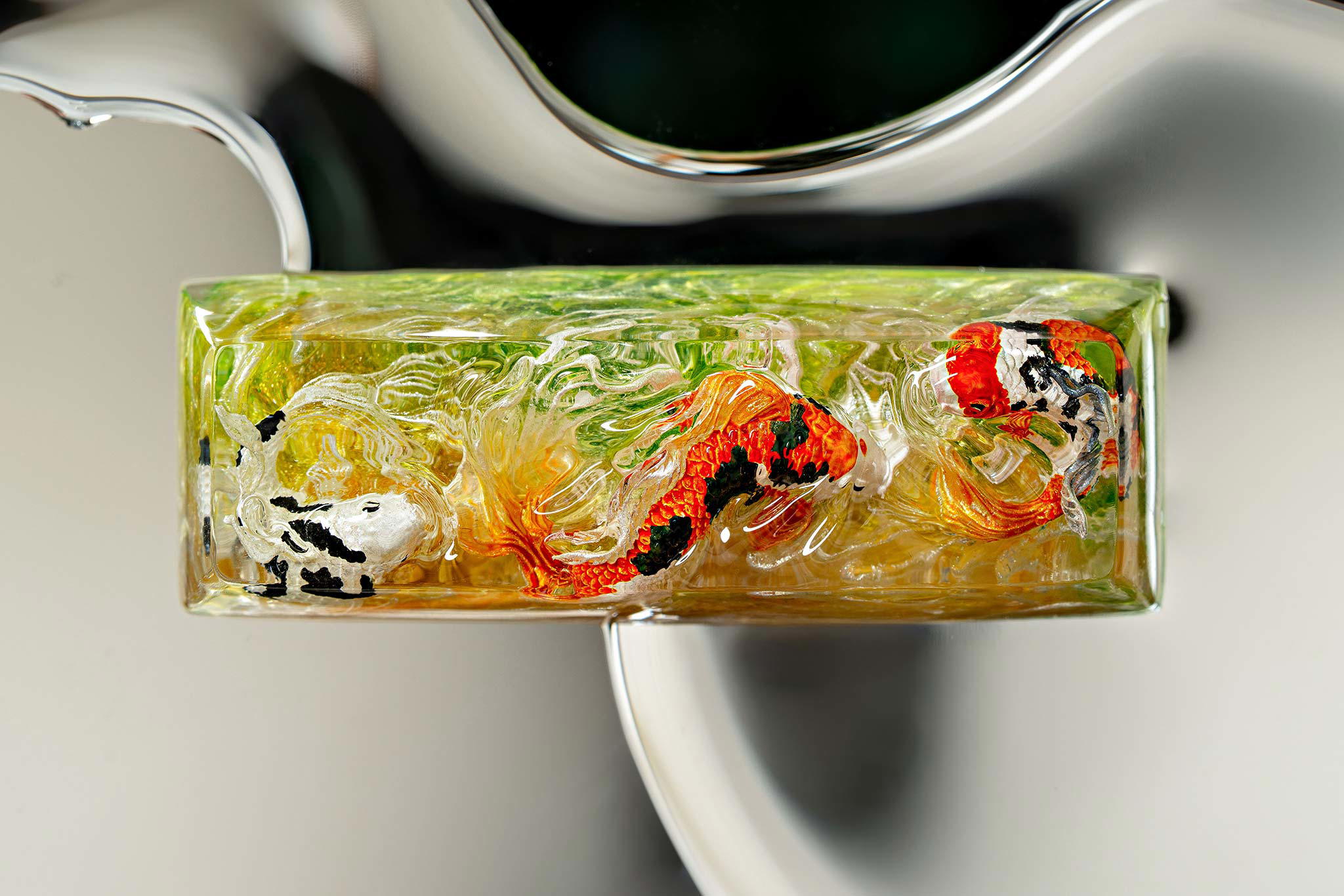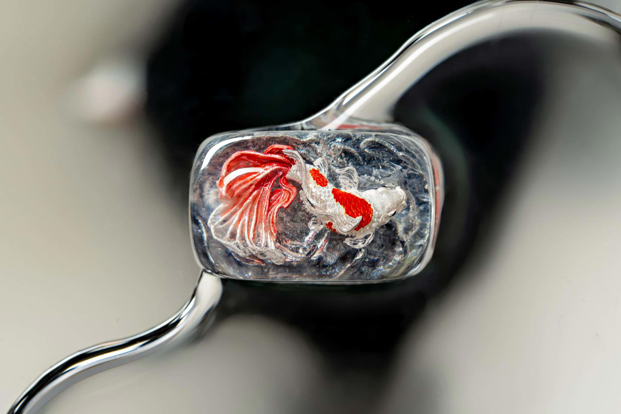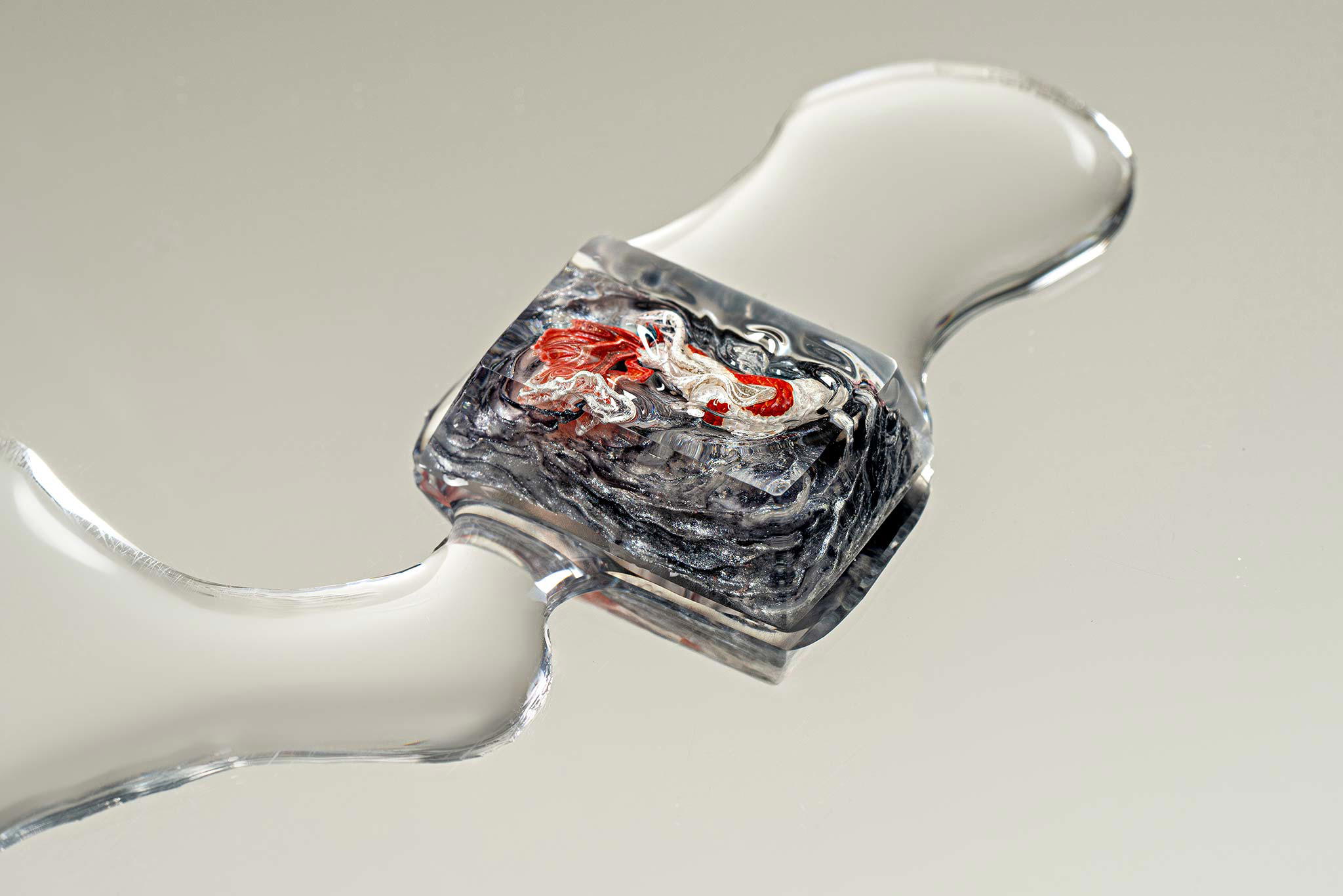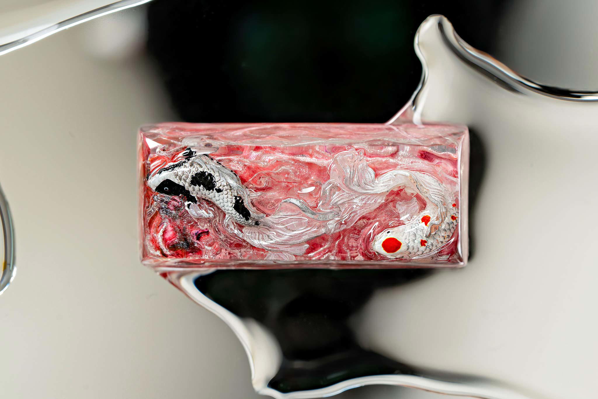 When the final layer of resin is poured, completely encasing the fish, it’s time to position the pre-formed water waves. This is the most crucial step, where “nature” and its “inhabitants” blend into a complete artwork. The most challenging part is handling the protruding portions of the Koi fish – they remain within the resin but rise above the keycap surface with “water” surrounding them, protecting the fish while ensuring daily usability and maintaining consistent aesthetics throughout. But the journey isn’t over yet – we still need to wait another 24 hours for the resin to fully solidify.