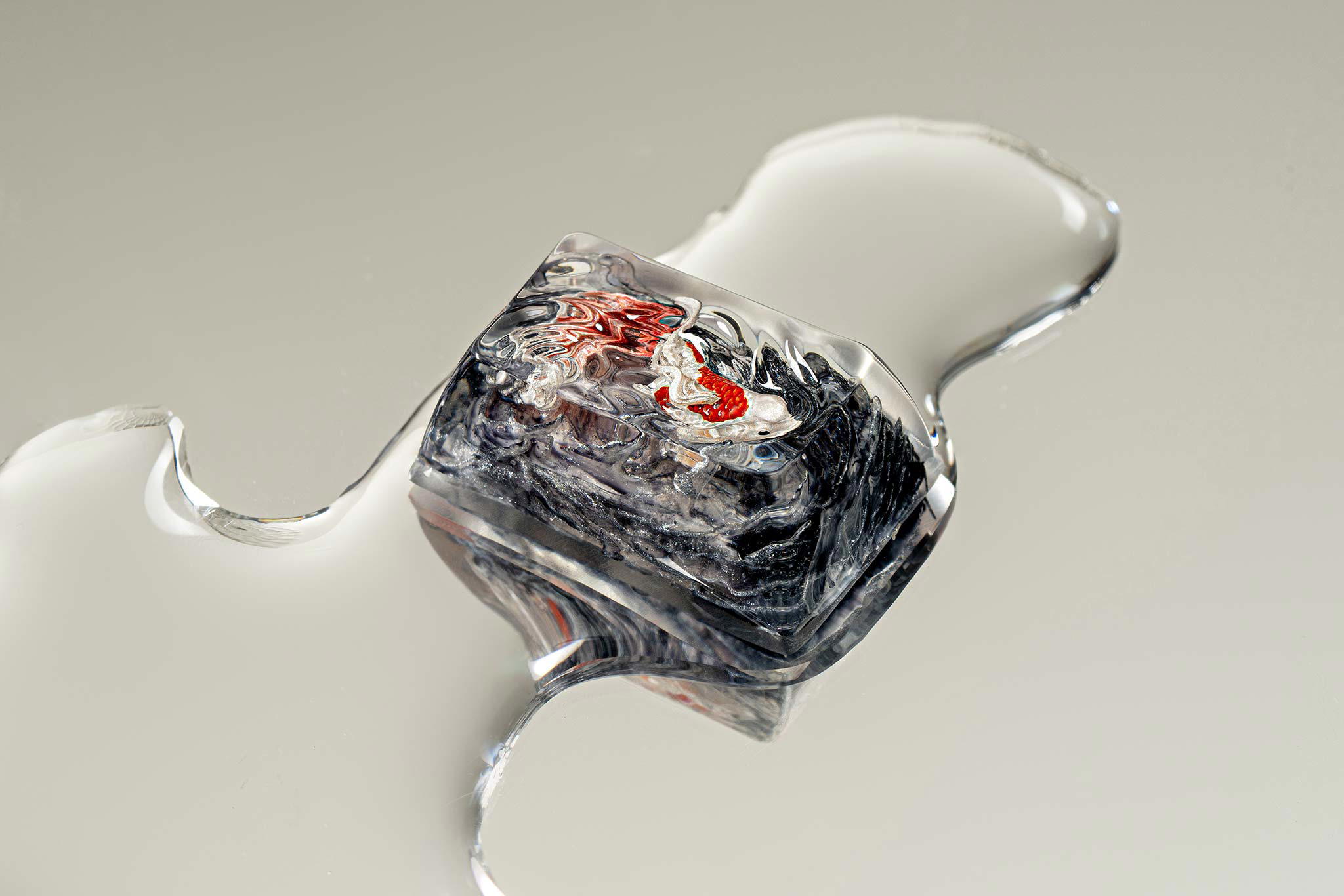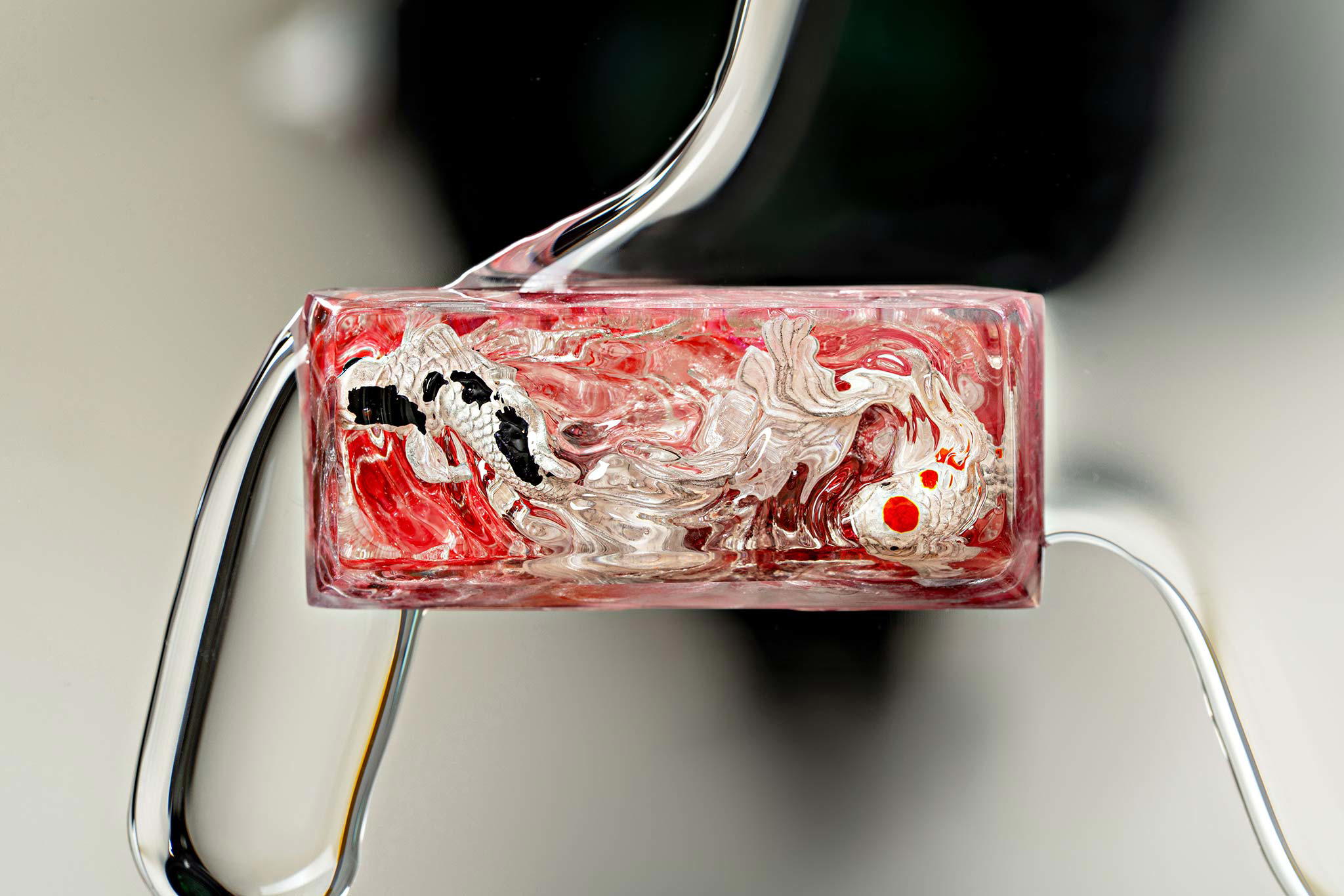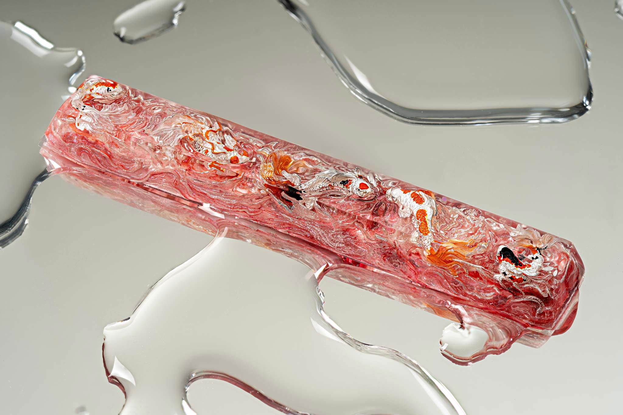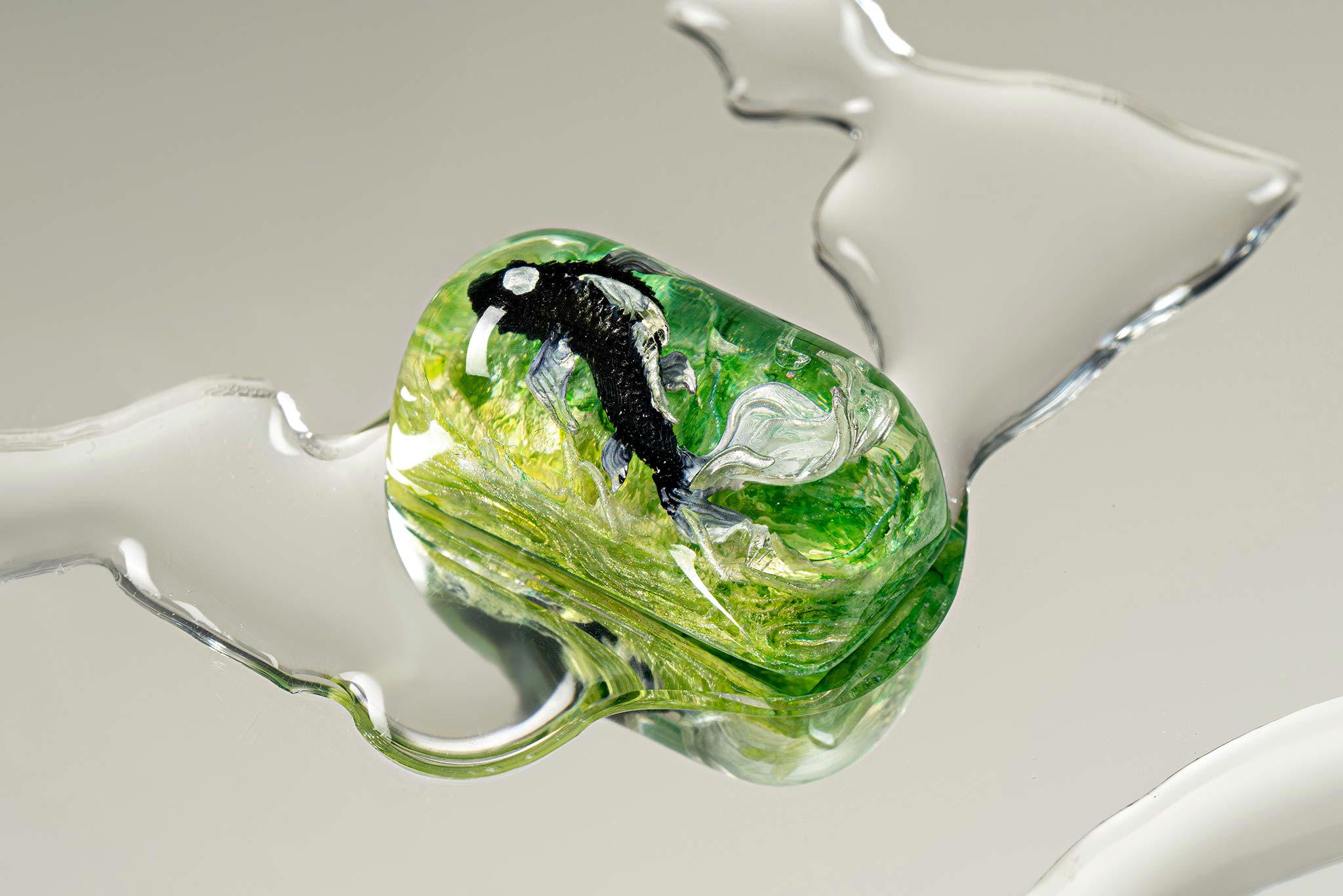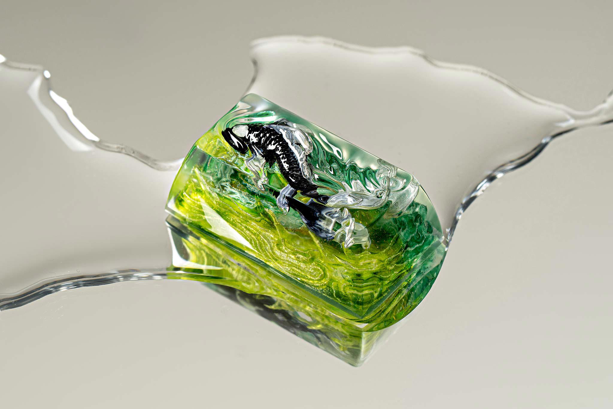 When the final layer of resin is poured, completely encasing the fish, it’s time to position the pre-formed water waves. This is the most crucial step, where “nature” and its “inhabitants” blend into a complete artwork. The most challenging part is handling the protruding portions of the Koi fish – they remain within the resin but rise above the keycap surface with “water” surrounding them, protecting the fish while ensuring daily usability and maintaining consistent aesthetics throughout. But the journey isn’t over yet – we still need to wait another 24 hours for the resin to fully solidify.