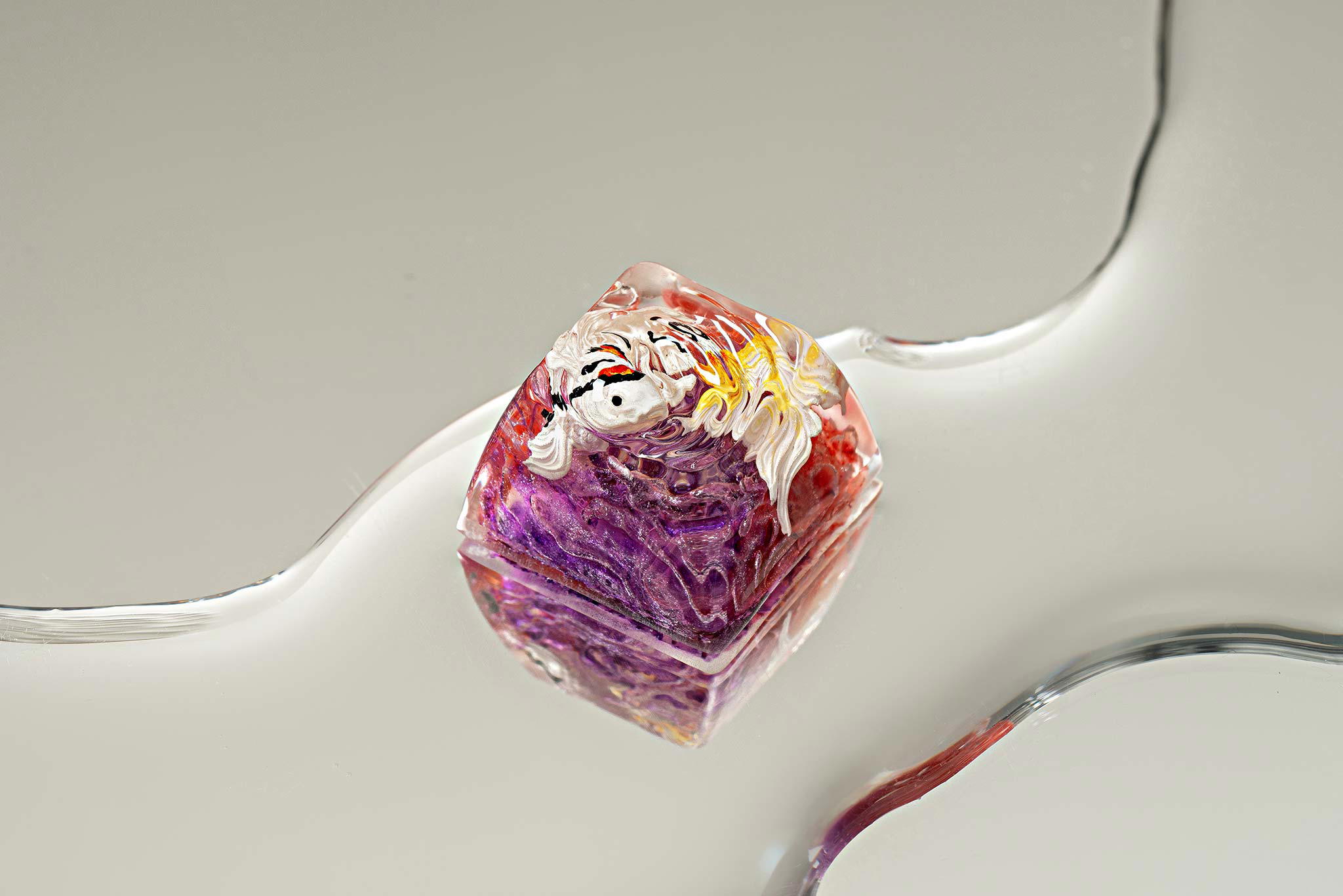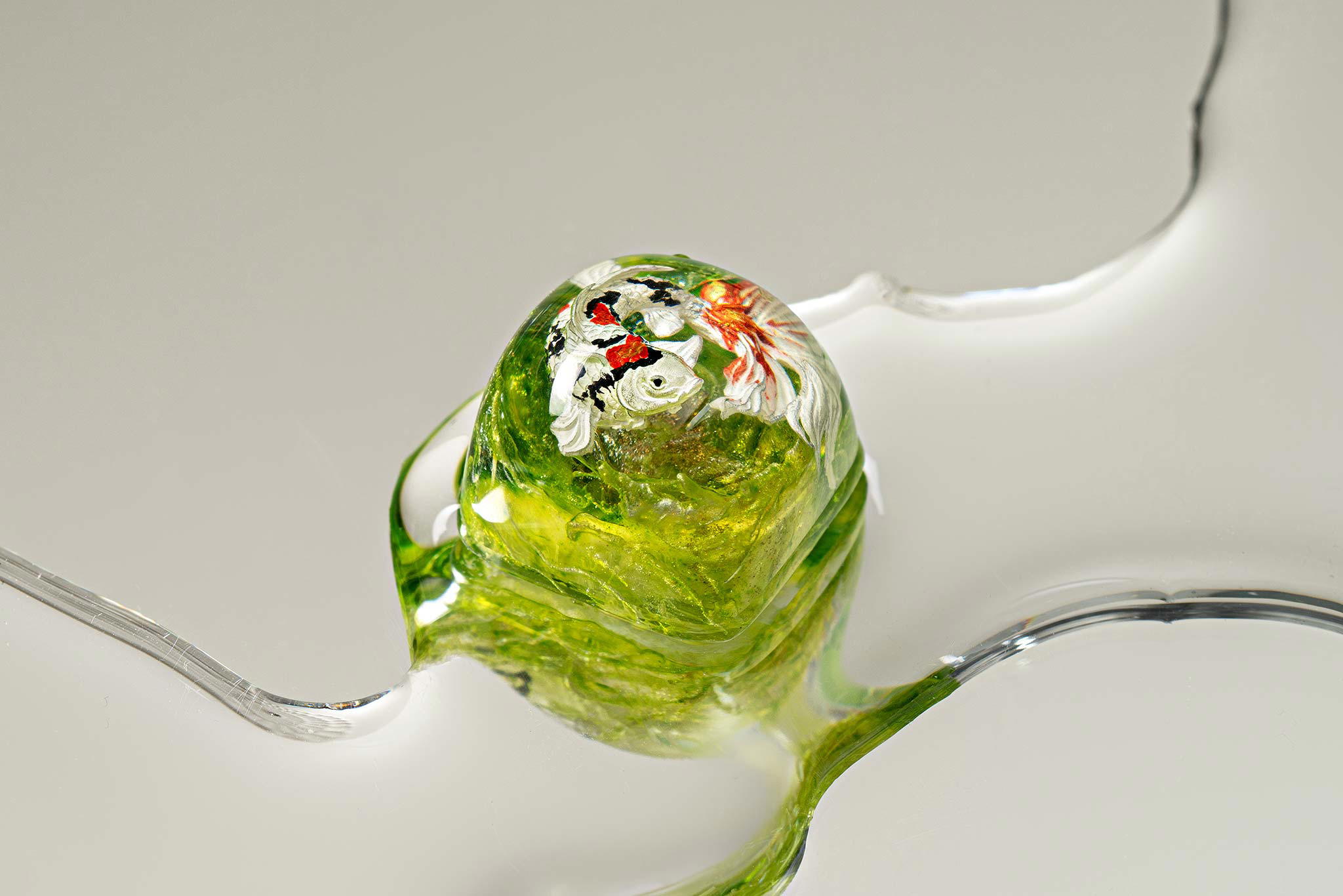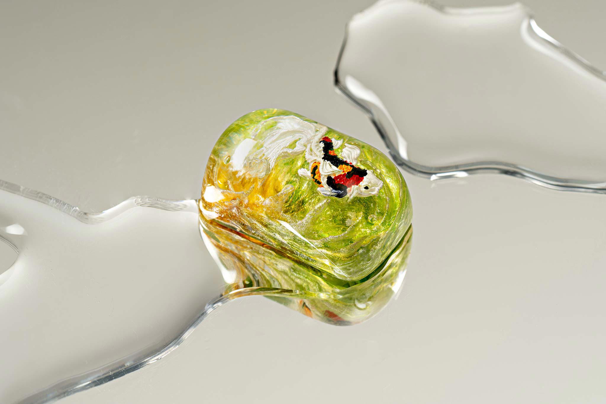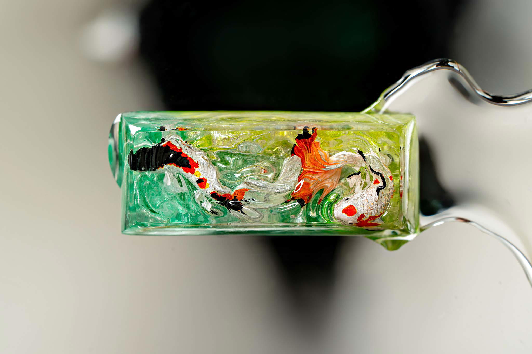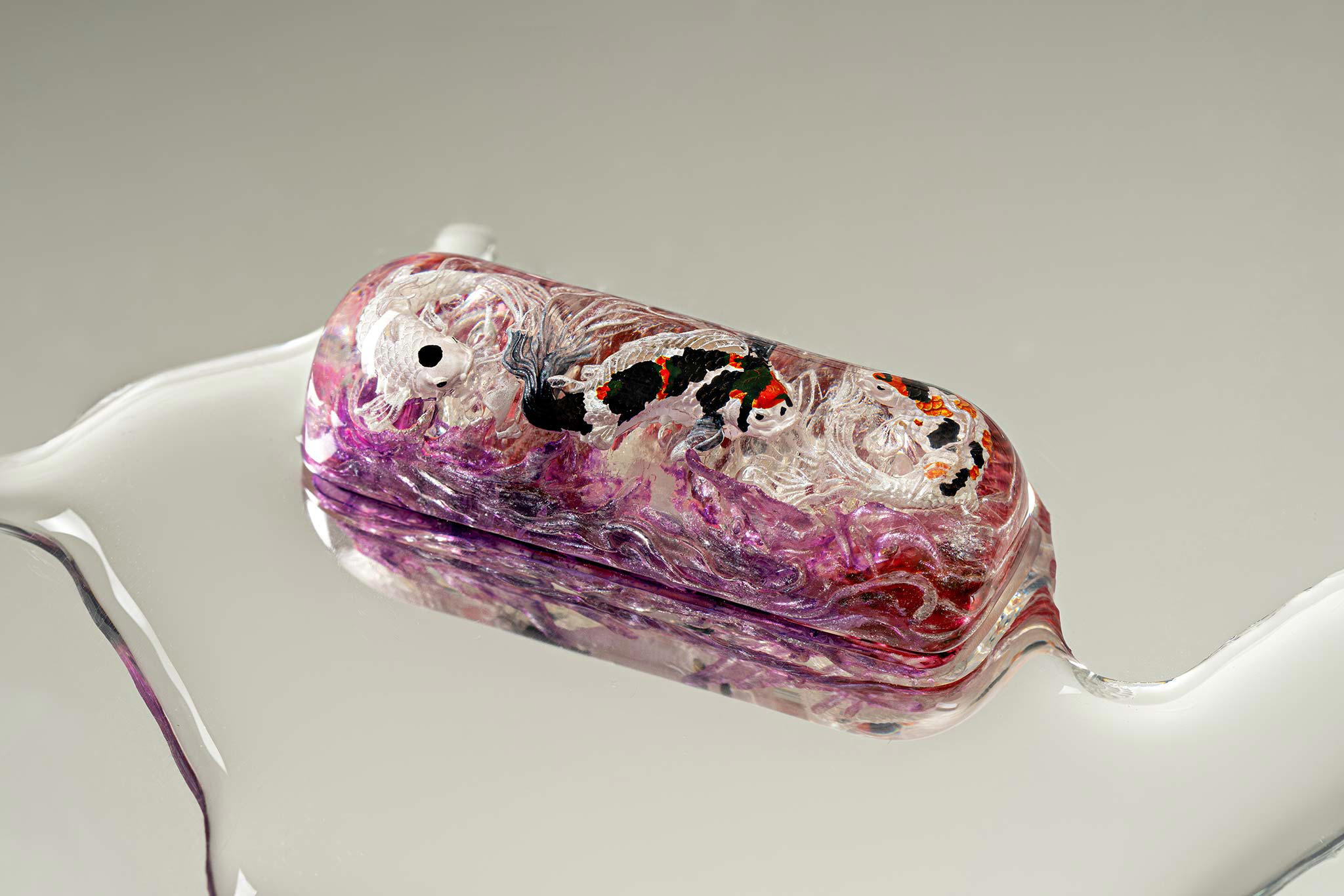 When the final layer of resin is poured, completely encasing the fish, it’s time to position the pre-formed water waves. This is the most crucial step, where “nature” and its “inhabitants” blend into a complete artwork. The most challenging part is handling the protruding portions of the Koi fish – they remain within the resin but rise above the keycap surface with “water” surrounding them, protecting the fish while ensuring daily usability and maintaining consistent aesthetics throughout. But the journey isn’t over yet – we still need to wait another 24 hours for the resin to fully solidify.