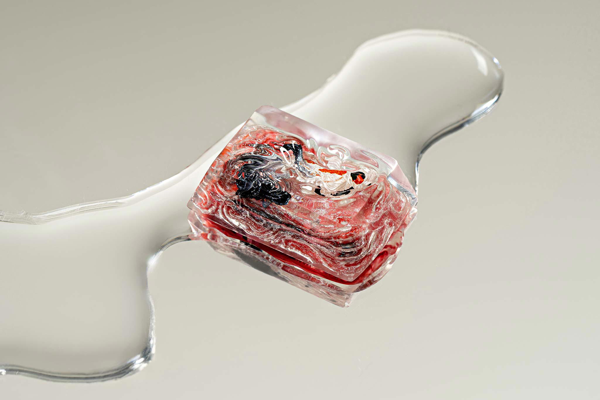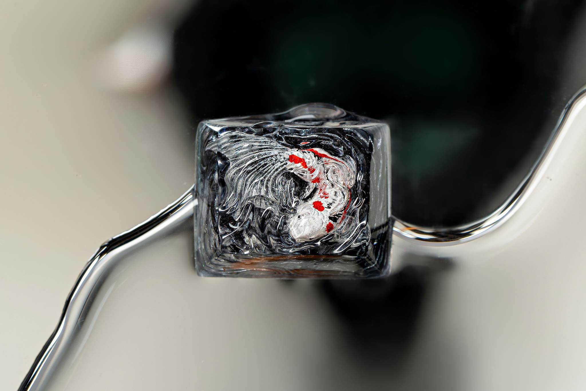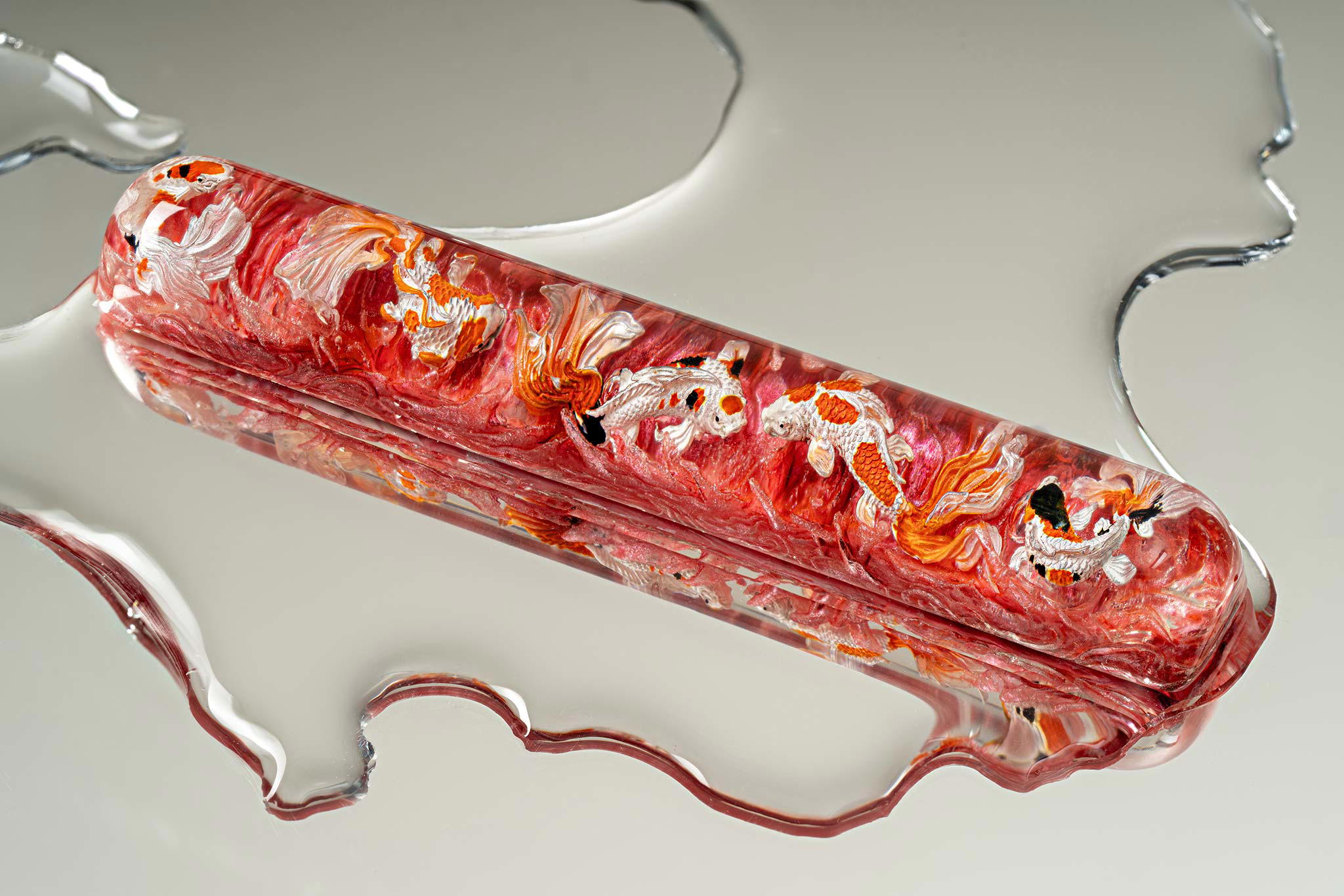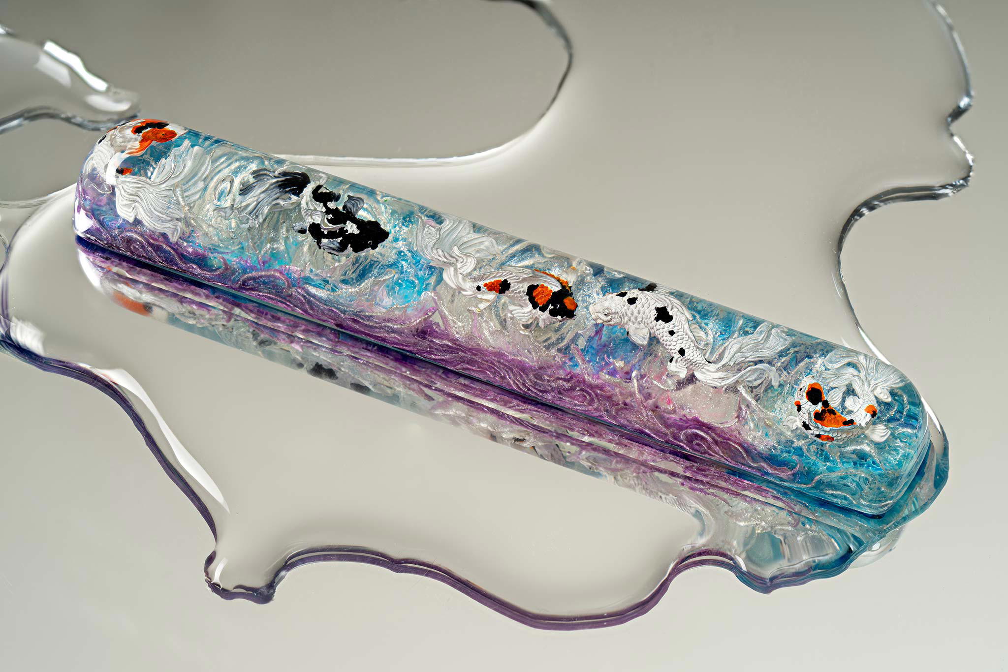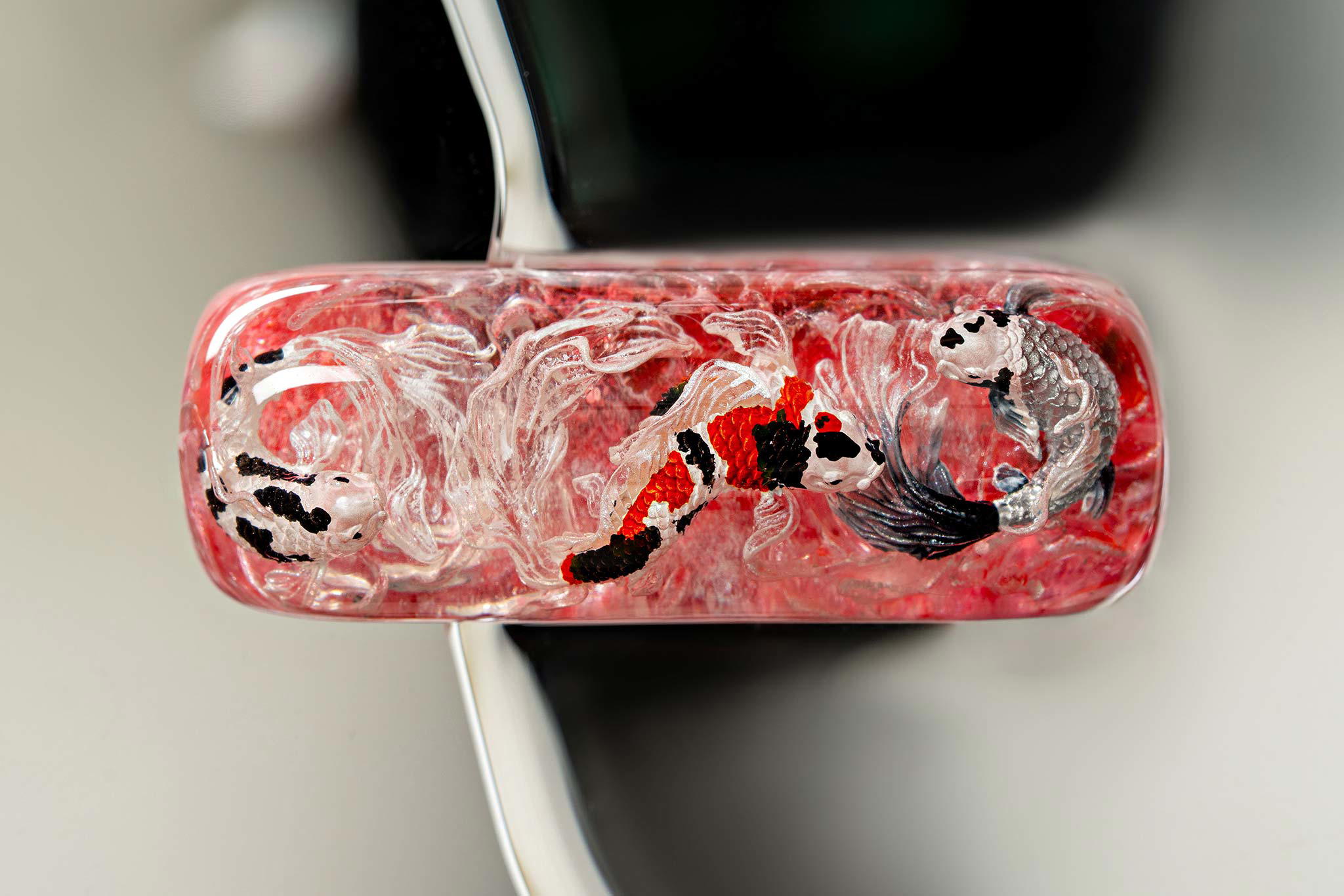 When the final layer of resin is poured, completely encasing the fish, it’s time to position the pre-formed water waves. This is the most crucial step, where “nature” and its “inhabitants” blend into a complete artwork. The most challenging part is handling the protruding portions of the Koi fish – they remain within the resin but rise above the keycap surface with “water” surrounding them, protecting the fish while ensuring daily usability and maintaining consistent aesthetics throughout. But the journey isn’t over yet – we still need to wait another 24 hours for the resin to fully solidify.