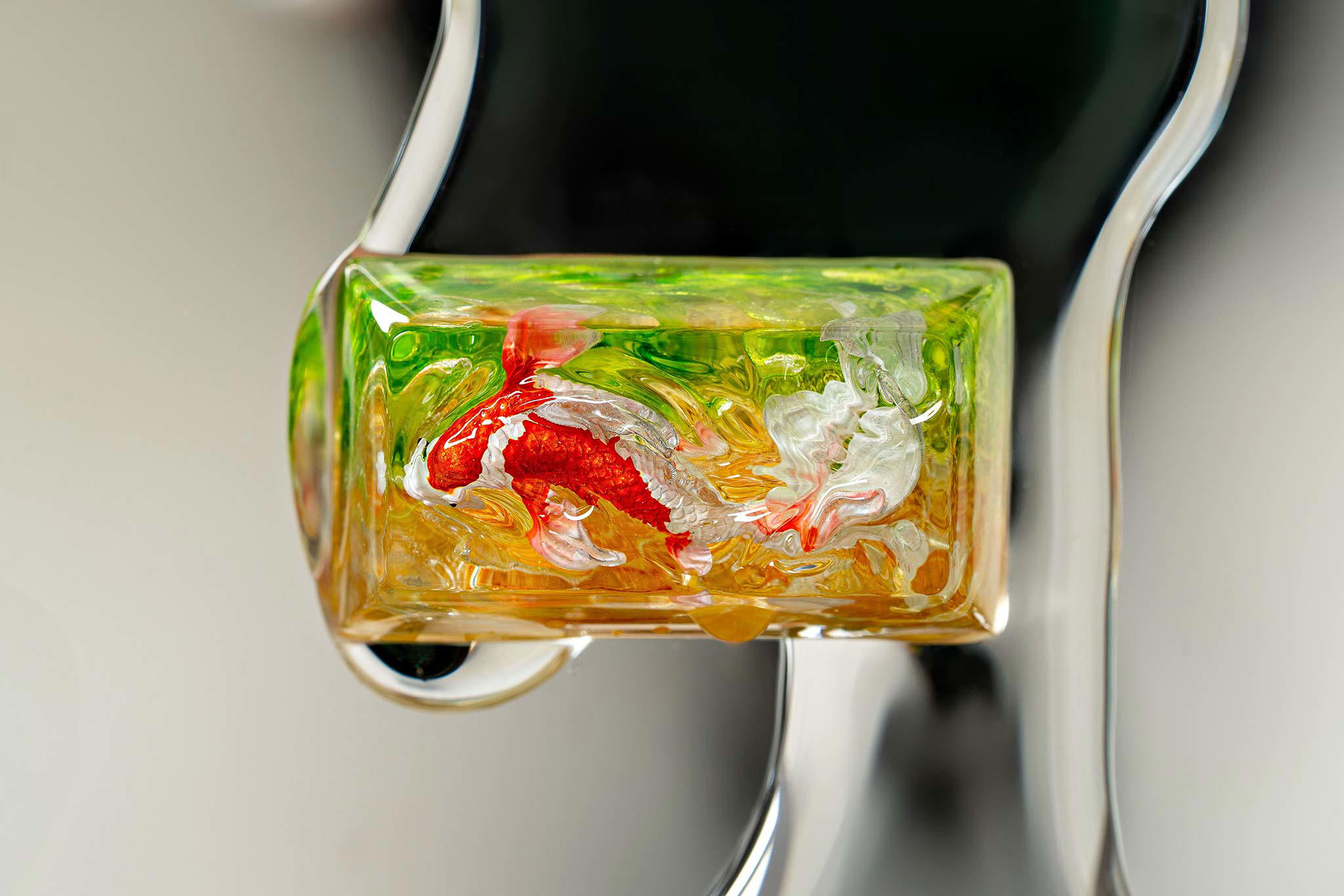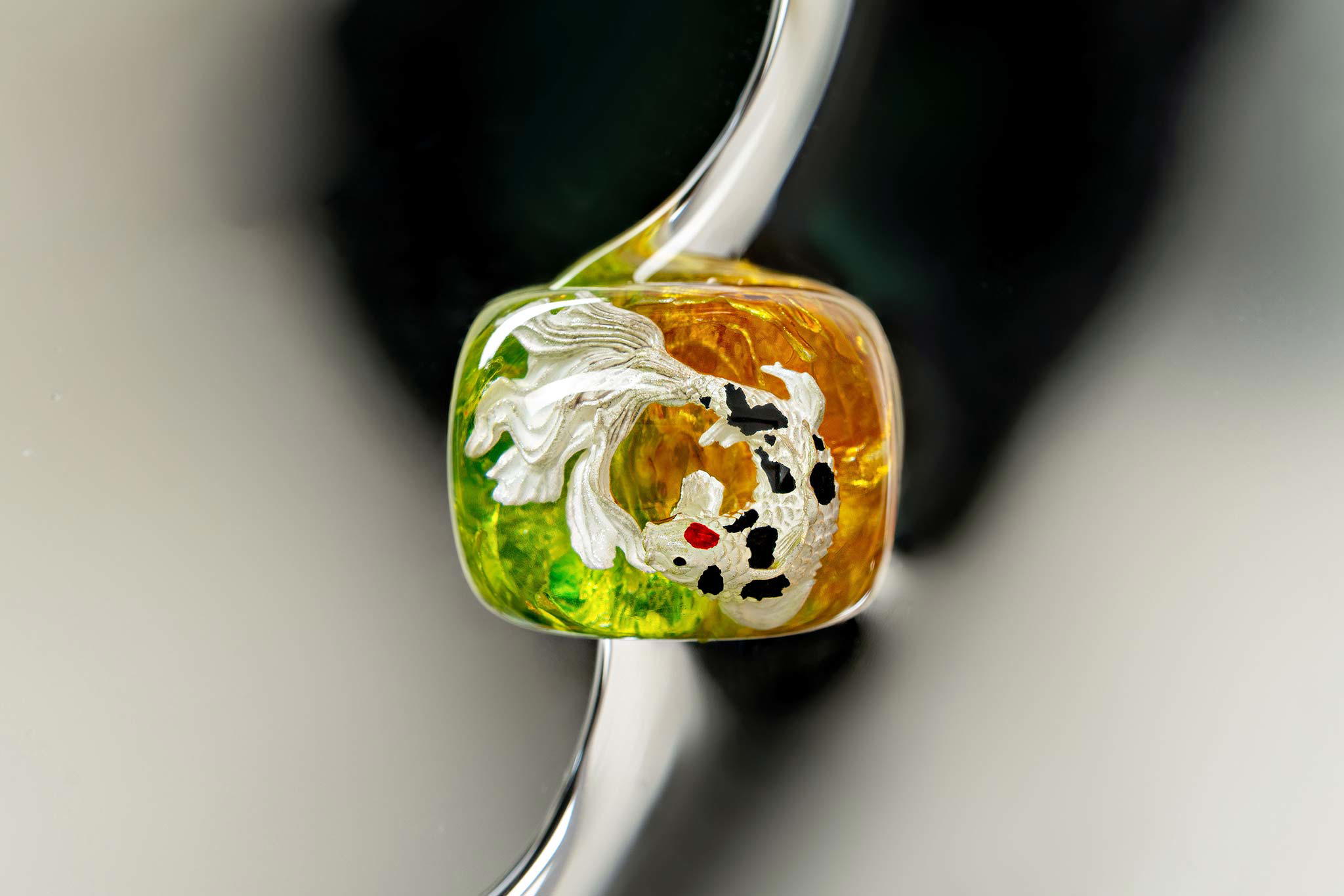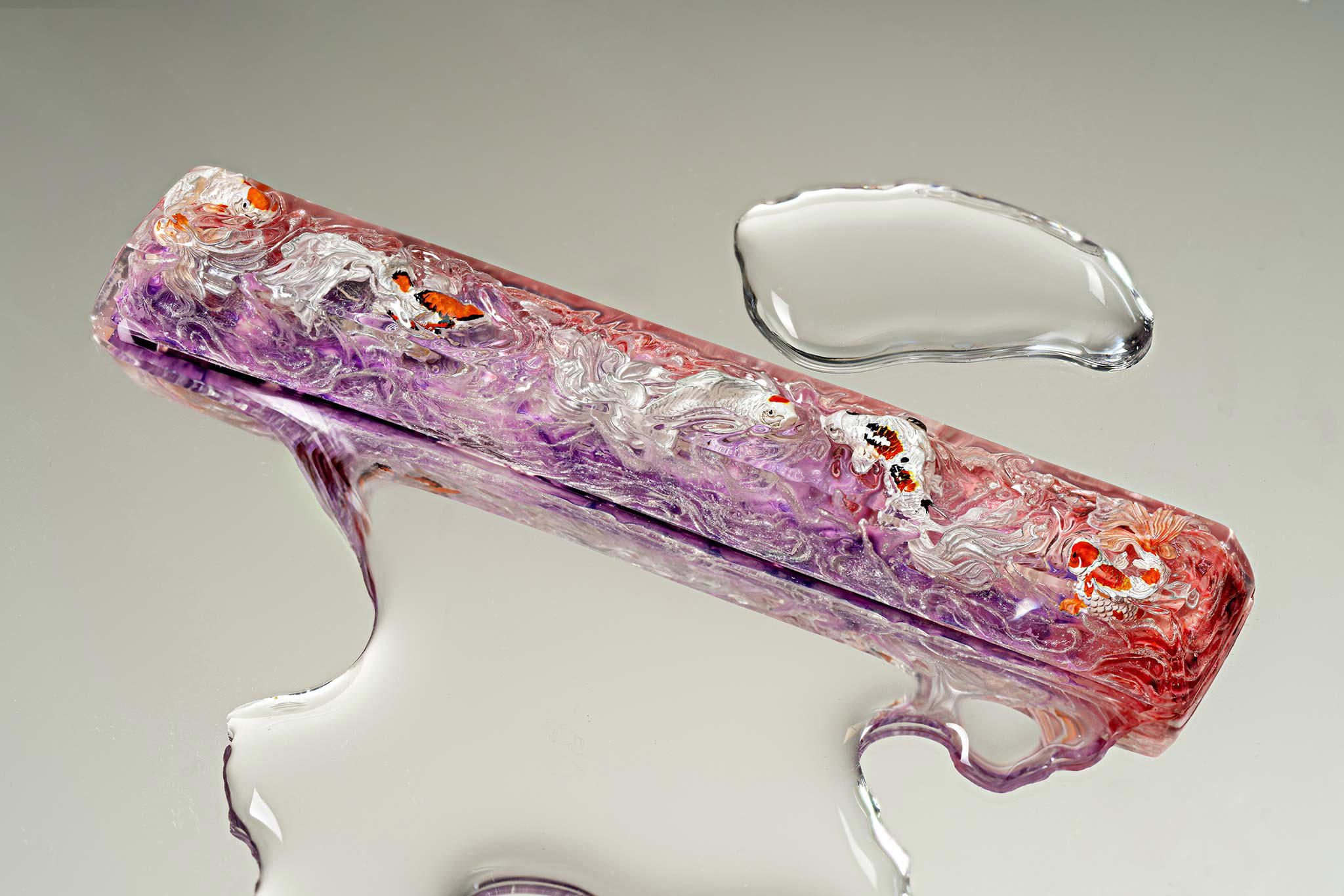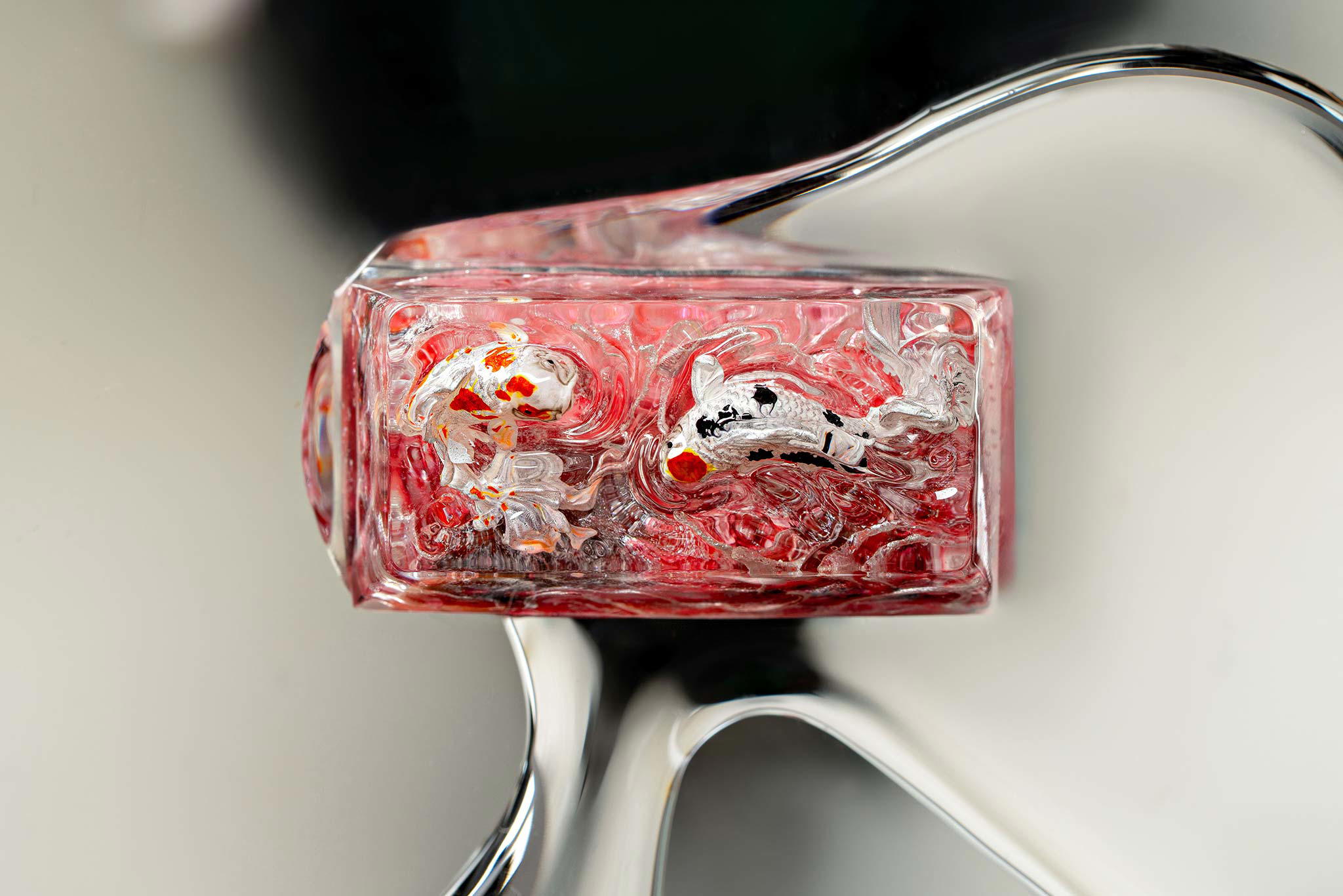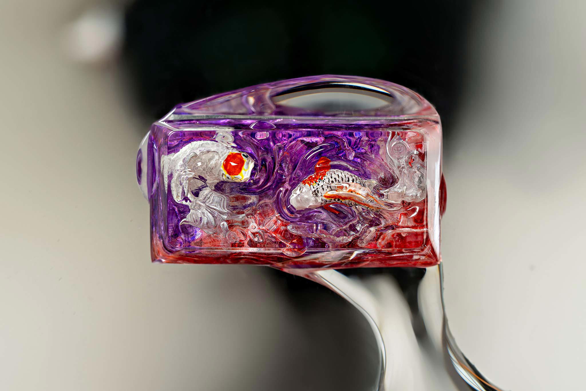 When the final layer of resin is poured, completely encasing the fish, it’s time to position the pre-formed water waves. This is the most crucial step, where “nature” and its “inhabitants” blend into a complete artwork. The most challenging part is handling the protruding portions of the Koi fish – they remain within the resin but rise above the keycap surface with “water” surrounding them, protecting the fish while ensuring daily usability and maintaining consistent aesthetics throughout. But the journey isn’t over yet – we still need to wait another 24 hours for the resin to fully solidify.