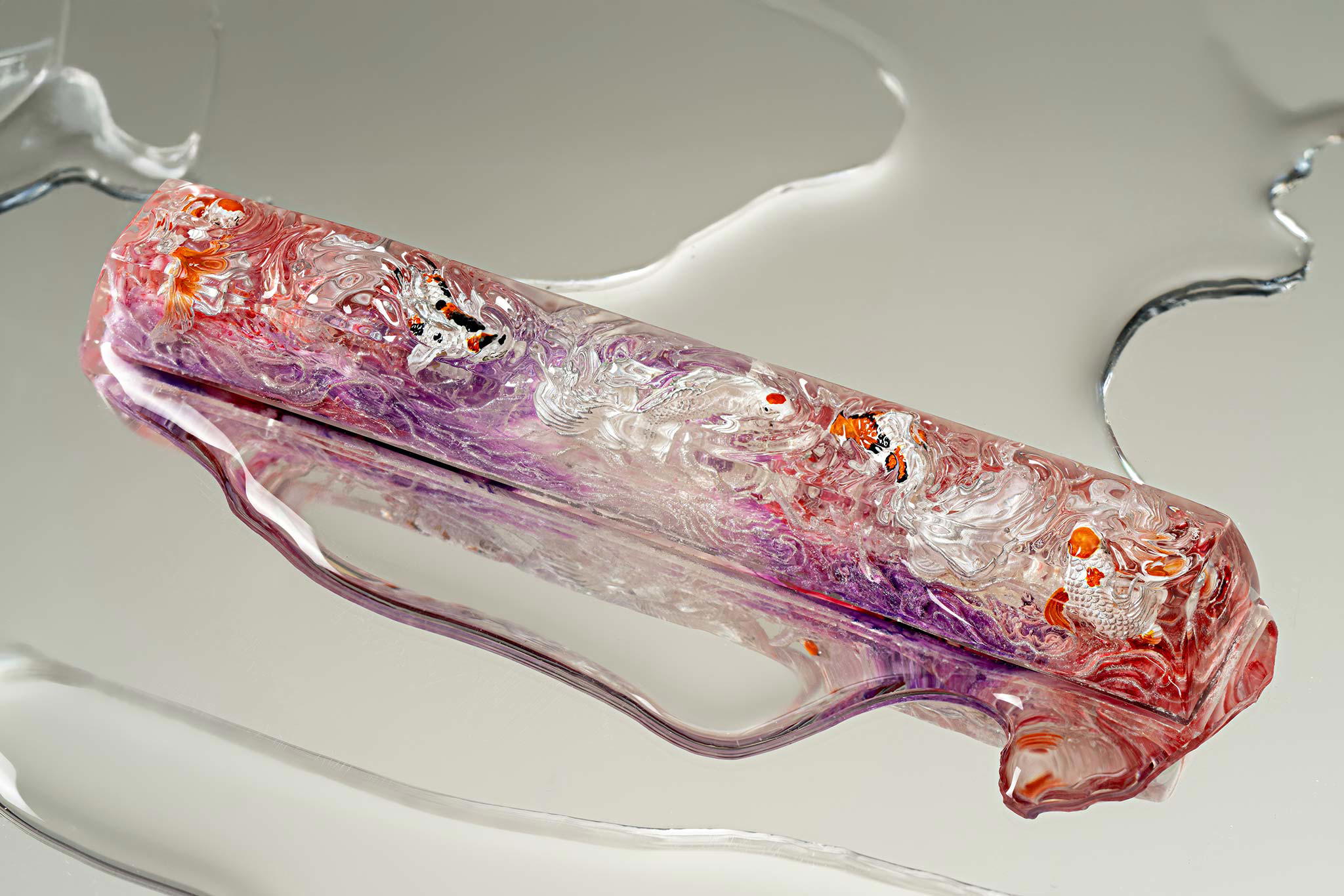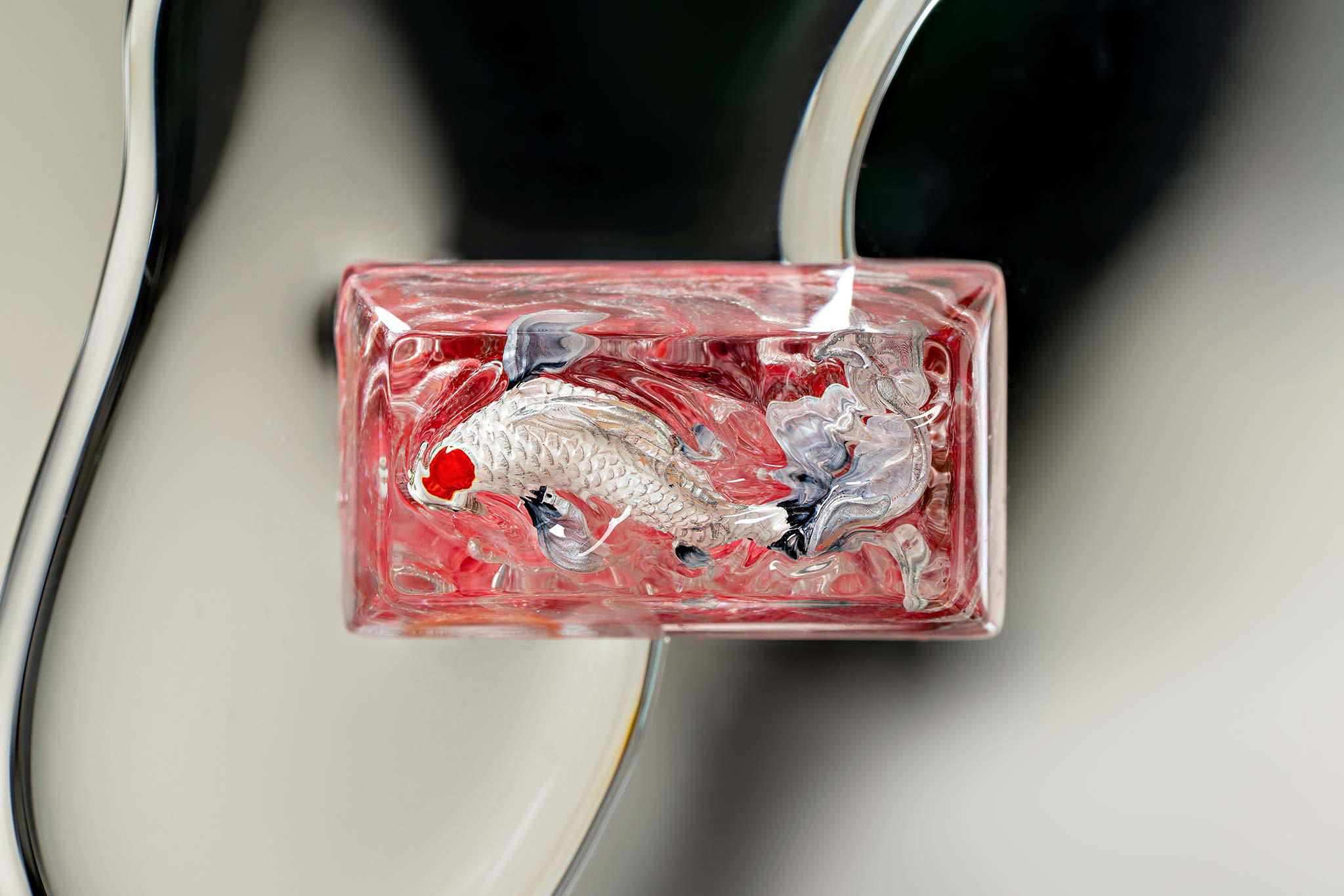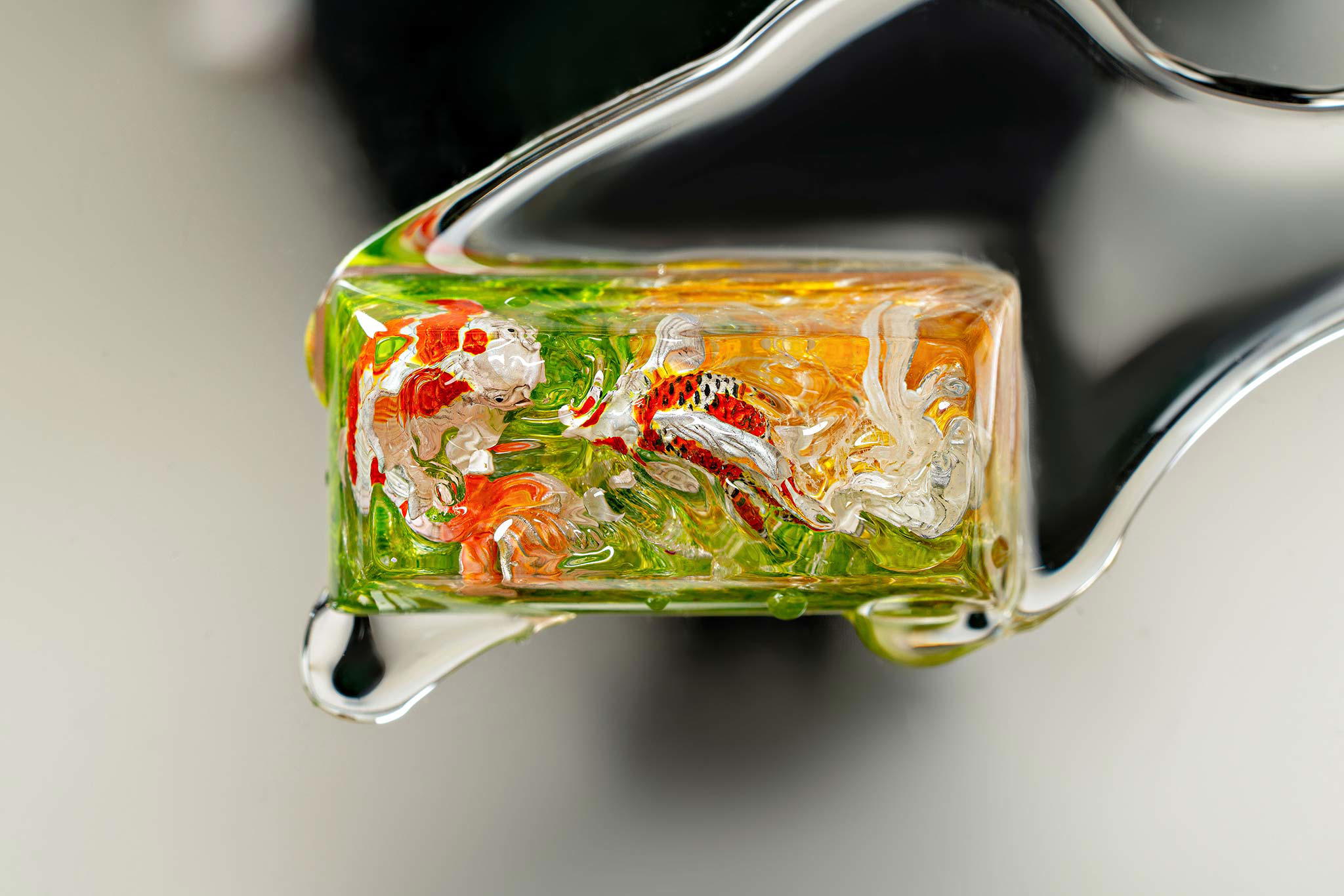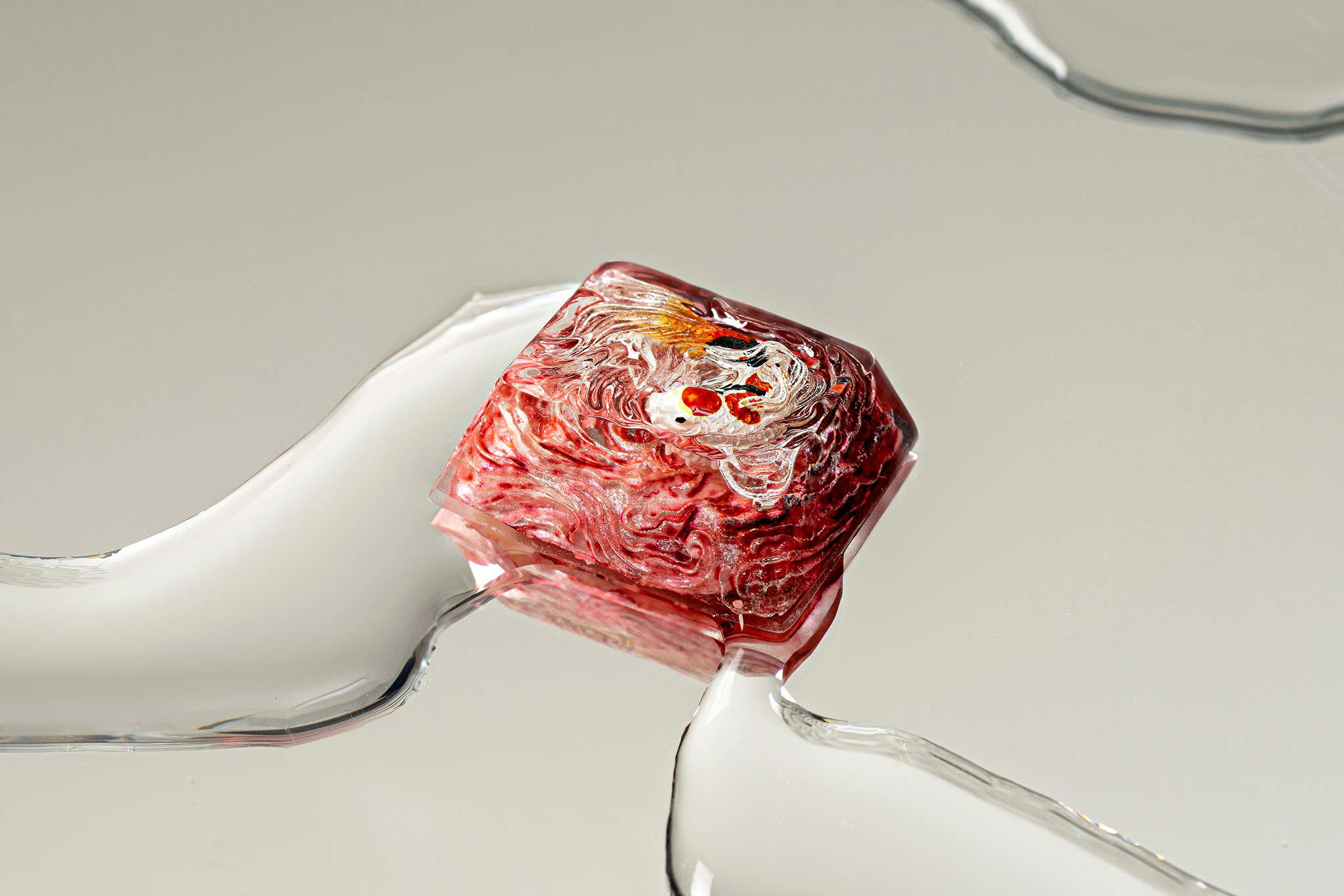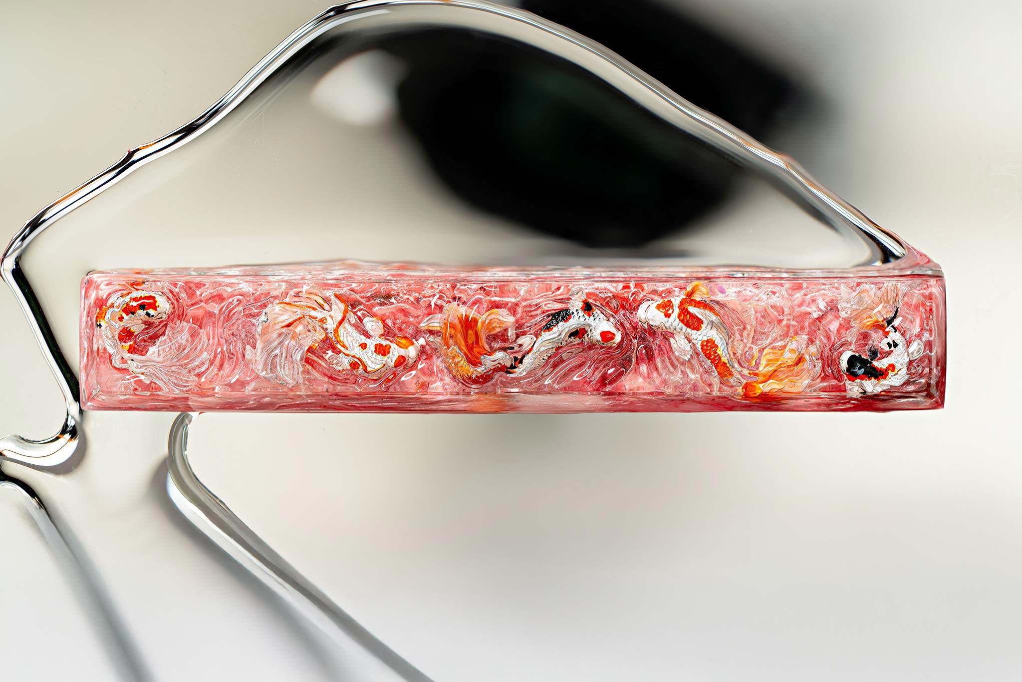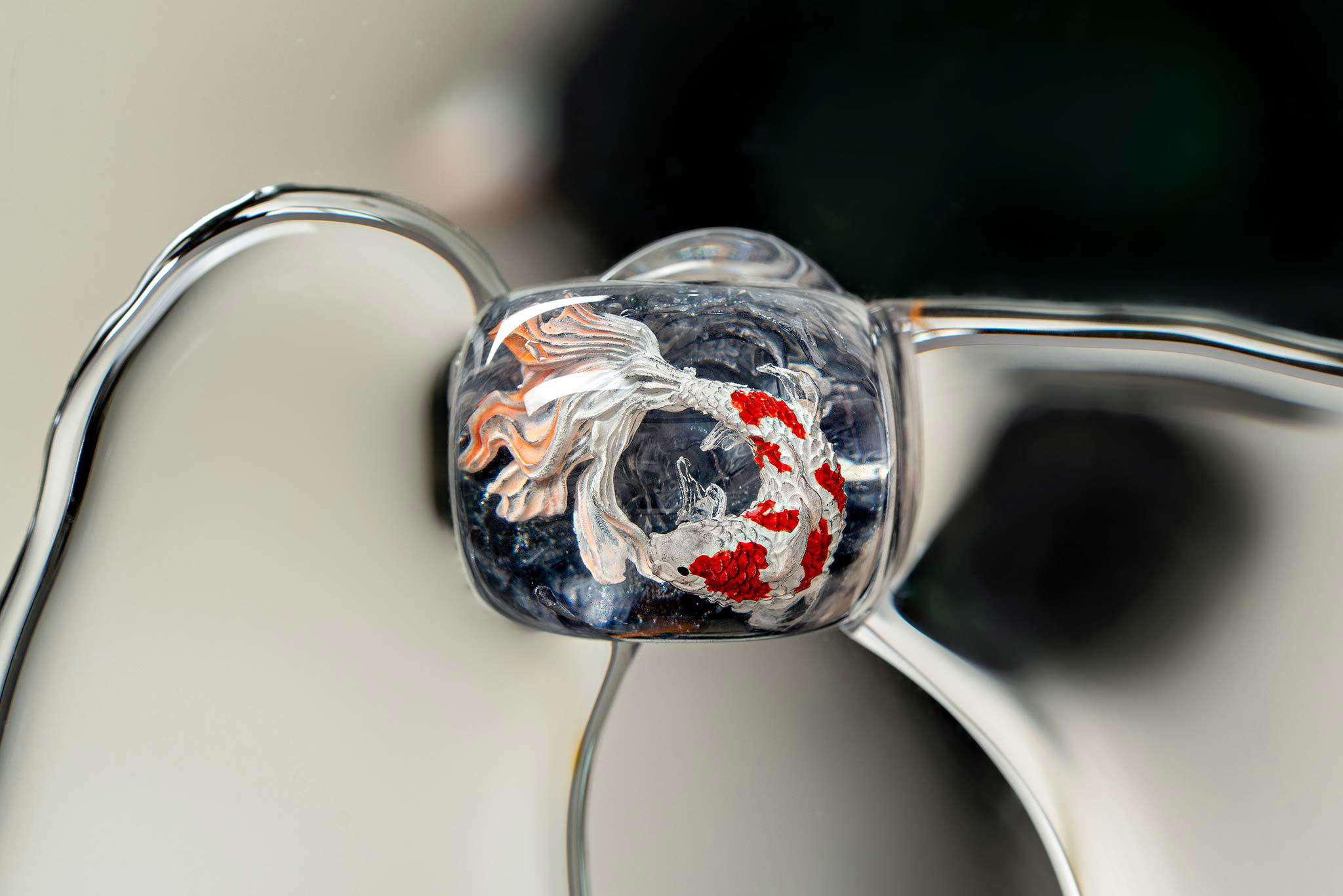 When the final layer of resin is poured, completely encasing the fish, it’s time to position the pre-formed water waves. This is the most crucial step, where “nature” and its “inhabitants” blend into a complete artwork. The most challenging part is handling the protruding portions of the Koi fish – they remain within the resin but rise above the keycap surface with “water” surrounding them, protecting the fish while ensuring daily usability and maintaining consistent aesthetics throughout. But the journey isn’t over yet – we still need to wait another 24 hours for the resin to fully solidify.