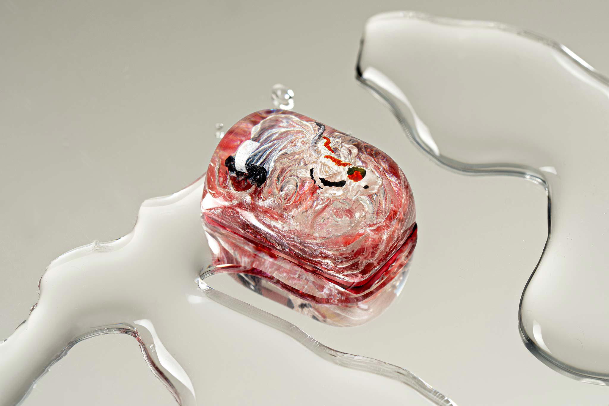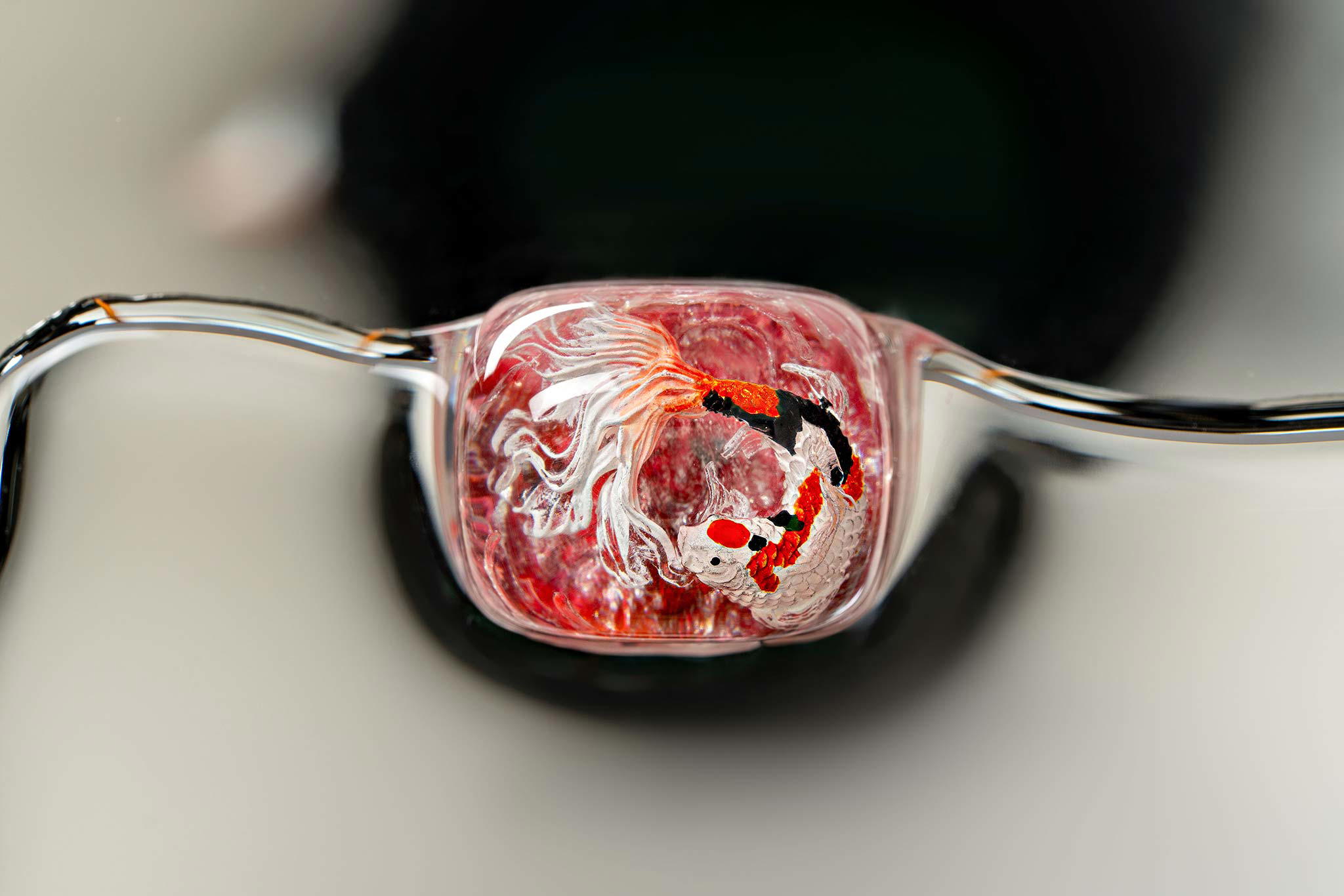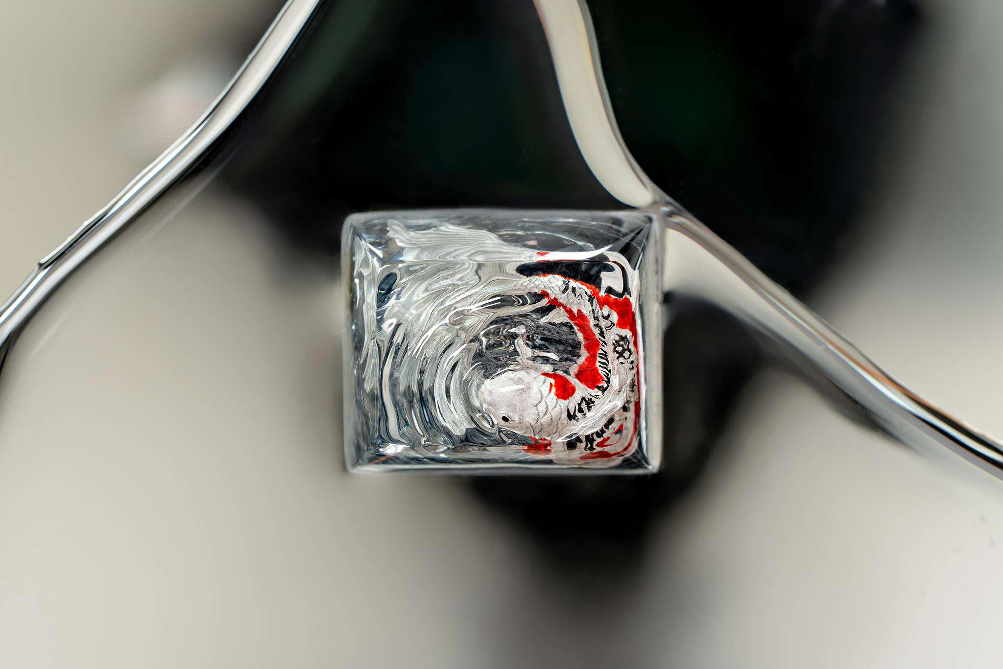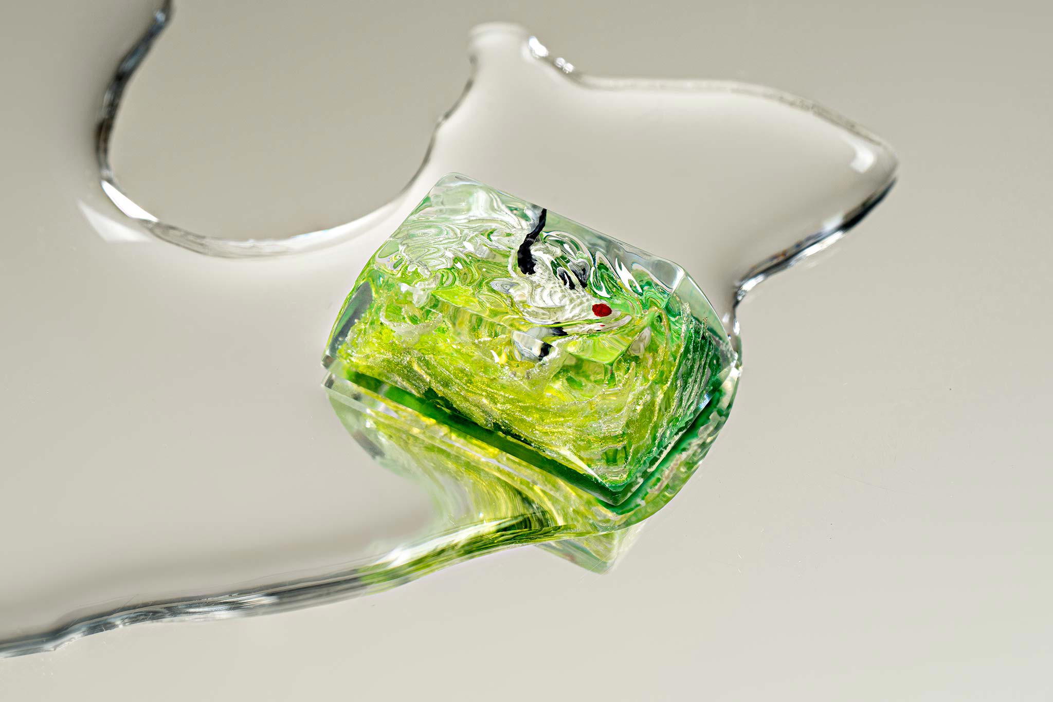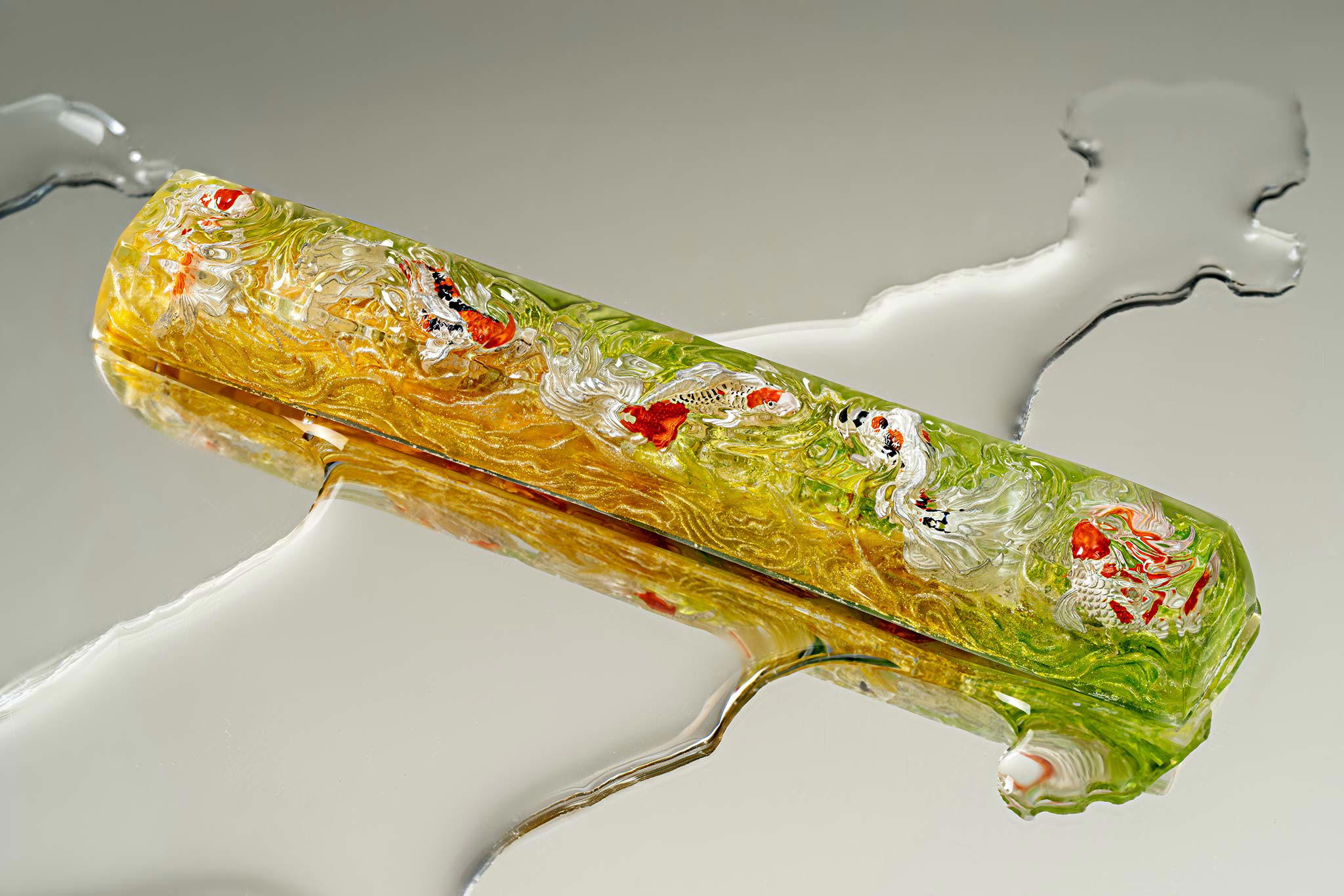 When the final layer of resin is poured, completely encasing the fish, it’s time to position the pre-formed water waves. This is the most crucial step, where “nature” and its “inhabitants” blend into a complete artwork. The most challenging part is handling the protruding portions of the Koi fish – they remain within the resin but rise above the keycap surface with “water” surrounding them, protecting the fish while ensuring daily usability and maintaining consistent aesthetics throughout. But the journey isn’t over yet – we still need to wait another 24 hours for the resin to fully solidify.
