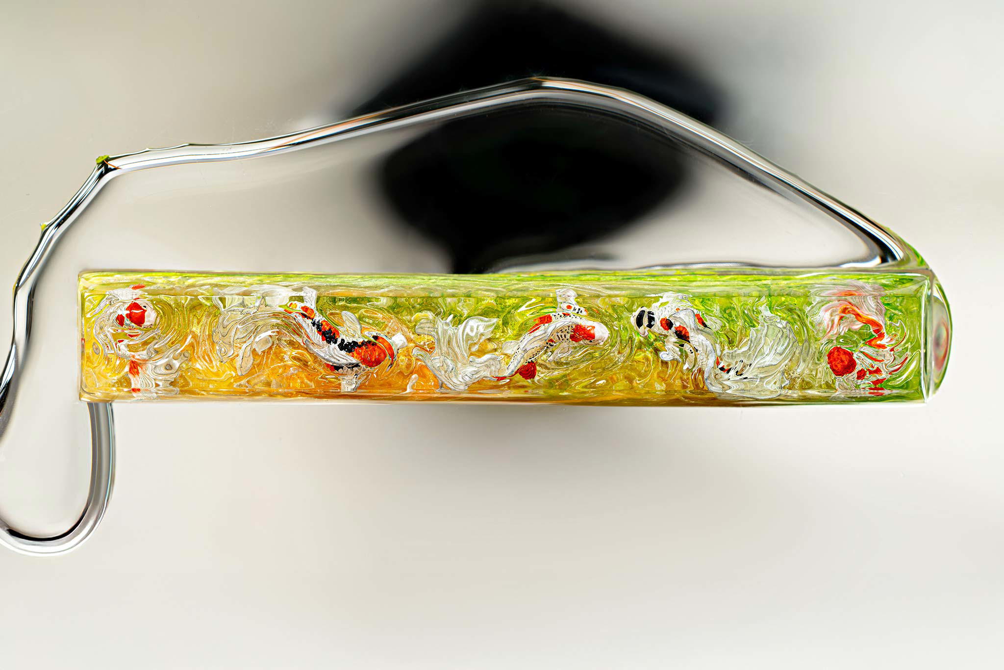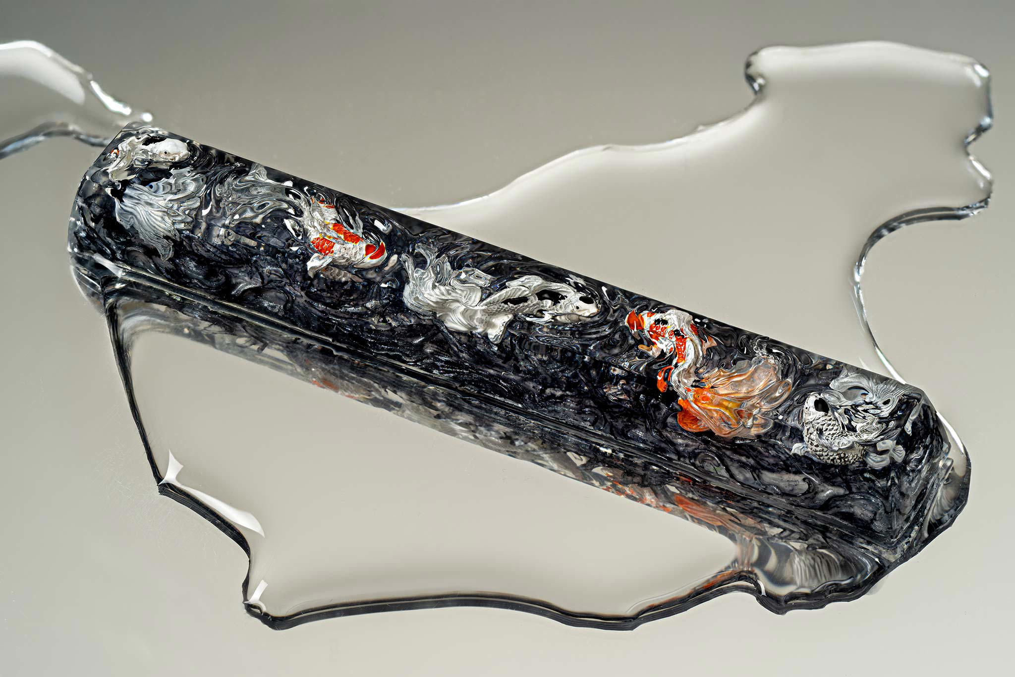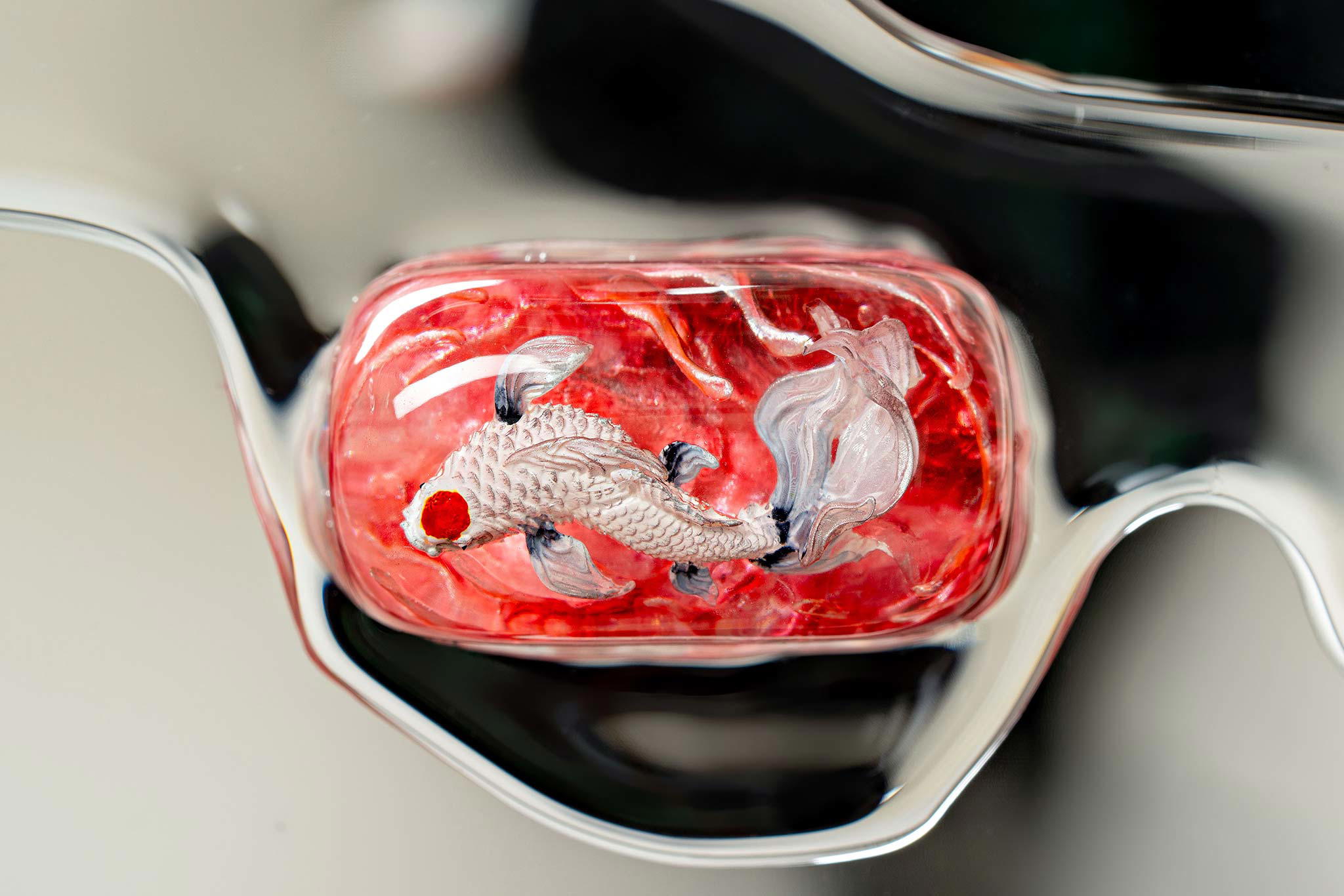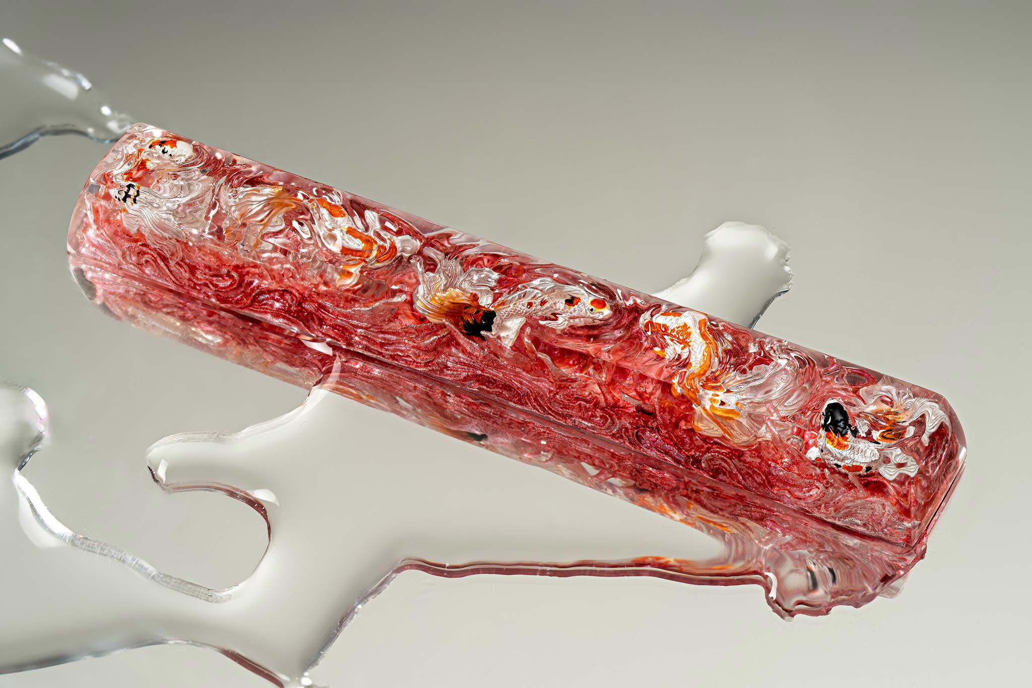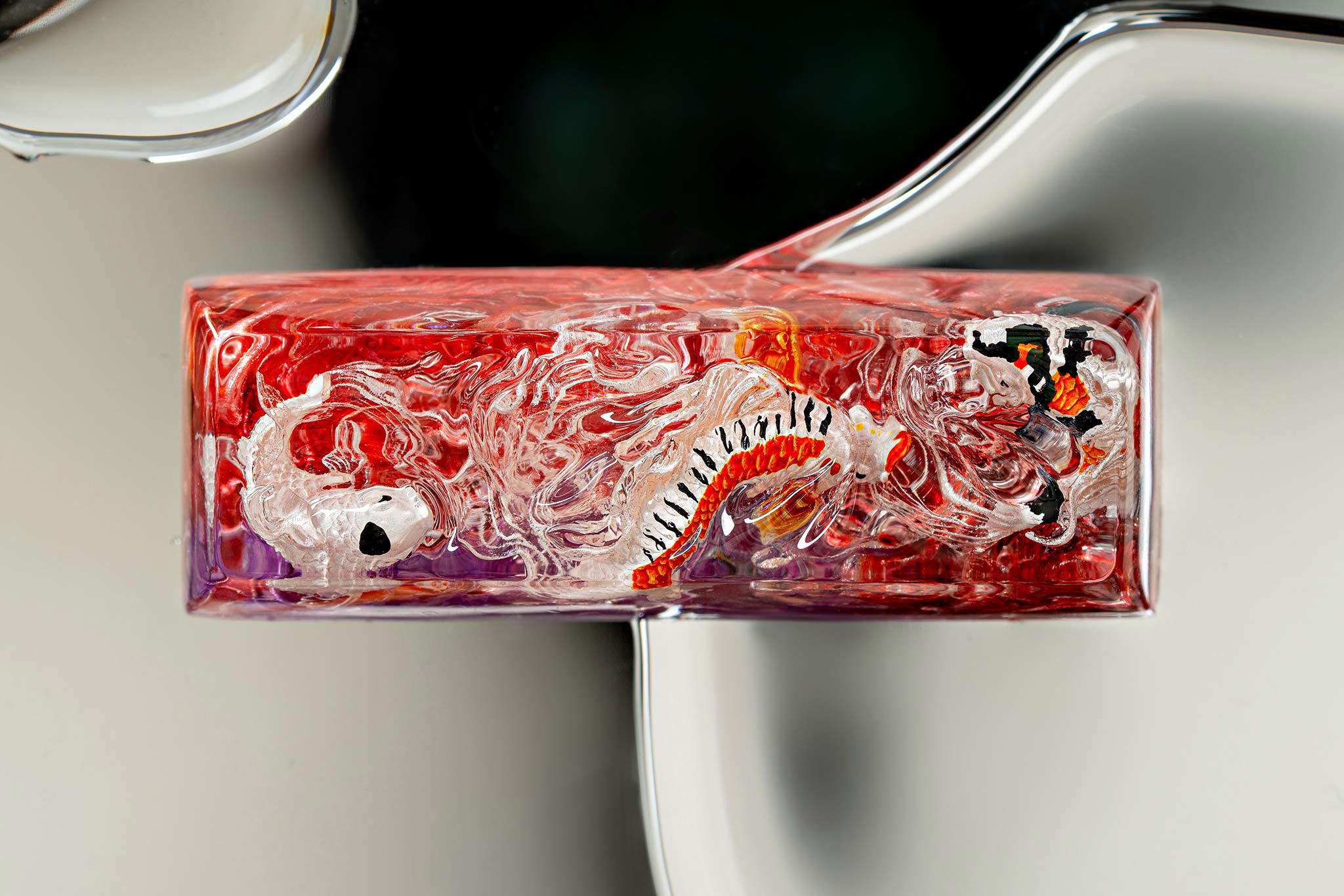 When the final layer of resin is poured, completely encasing the fish, it’s time to position the pre-formed water waves. This is the most crucial step, where “nature” and its “inhabitants” blend into a complete artwork. The most challenging part is handling the protruding portions of the Koi fish – they remain within the resin but rise above the keycap surface with “water” surrounding them, protecting the fish while ensuring daily usability and maintaining consistent aesthetics throughout. But the journey isn’t over yet – we still need to wait another 24 hours for the resin to fully solidify.