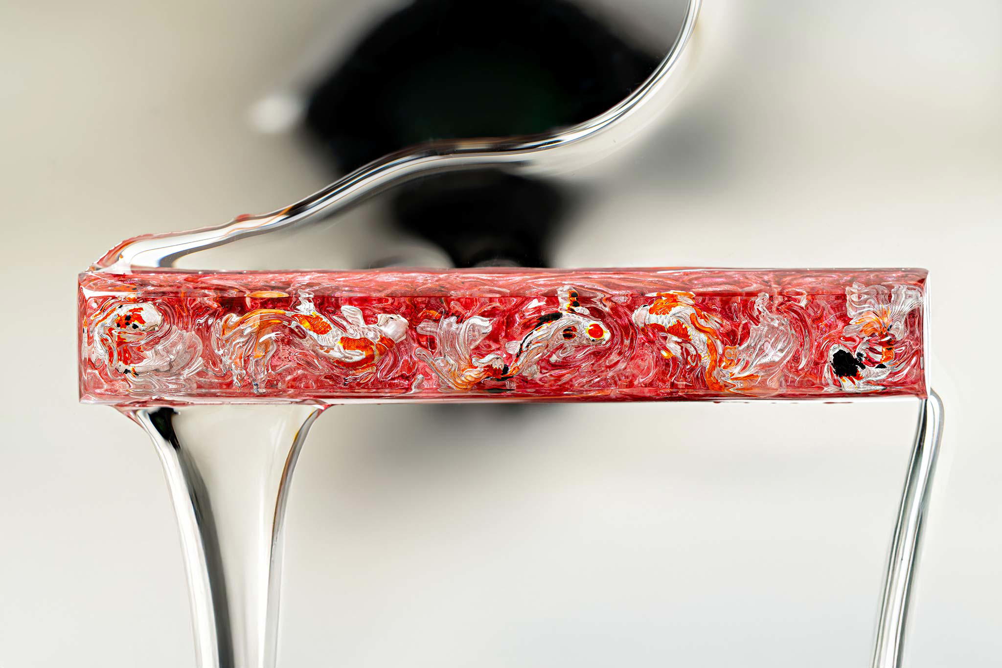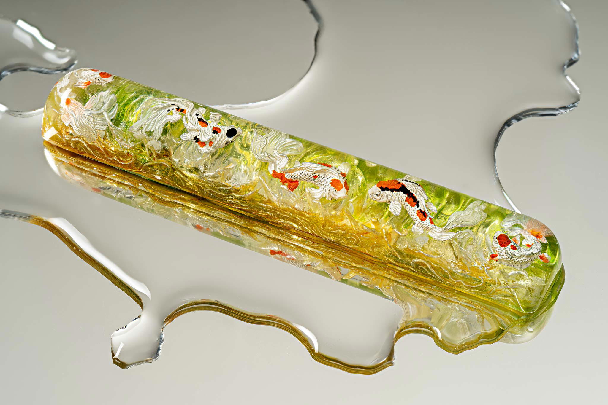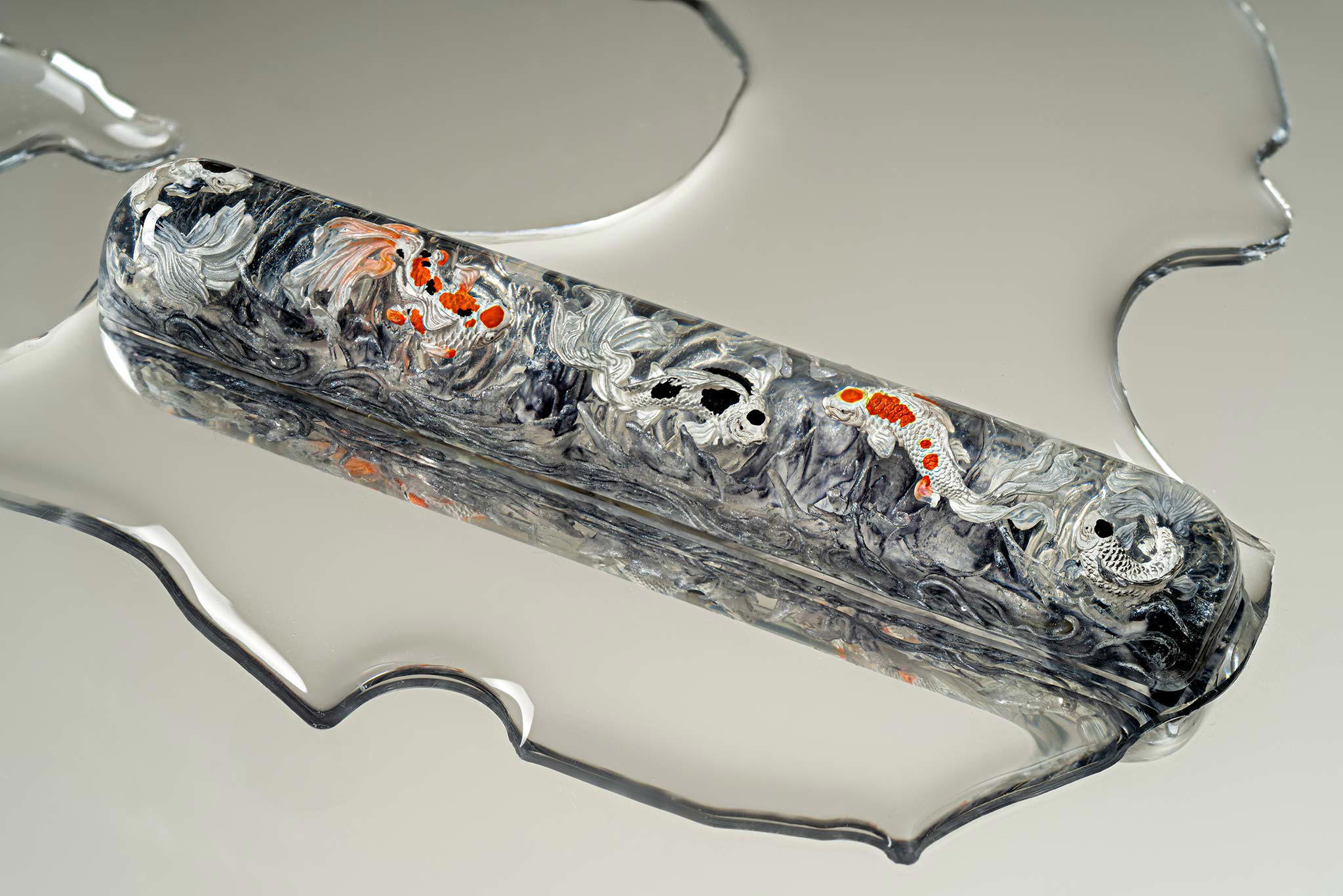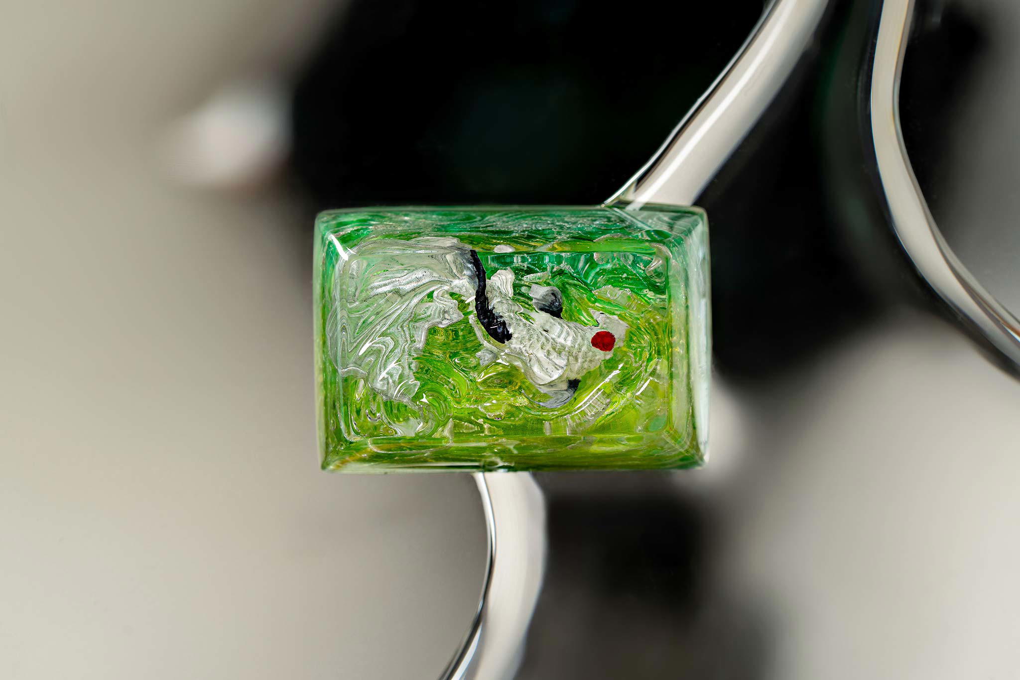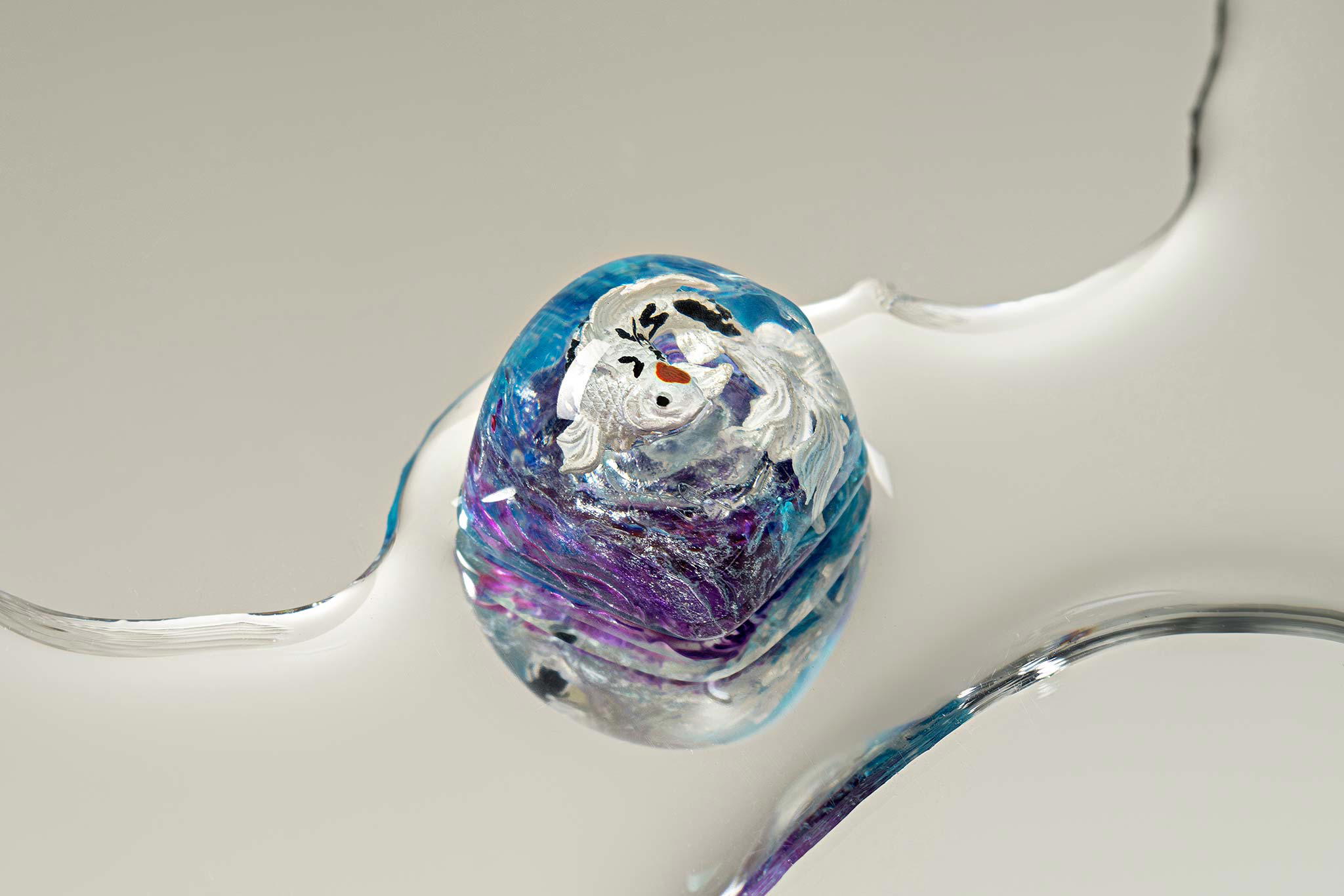 When the final layer of resin is poured, completely encasing the fish, it’s time to position the pre-formed water waves. This is the most crucial step, where “nature” and its “inhabitants” blend into a complete artwork. The most challenging part is handling the protruding portions of the Koi fish – they remain within the resin but rise above the keycap surface with “water” surrounding them, protecting the fish while ensuring daily usability and maintaining consistent aesthetics throughout. But the journey isn’t over yet – we still need to wait another 24 hours for the resin to fully solidify.