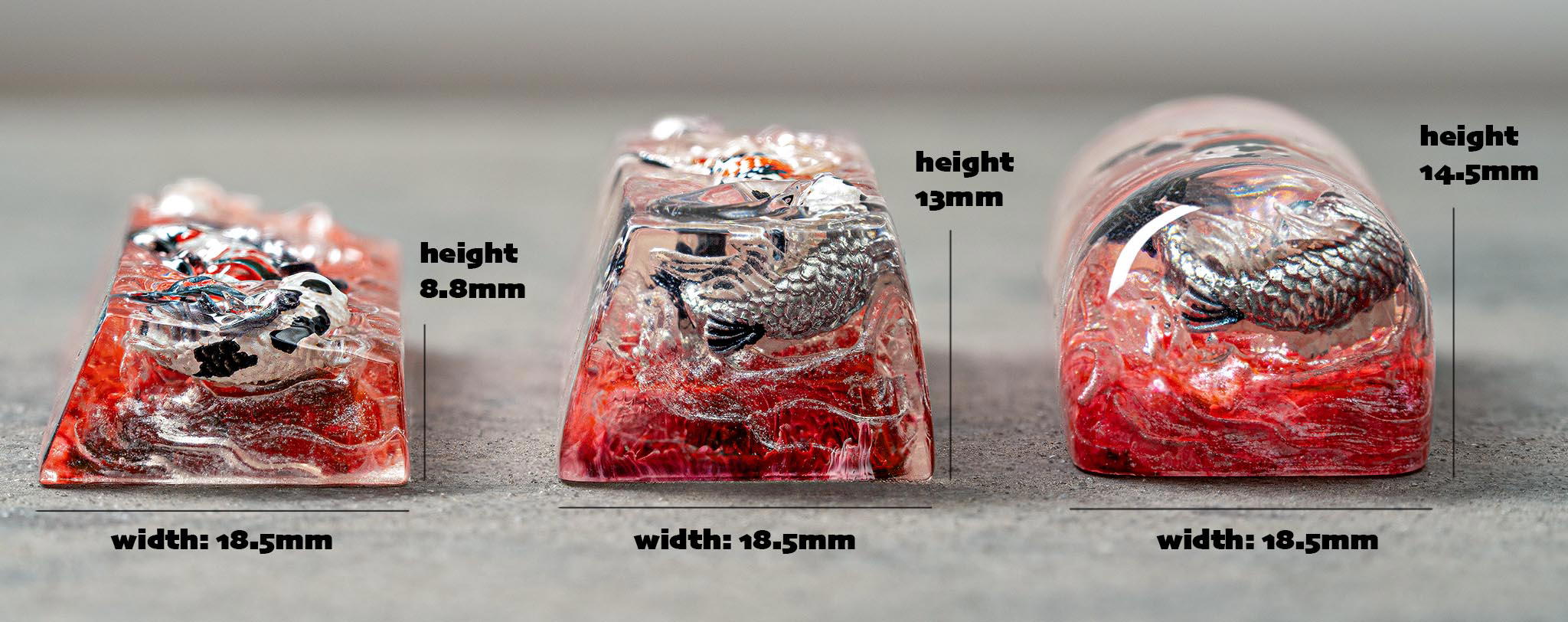 – Each keycap is packaged in a handcrafted wooden box. They are meticulously made by hand through resin casting and multi-layer coloring techniques, showcasing unique craftsmanship. No 3D printing is involved.