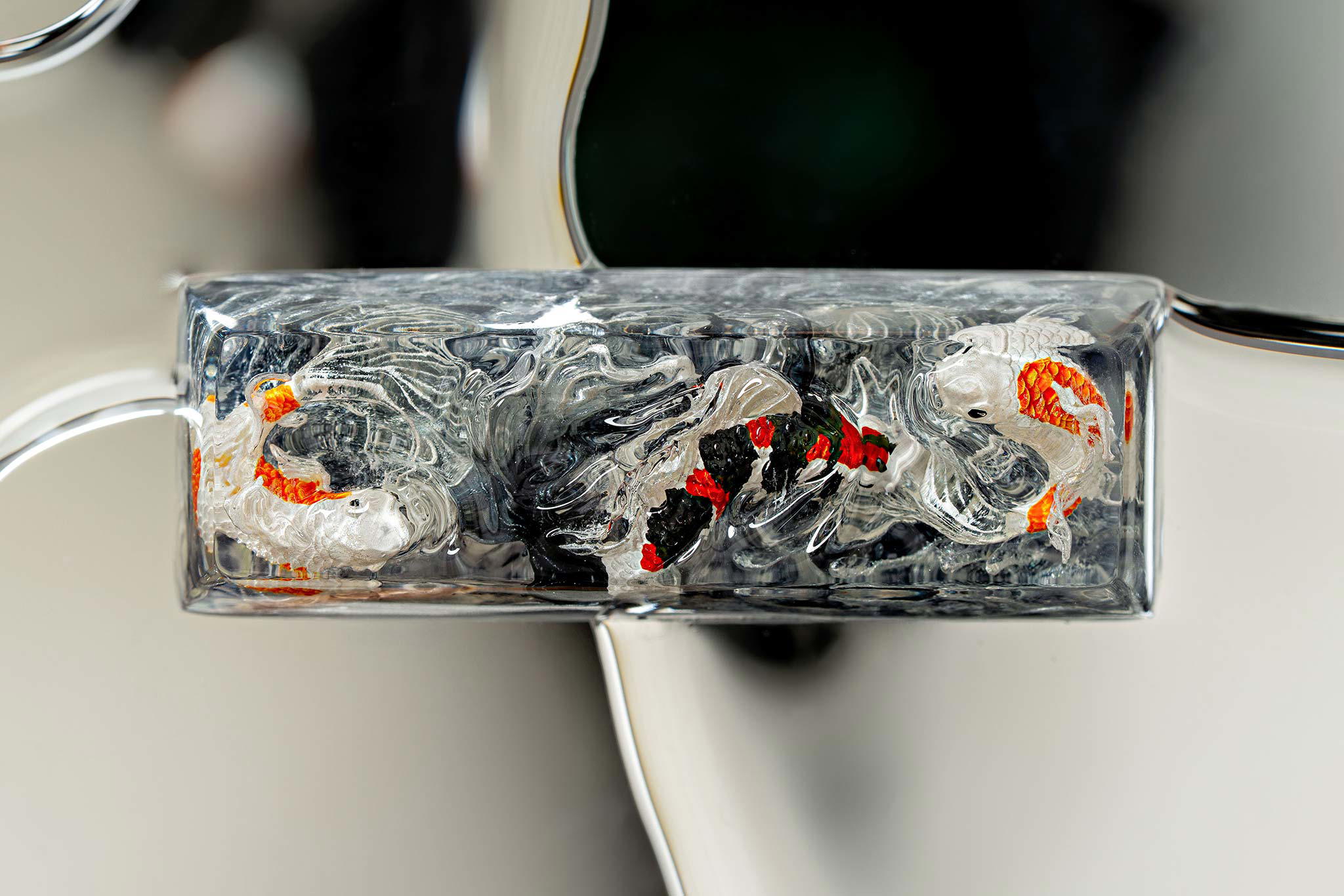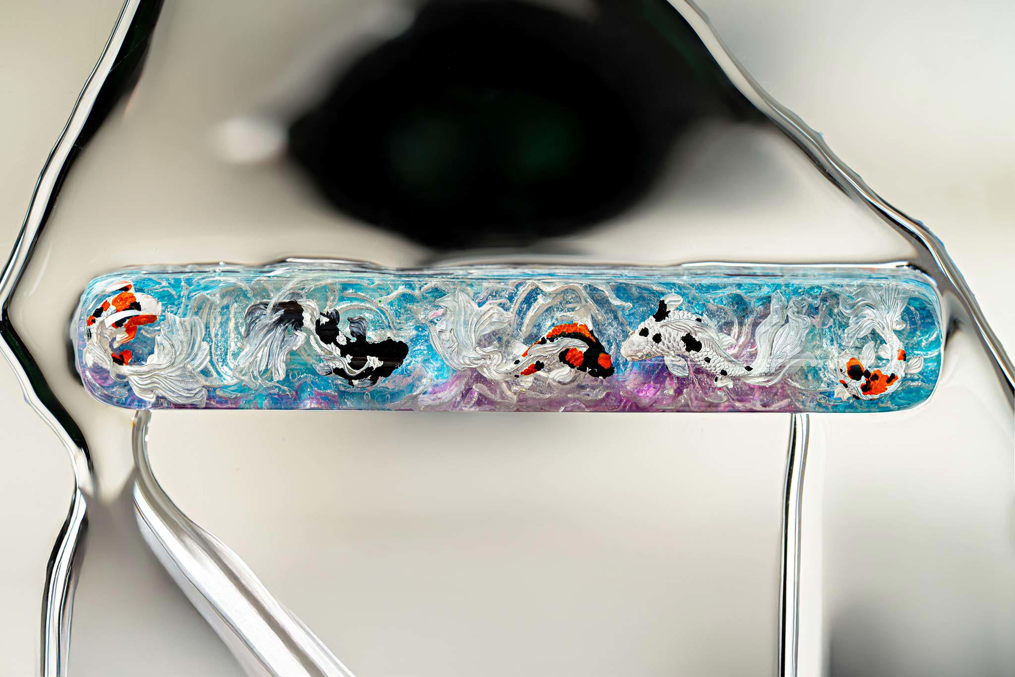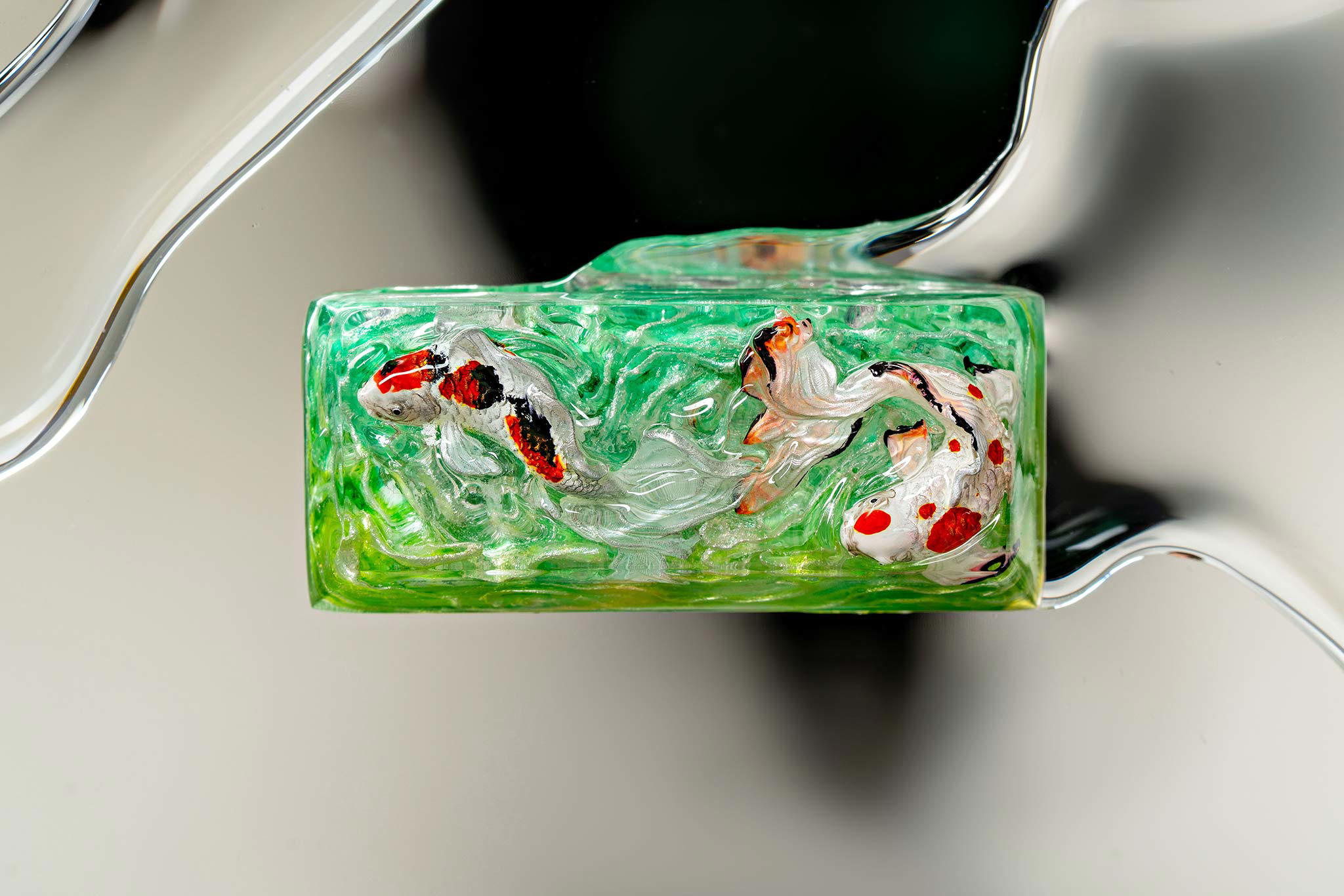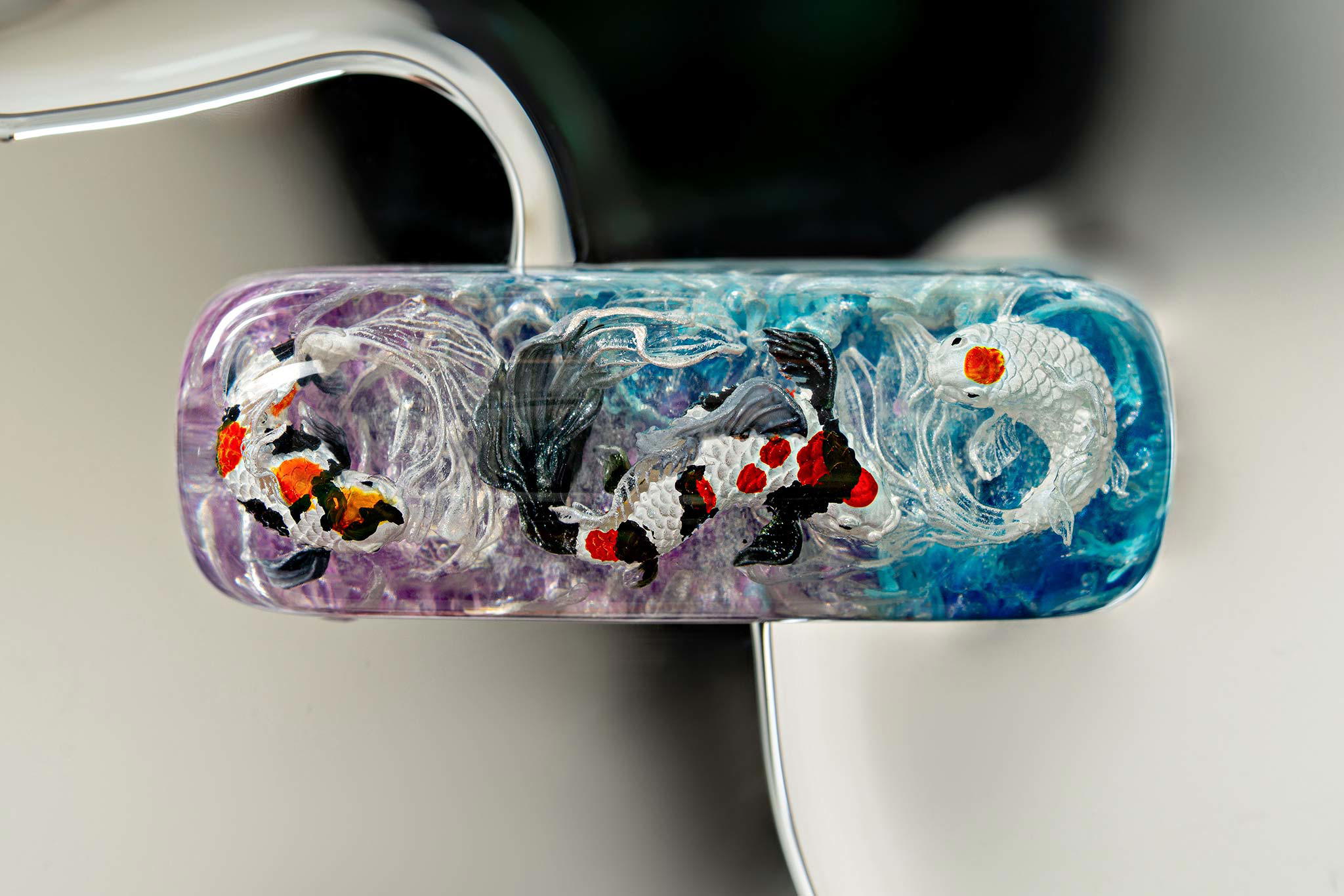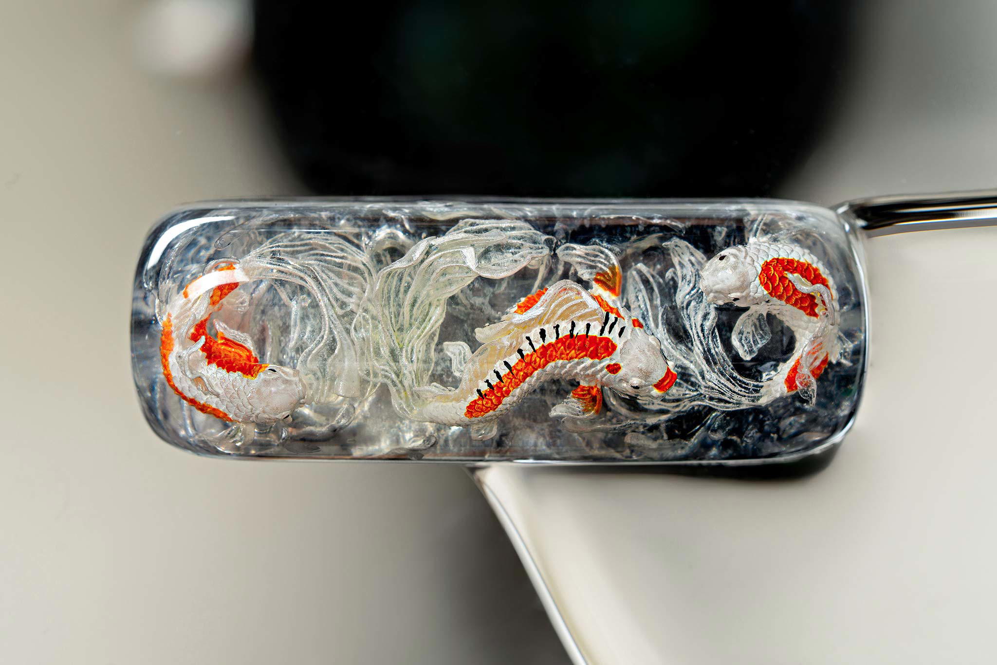 Polishing is always my favorite part. Holding each keycap, I sand the surface through four different grits, then polish with three special creams. This process requires precision down to the millimeter, especially for the parts where Koi fish rise above the water. I want users to feel the crystal-clear water surrounding the fish, both protecting the artwork and creating an authentic sensation as if a miniature ocean lies beneath their fingertips.