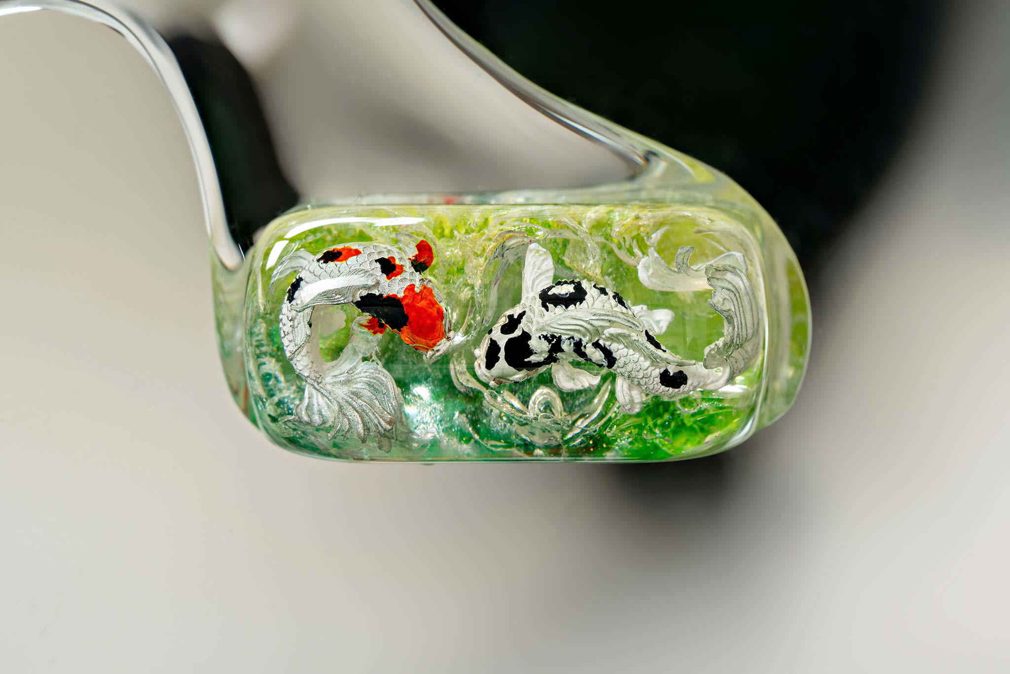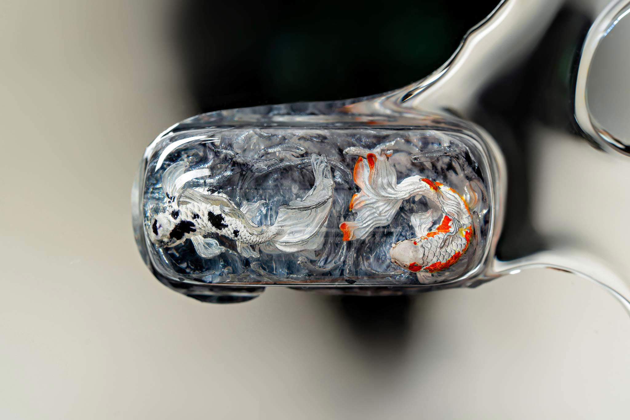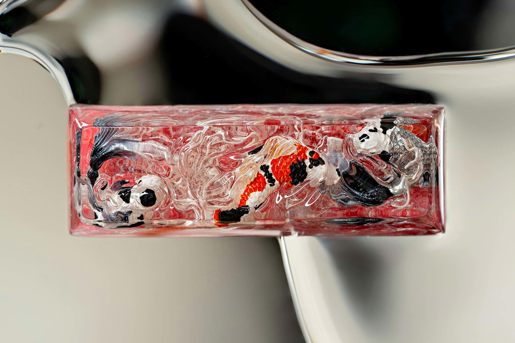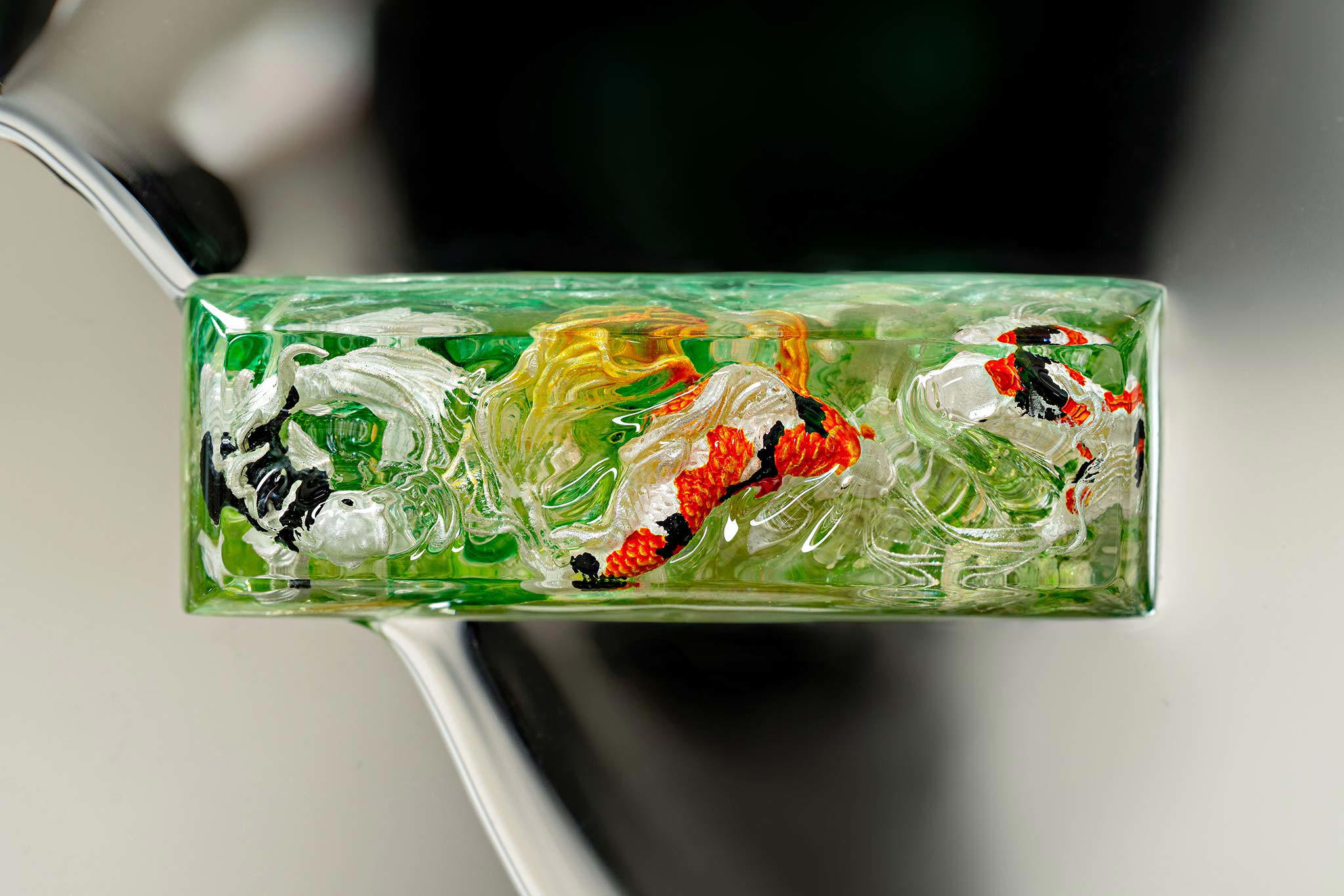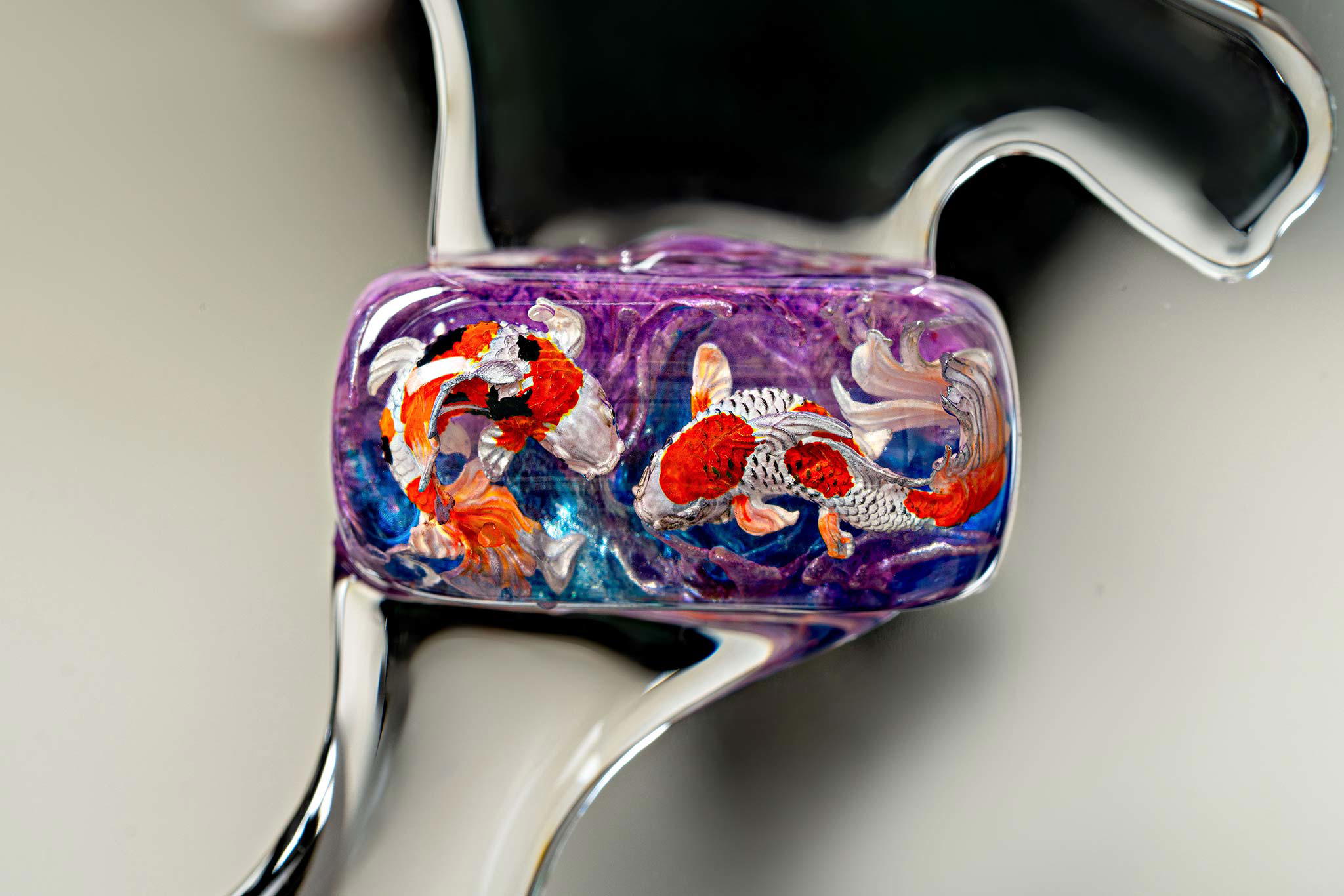 Polishing is always my favorite part. Holding each keycap, I sand the surface through four different grits, then polish with three special creams. This process requires precision down to the millimeter, especially for the parts where Koi fish rise above the water. I want users to feel the crystal-clear water surrounding the fish, both protecting the artwork and creating an authentic sensation as if a miniature ocean lies beneath their fingertips.