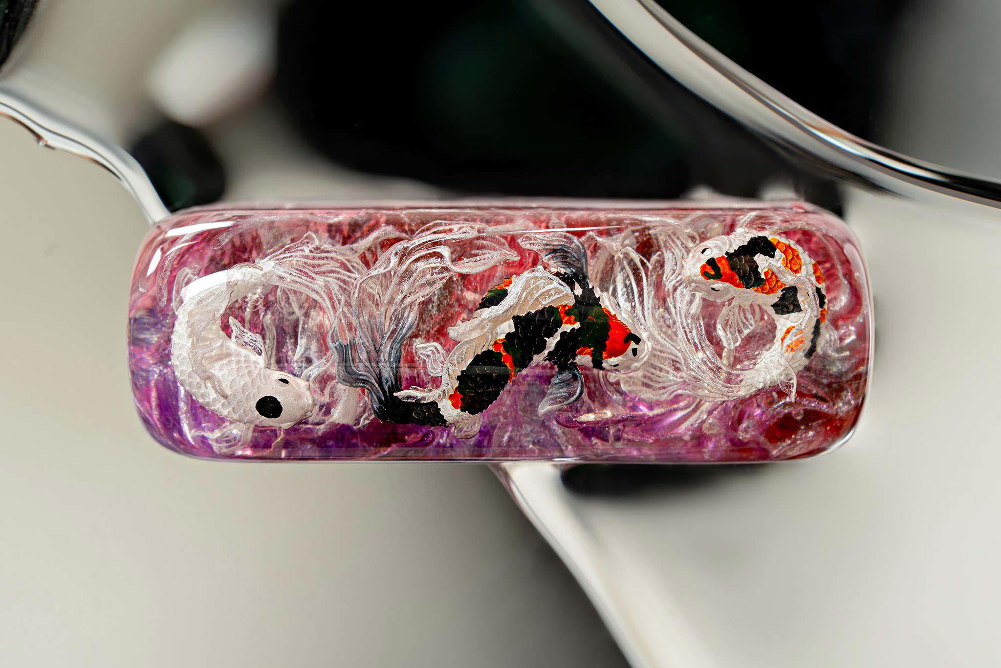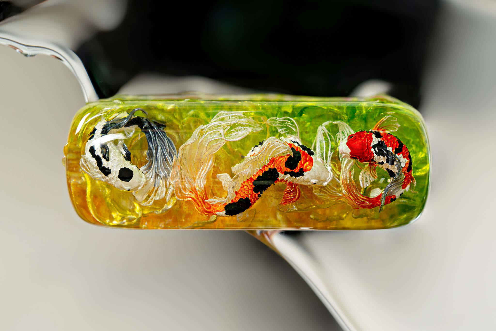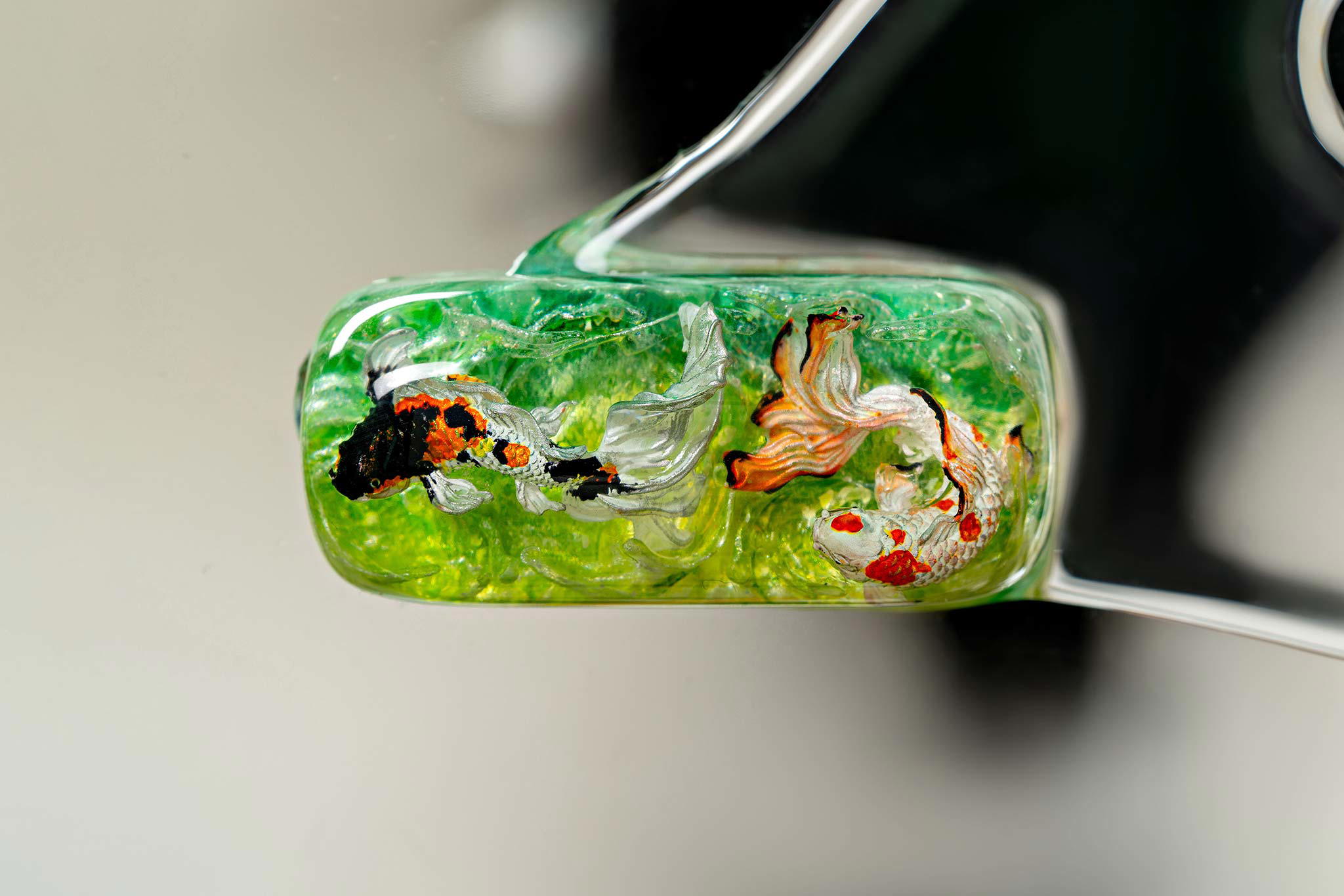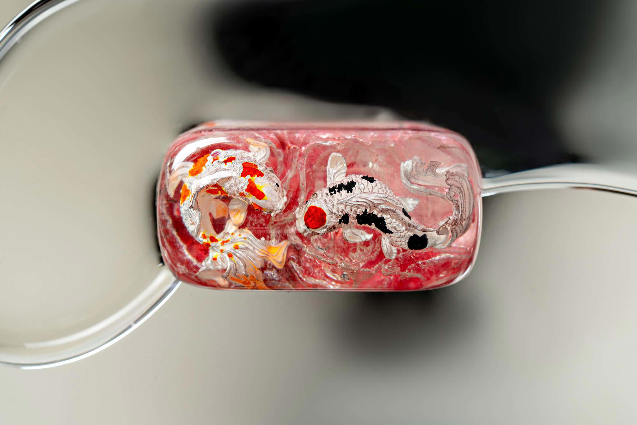 Polishing is always my favorite part. Holding each keycap, I sand the surface through four different grits, then polish with three special creams. This process requires precision down to the millimeter, especially for the parts where Koi fish rise above the water. I want users to feel the crystal-clear water surrounding the fish, both protecting the artwork and creating an authentic sensation as if a miniature ocean lies beneath their fingertips.