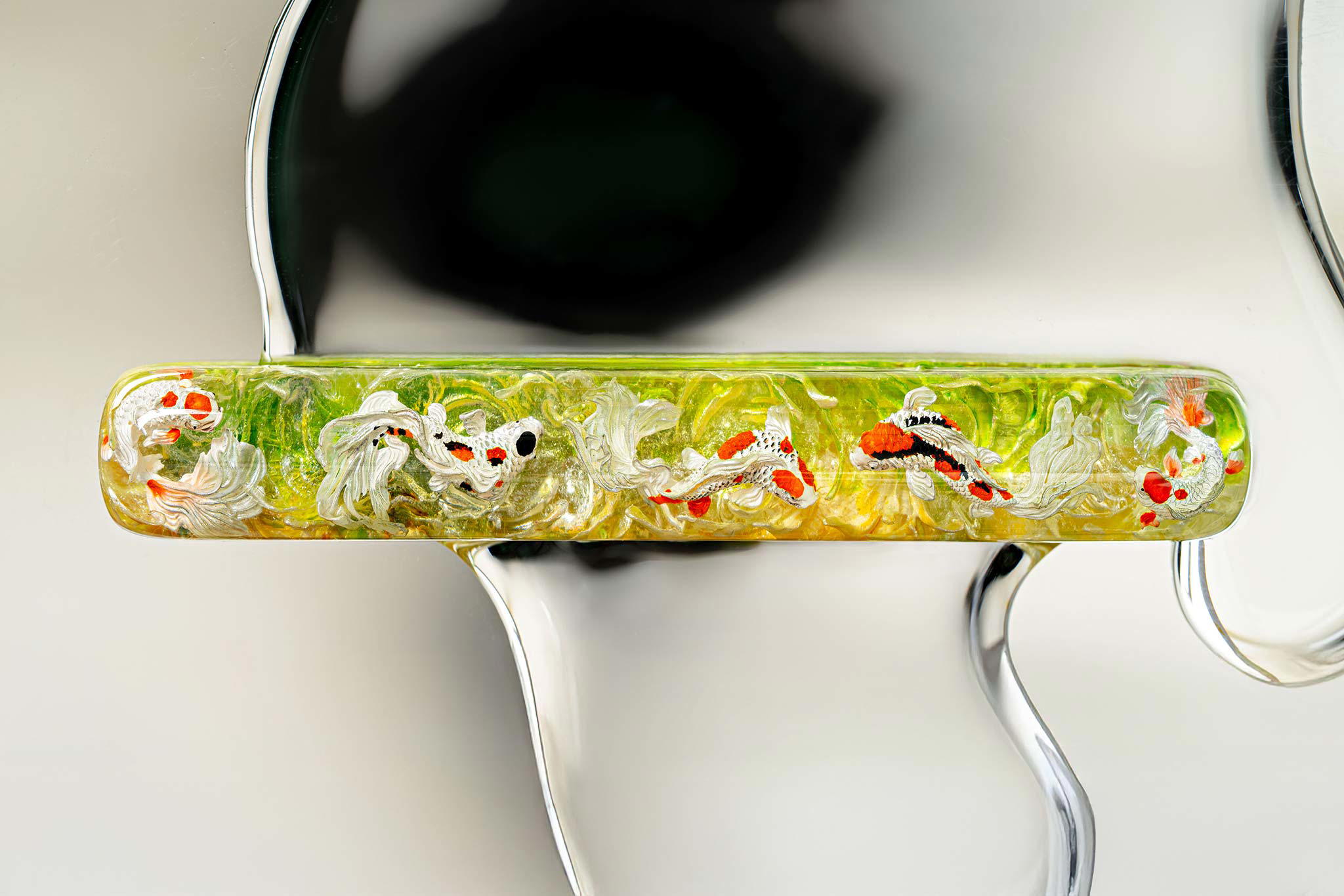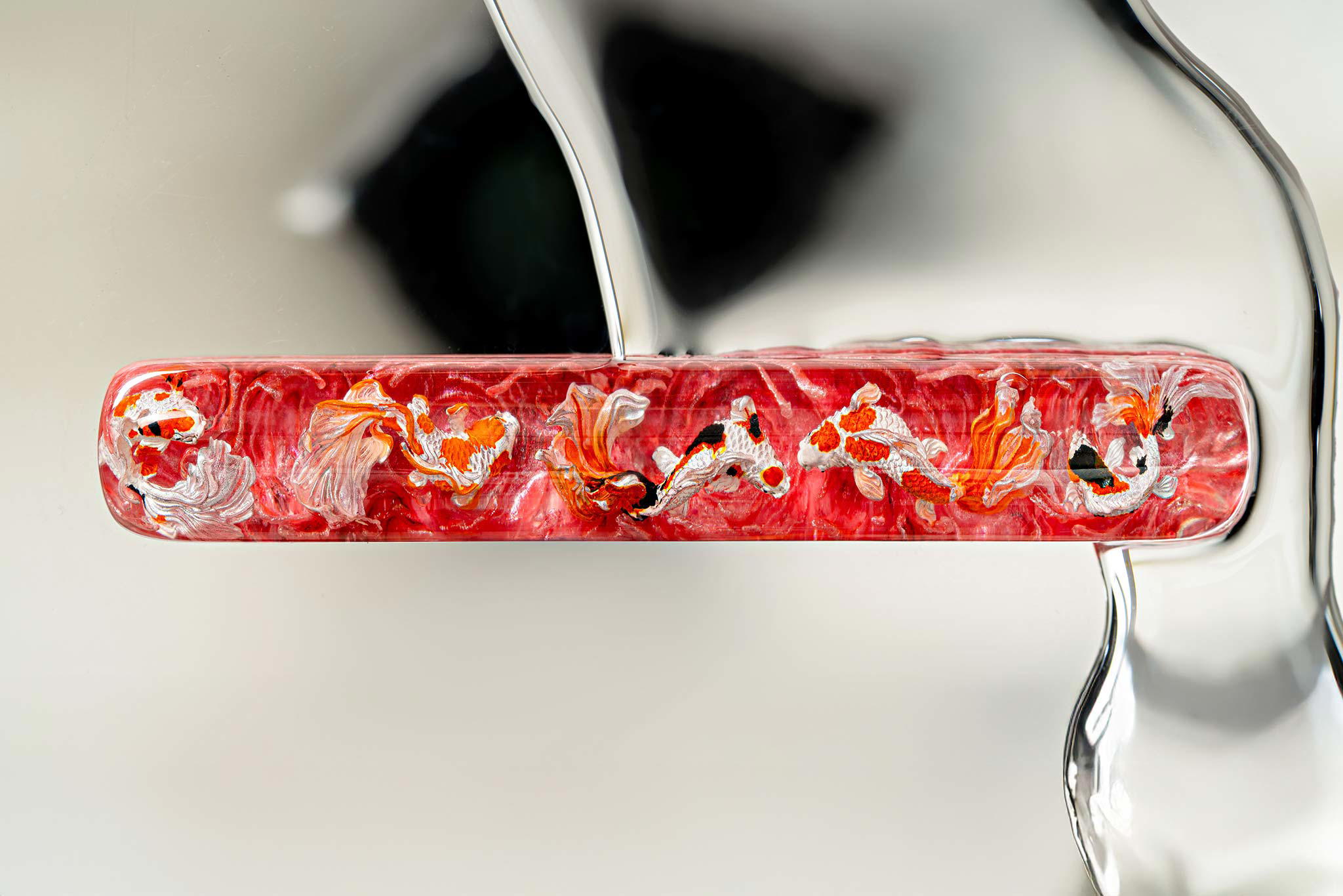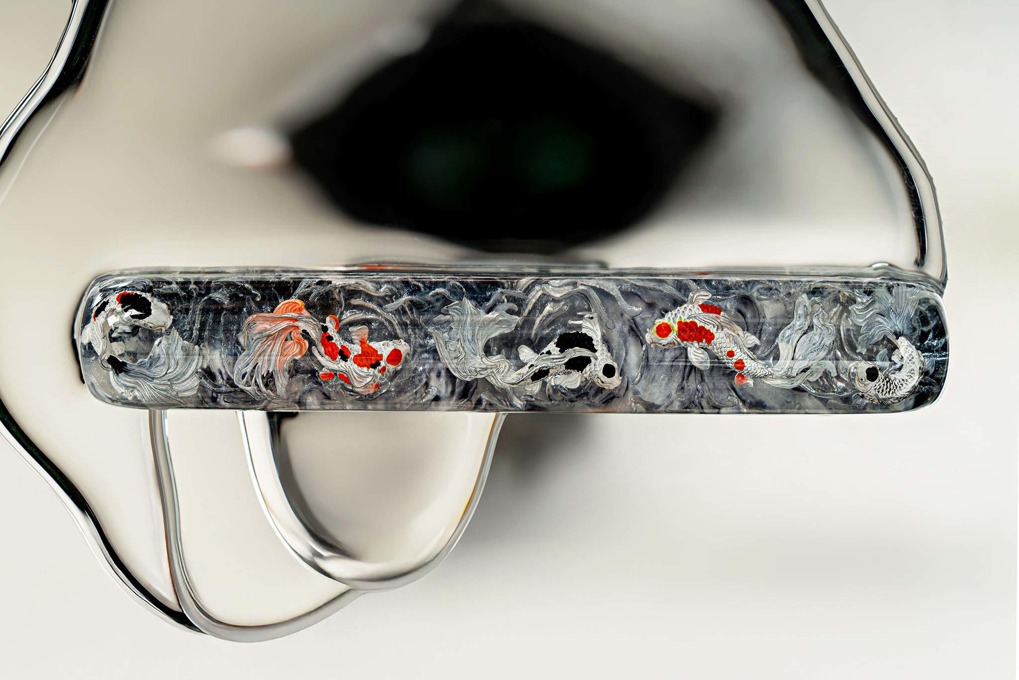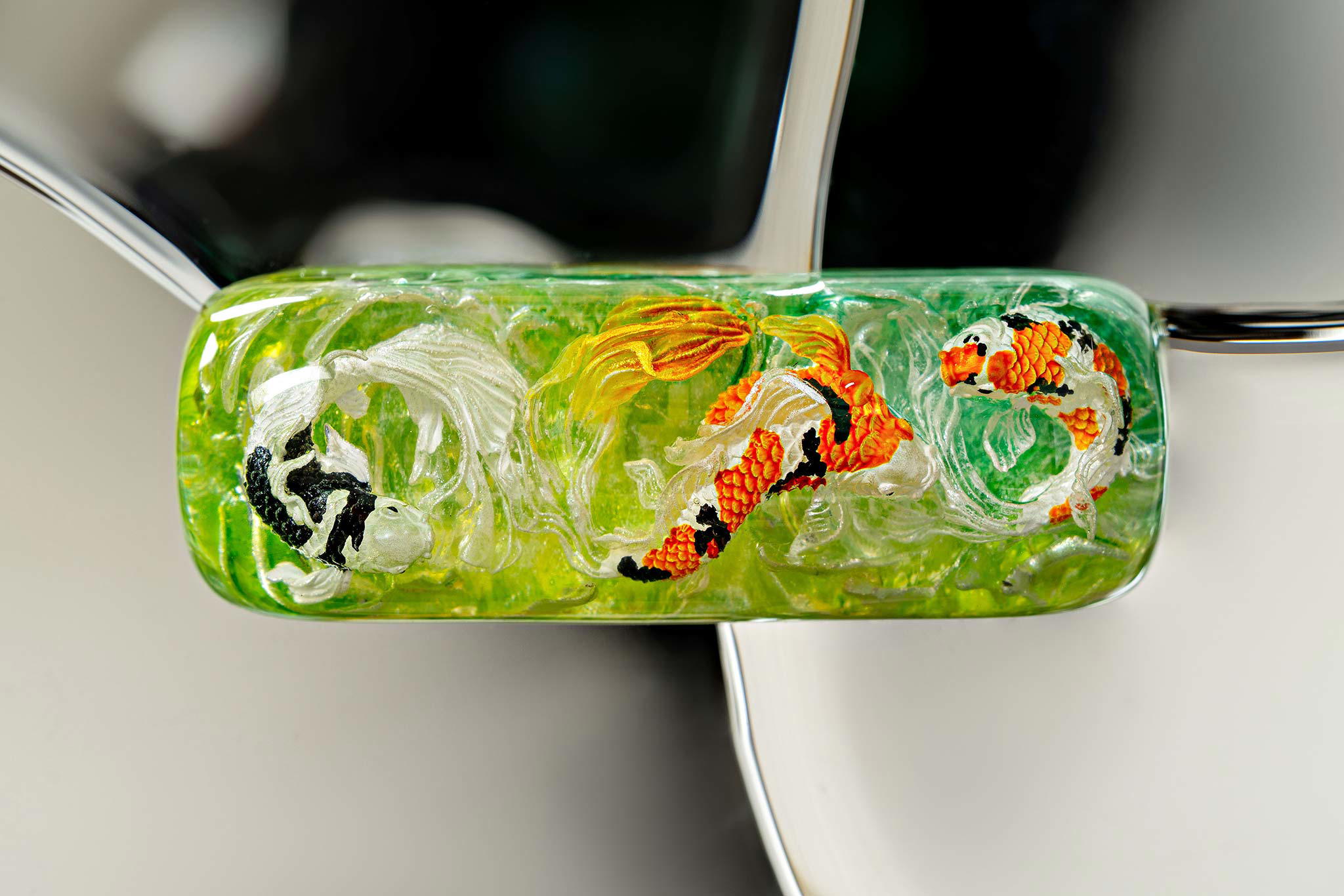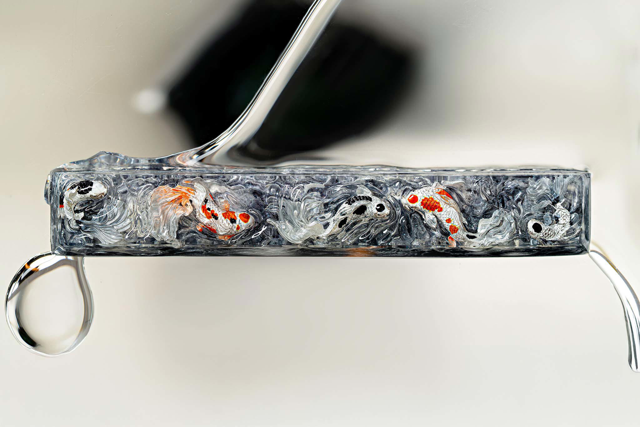 Polishing is always my favorite part. Holding each keycap, I sand the surface through four different grits, then polish with three special creams. This process requires precision down to the millimeter, especially for the parts where Koi fish rise above the water. I want users to feel the crystal-clear water surrounding the fish, both protecting the artwork and creating an authentic sensation as if a miniature ocean lies beneath their fingertips.