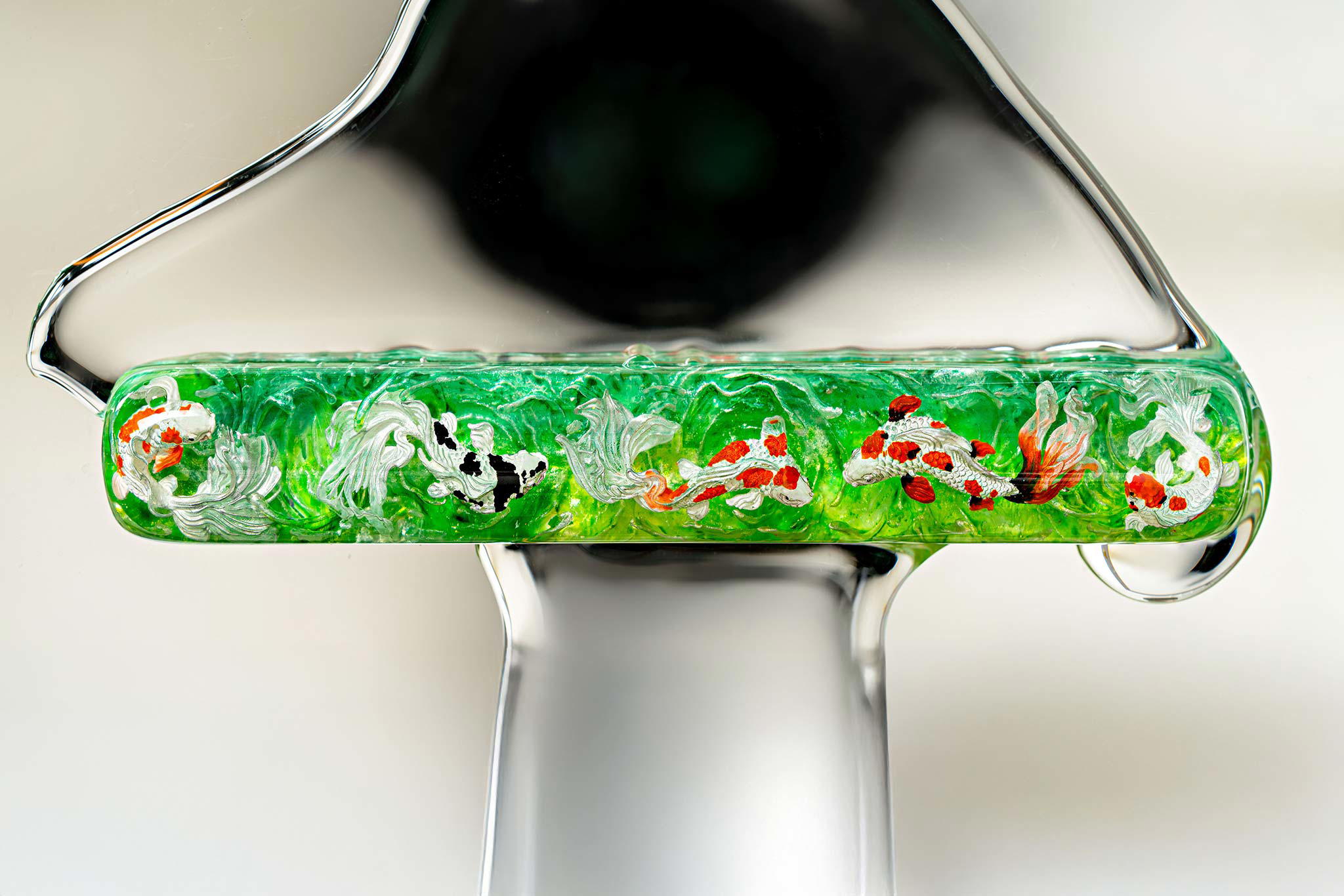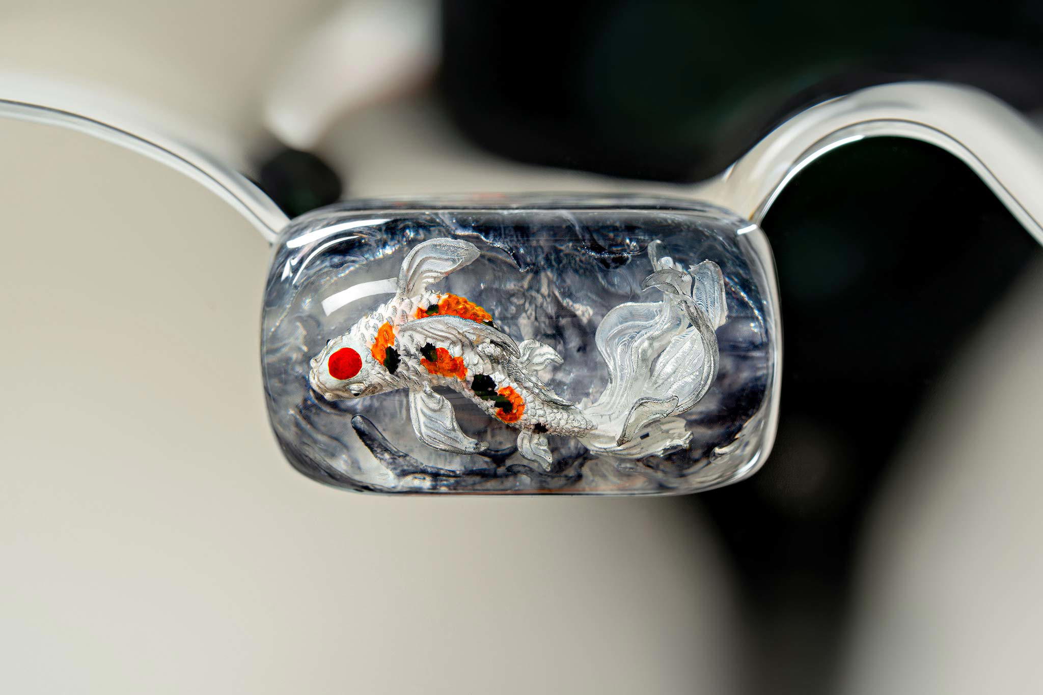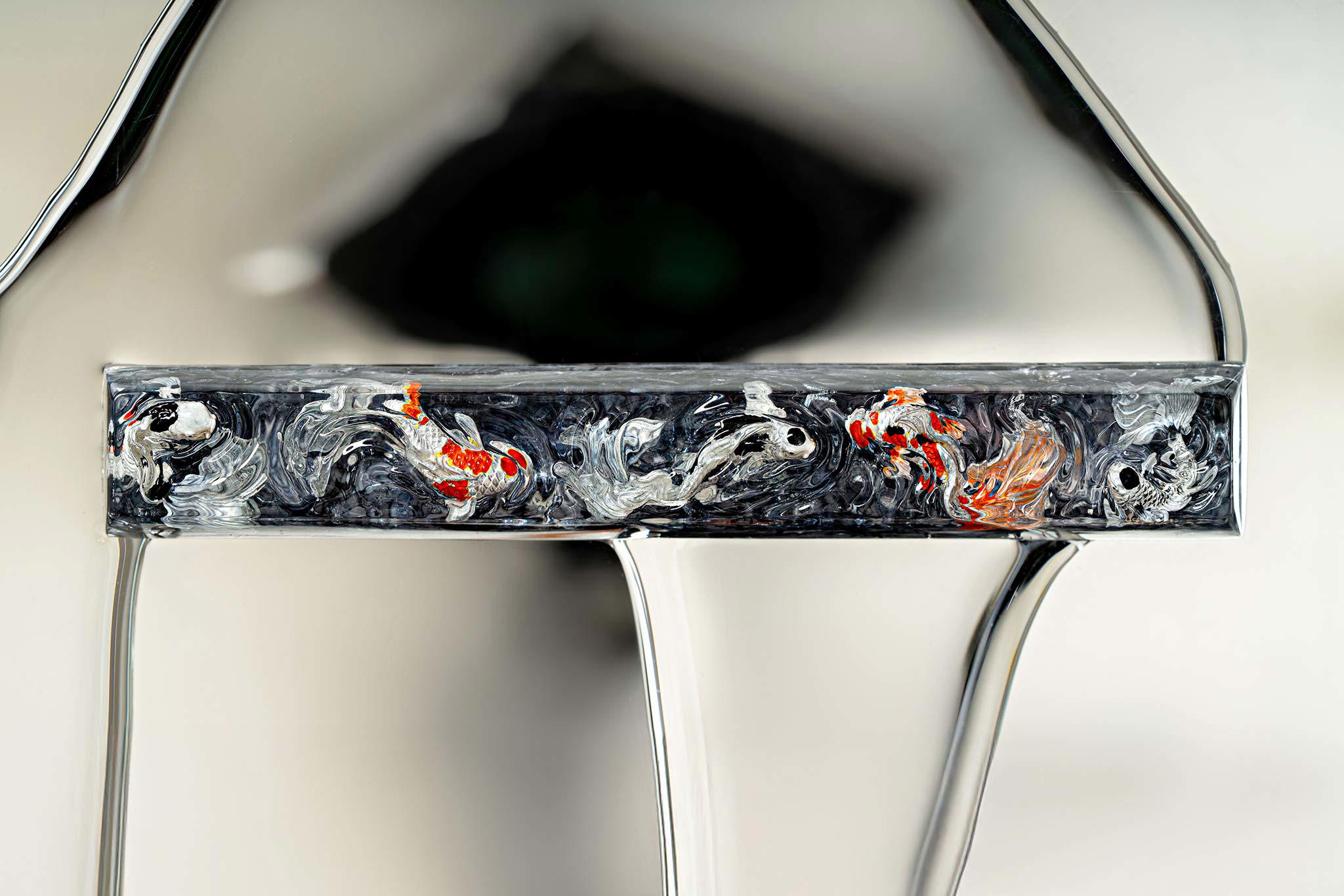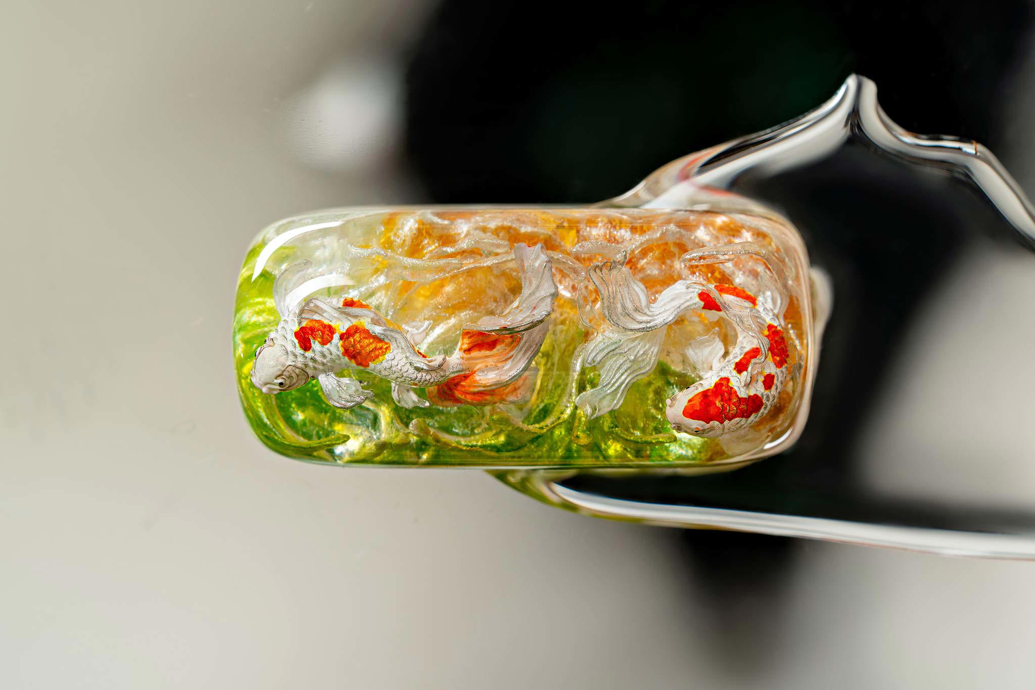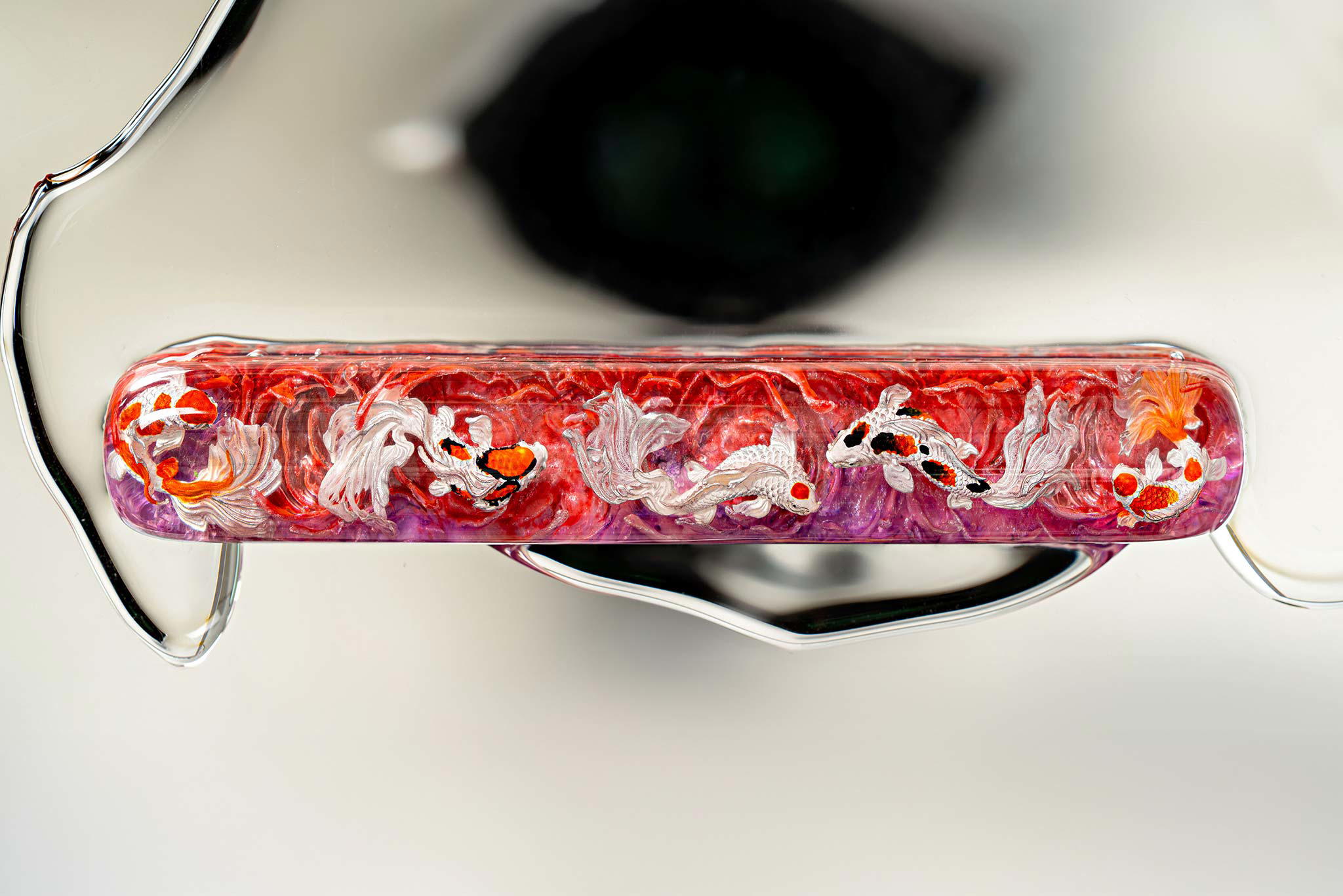 Polishing is always my favorite part. Holding each keycap, I sand the surface through four different grits, then polish with three special creams. This process requires precision down to the millimeter, especially for the parts where Koi fish rise above the water. I want users to feel the crystal-clear water surrounding the fish, both protecting the artwork and creating an authentic sensation as if a miniature ocean lies beneath their fingertips.