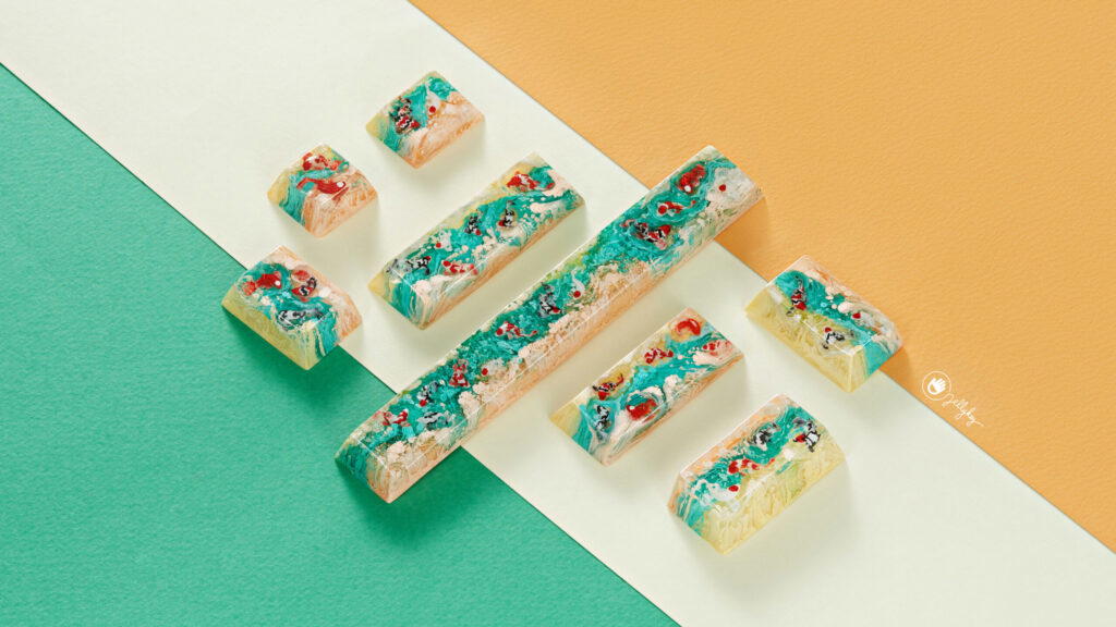 With over 85 keycaps and 250 varieties of Koi fish in this collection, we need to be very careful in casting each fish. The casting method helps create a more graceful feel for the fish, whose tails also become longer and thinner. It takes around 16 hours for the fish casting to dry completely, which is longer than usual. We use a special type of resin to create delicate pieces. Unfortunately, we have to dispose of a lot of items in order to have the qualified fish with this method. But we are willing to take this risk to produce a perfect pool of Koi fish inside our keycaps.
