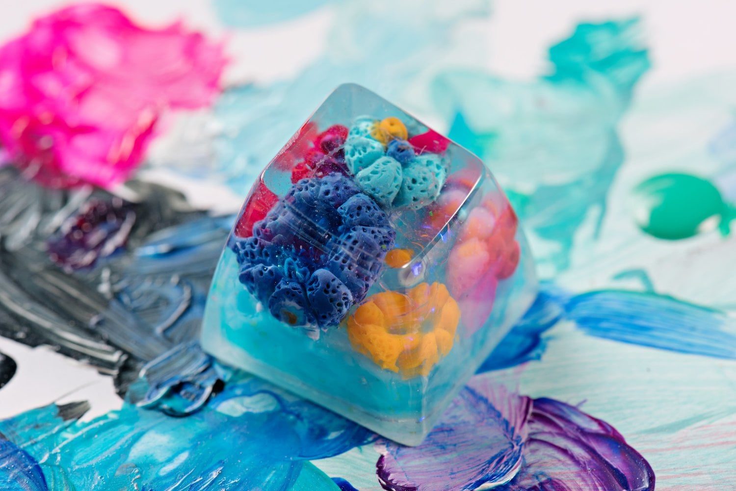World of Coral keycap was created with tool, clay, resin. There were no coral reef is harmed during the process of making the keycaps.