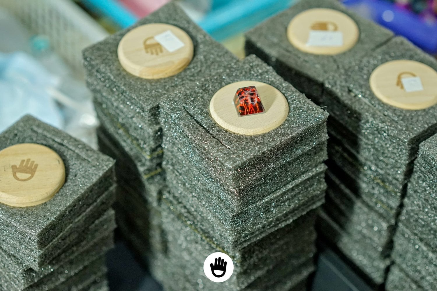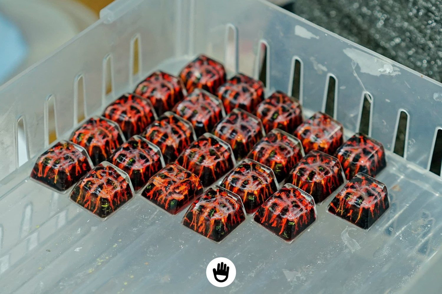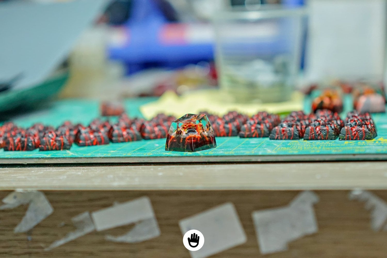 Another process teased them even harder – Inferno smokes making. This is the deadliest part, if this step failed, a keycap would become a breakdown keycap. The reason is: Smoke is made by a transparent and a white liquid, slightly mixed until they would turn out a still transparent liquid but with white streams, after that, the solid part will be added into the mold with that liquid, an opaque liquid would spoil the design criterion, we wouldn’t be able to see the smoke floats in a clear space with that opaque liquid. This took lots of careful hand stirring and high perceive. That’s what particular of artifact crafting, there’s no two identical methods for two distinct artisan products. Only same requirement, every keycap has to be met the quality of the design, strictly, deadly. Hopefully that you can tell how tenacious we had to be when crafting our products.