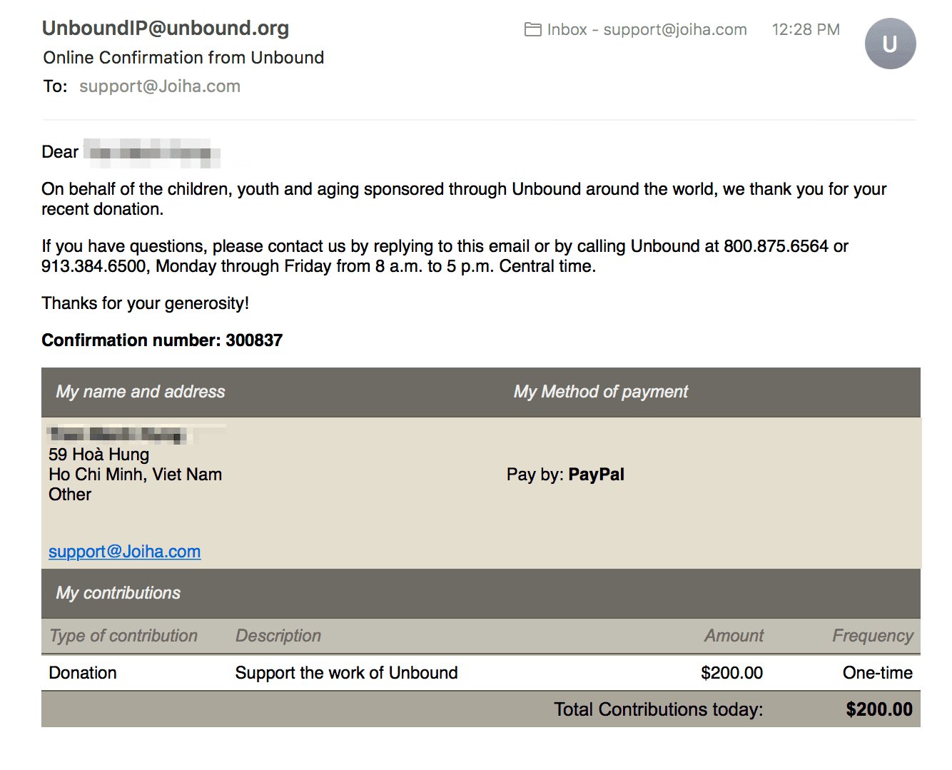 - $200 goes to Unbound for sponsoring children and families who live in poverty.
