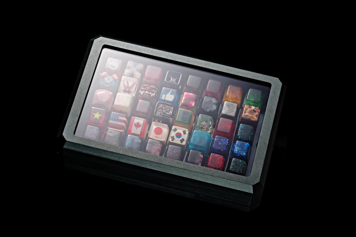 This box is made by CNC’ing two blocks of solid aluminium and then pieced together. The viewing window is made out of clear glass, which allows you to see your precious artisans inside. The surface of the box is processed with anodization.